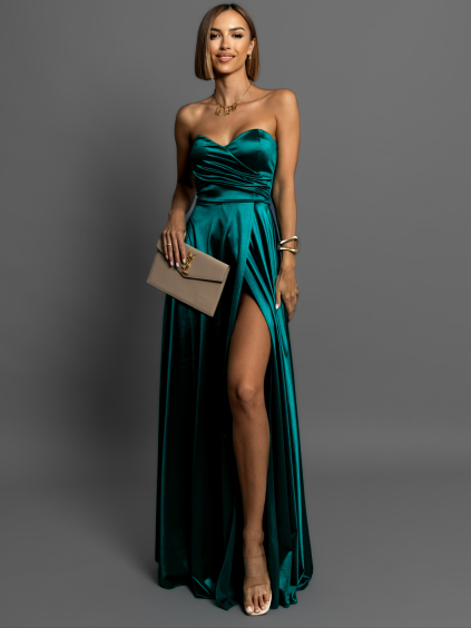 Smaragdové saténové spoločenské šaty SYCHAEUS bez ramienok