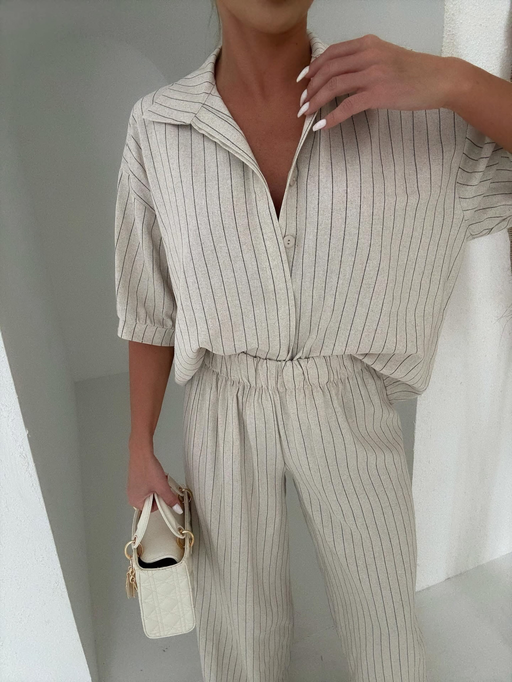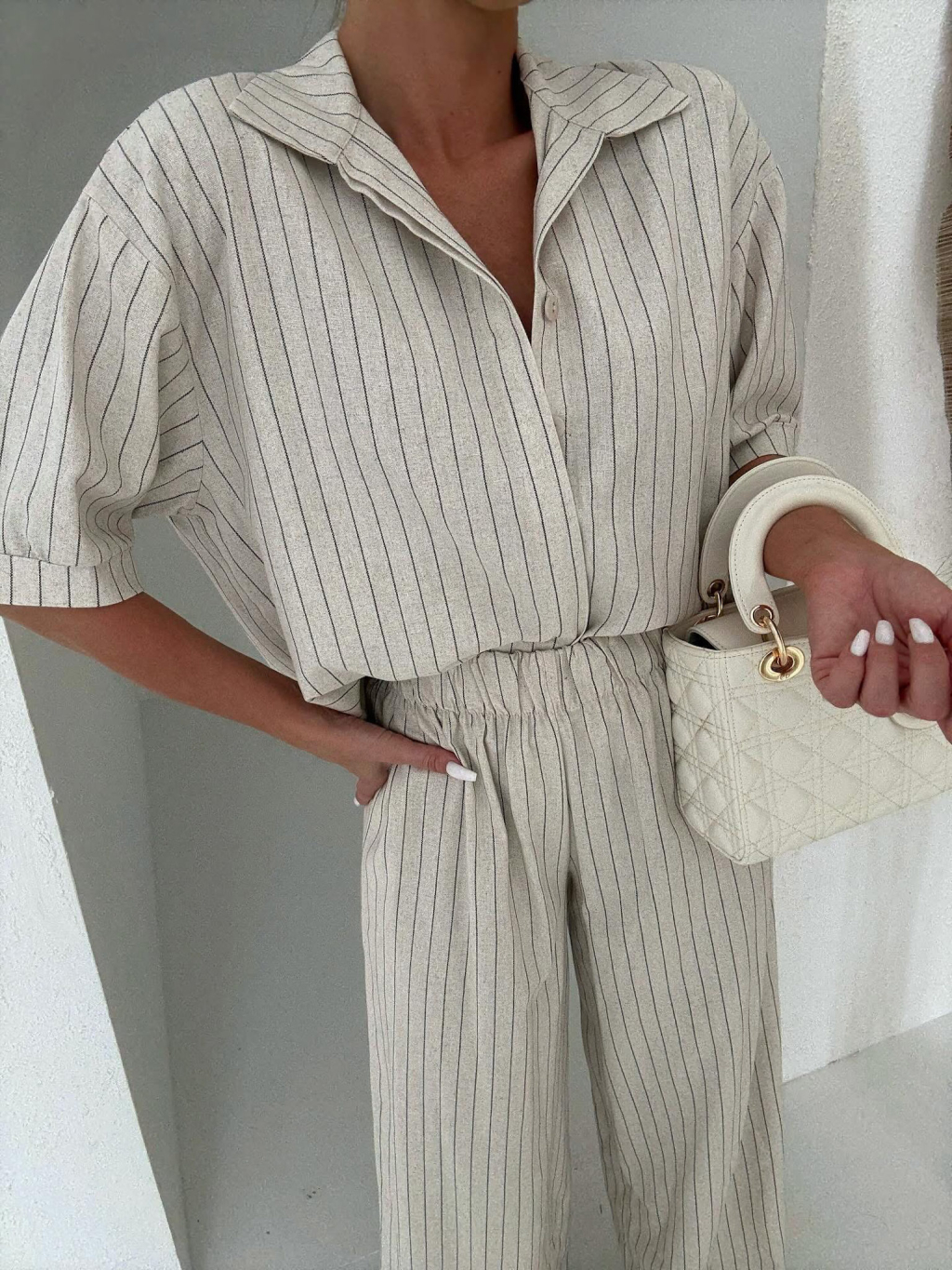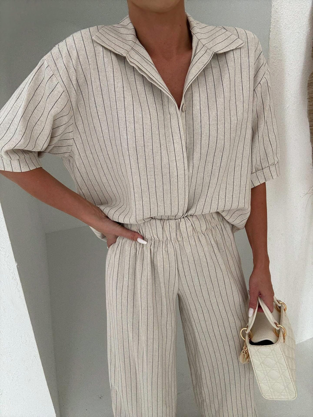 Béžový pruhovaný ľanový dlhý nohavicový komplet VELIOR