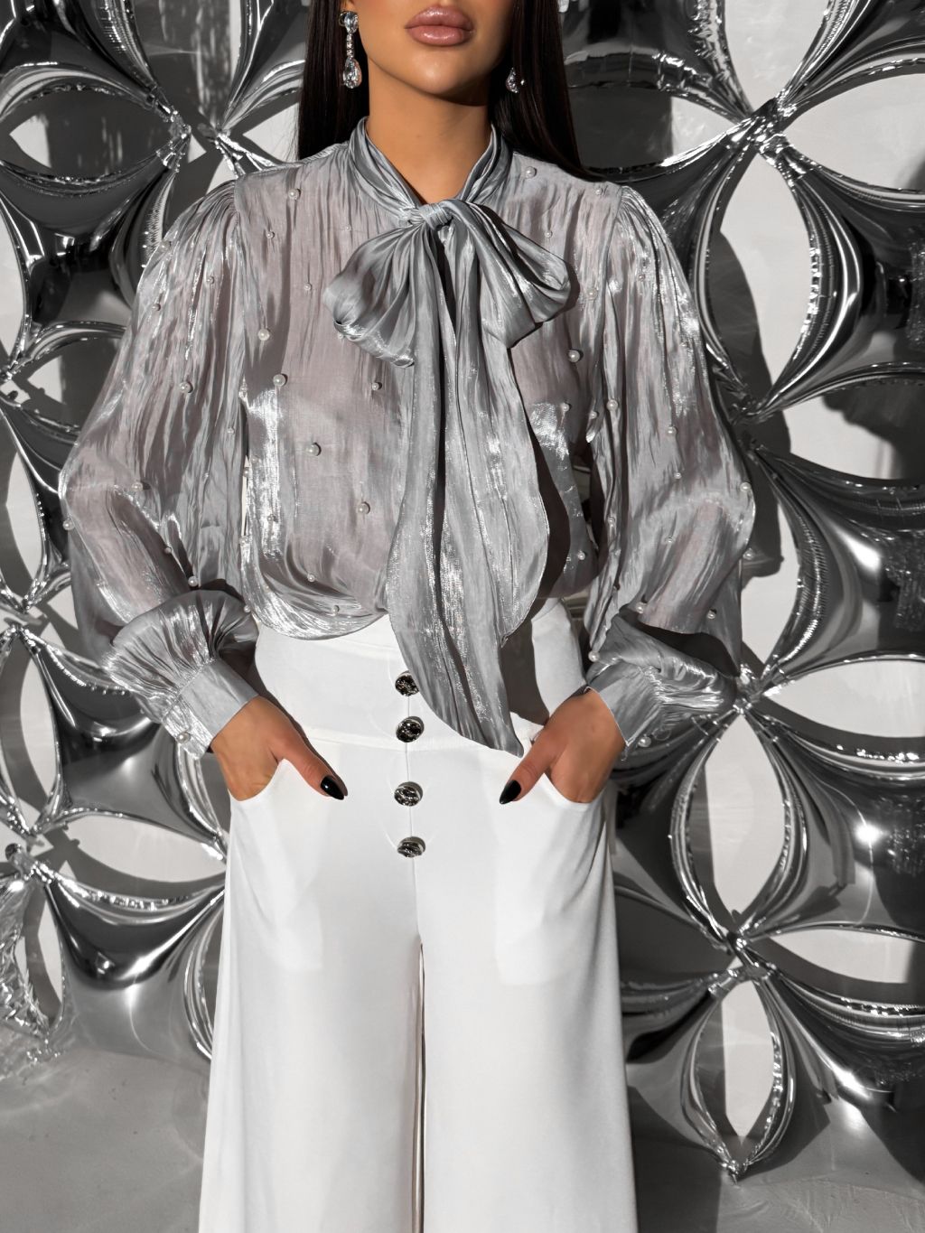 Šedá elegantná blúzka SOLITHRA s perlami