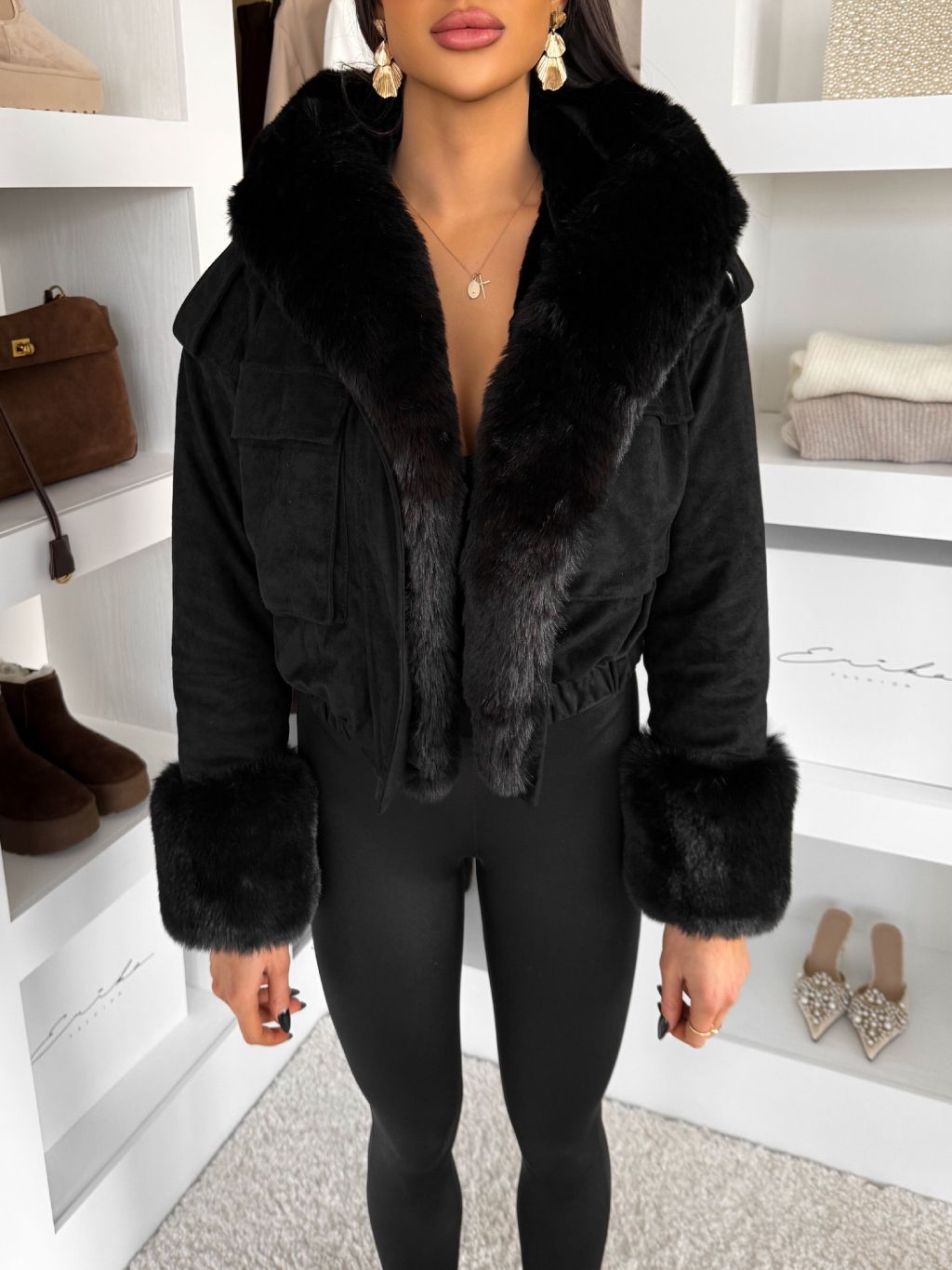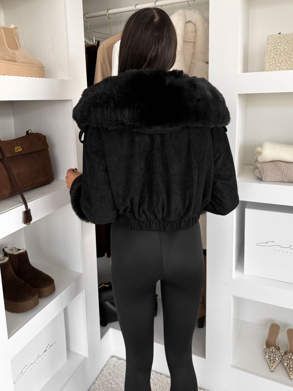 Čierna štýlová krátka bunda HEXUMI s kožúškom