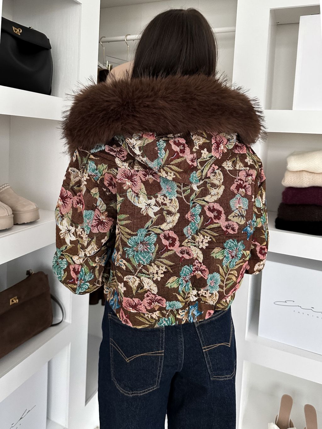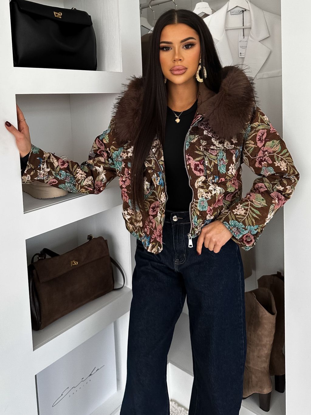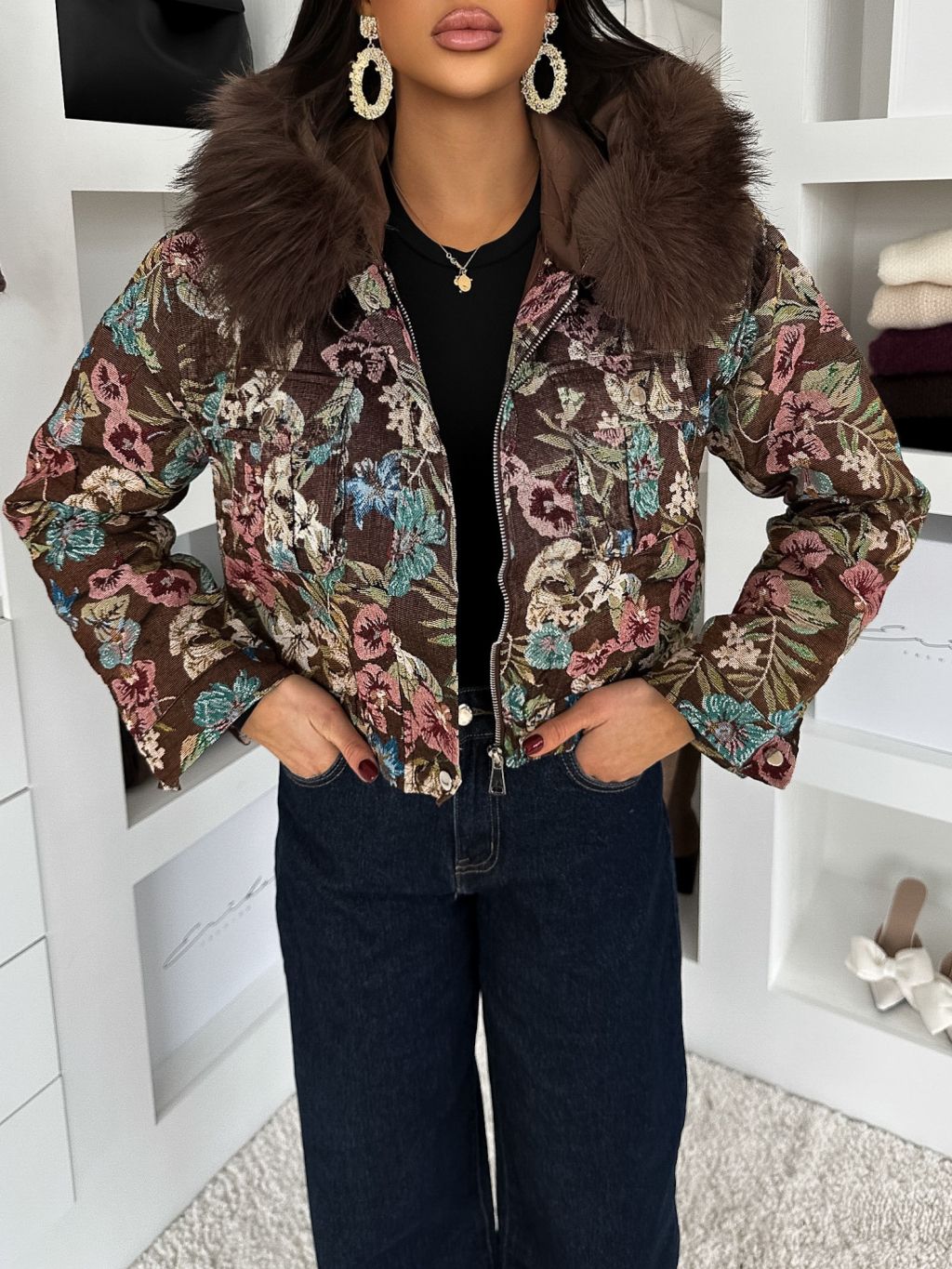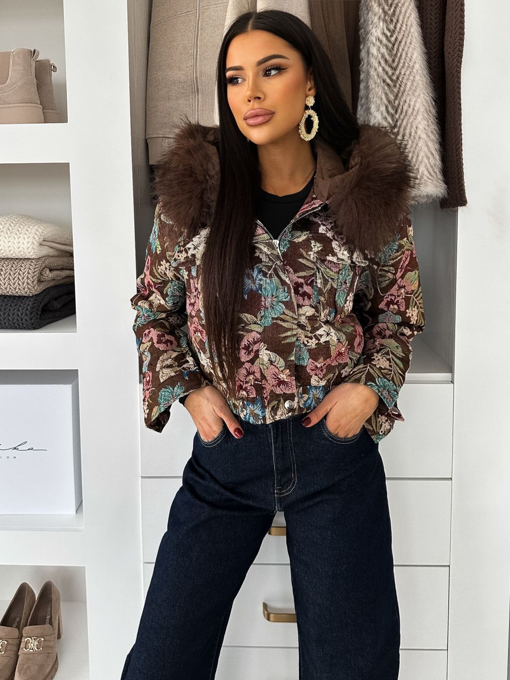 Hnedá elegantná bunda MORIVEN s veľkými kvetmi