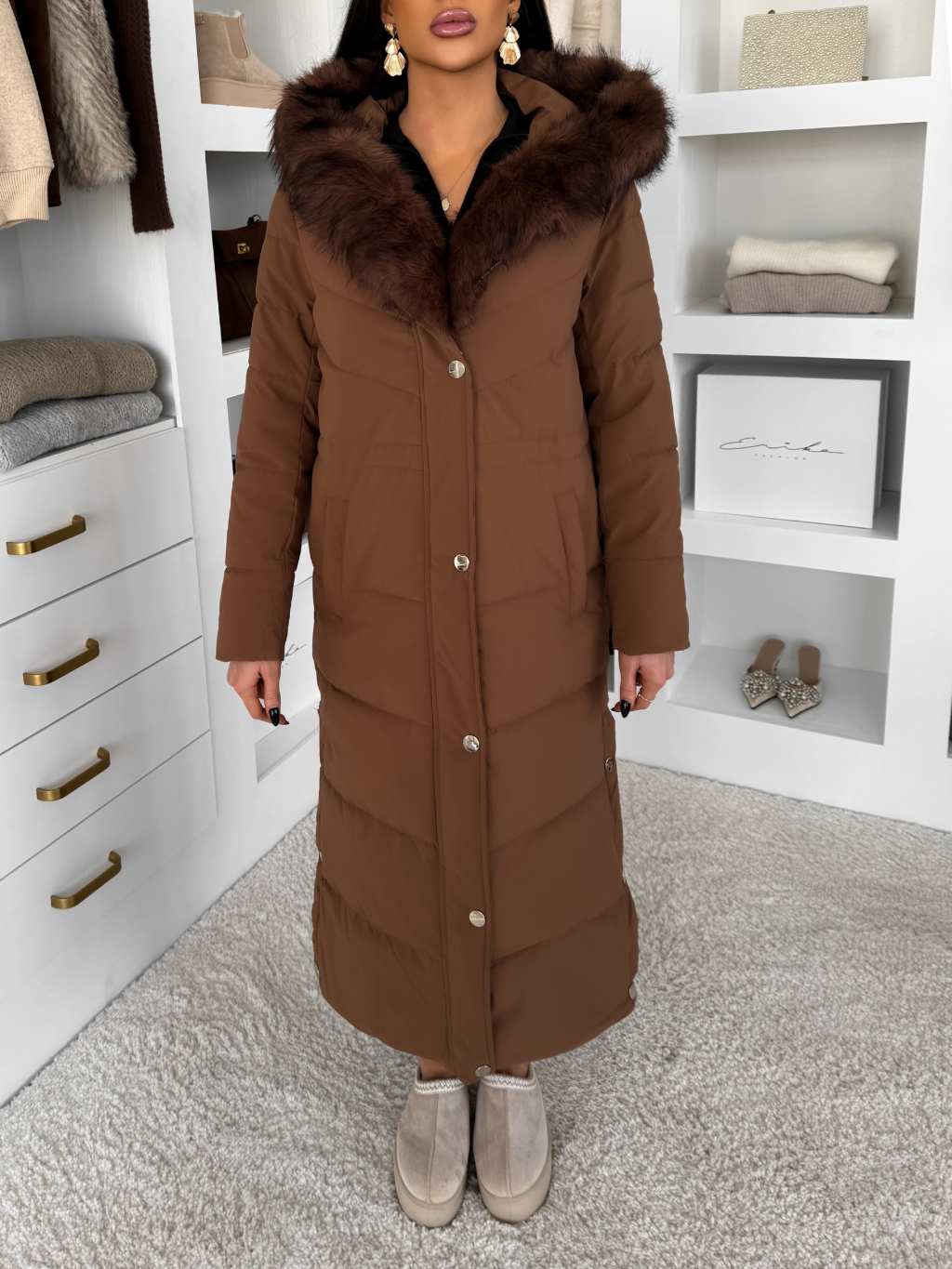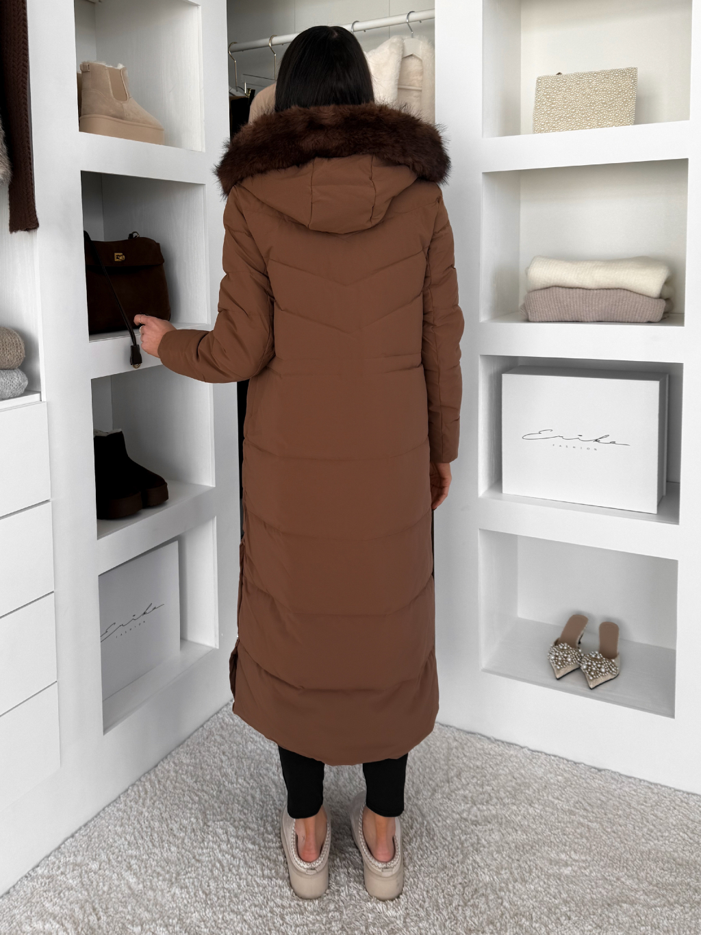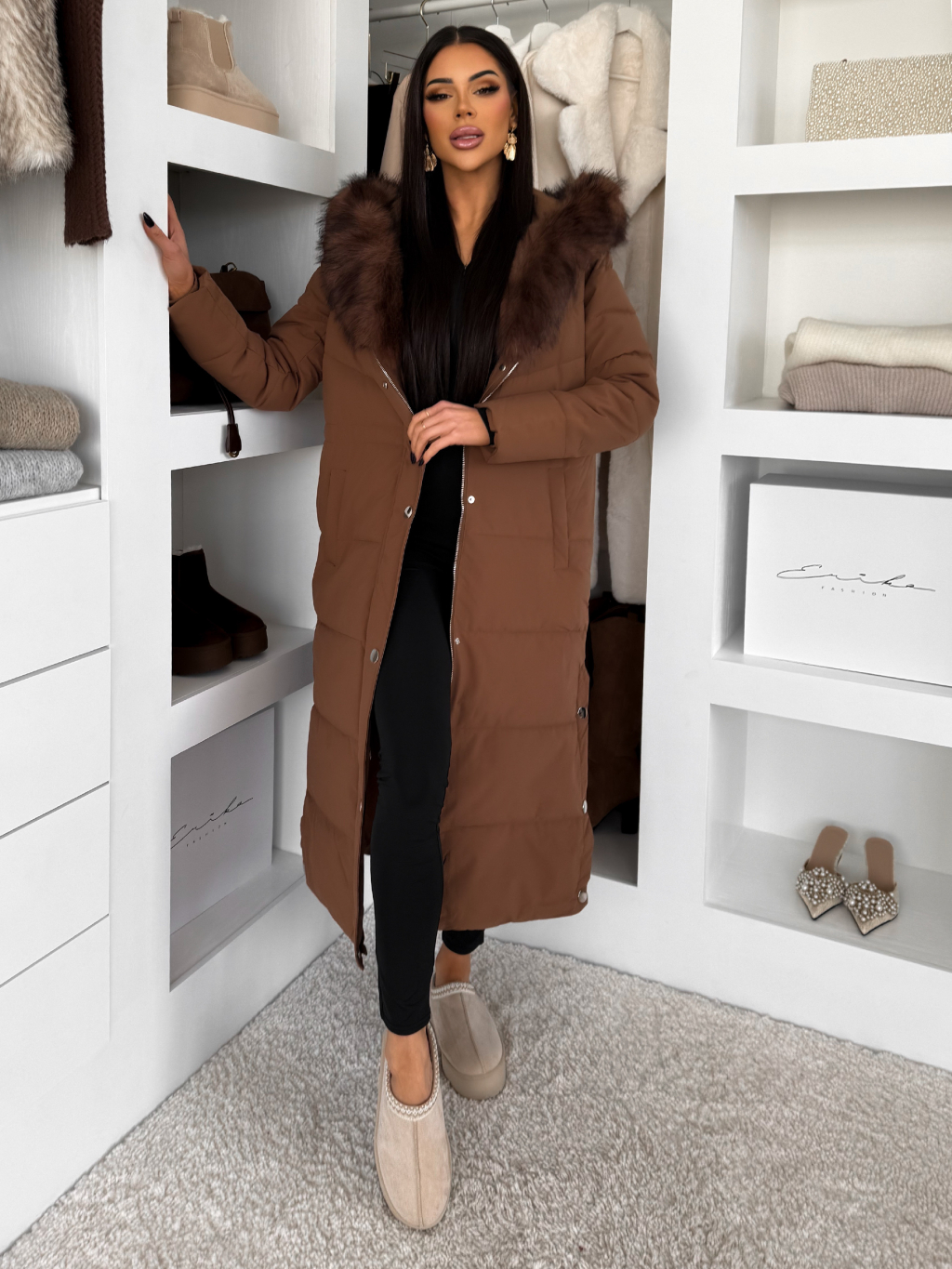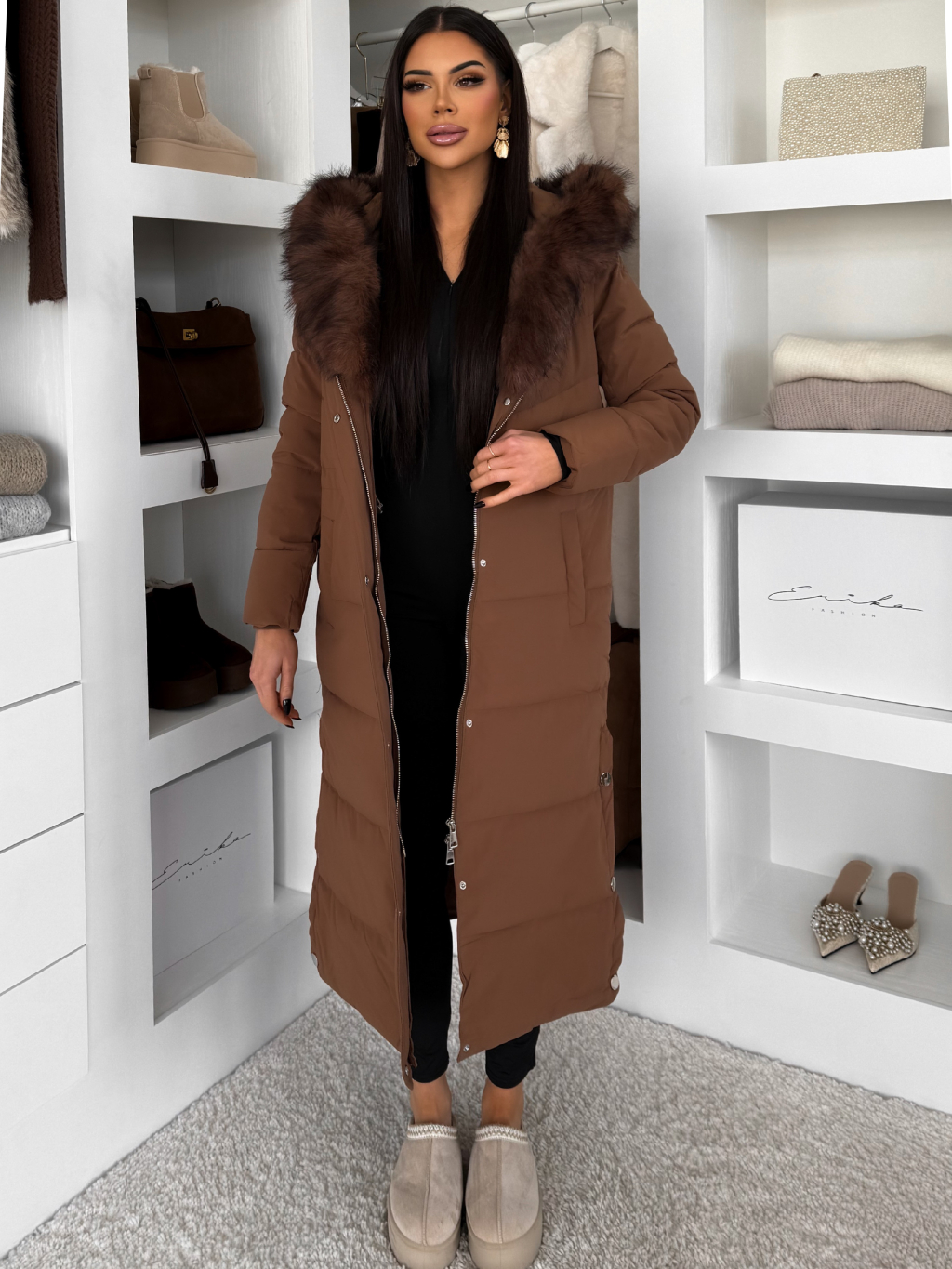 Hnedý dlhý zimný kabát bunda LUMIYA