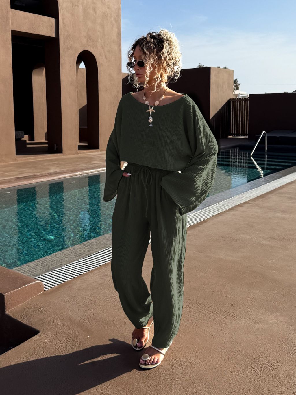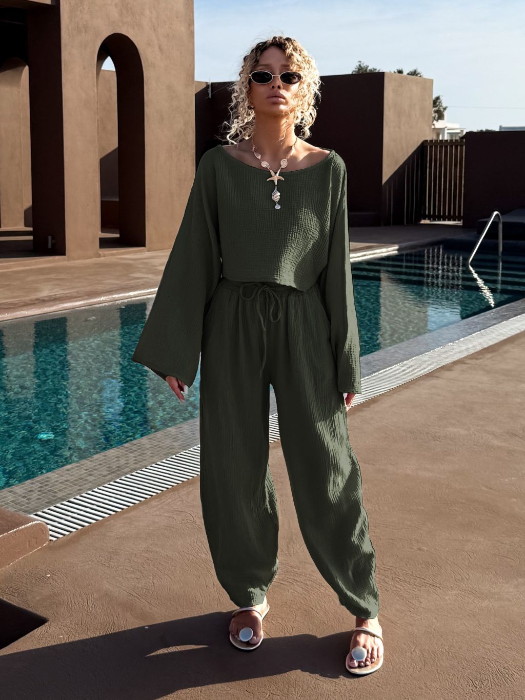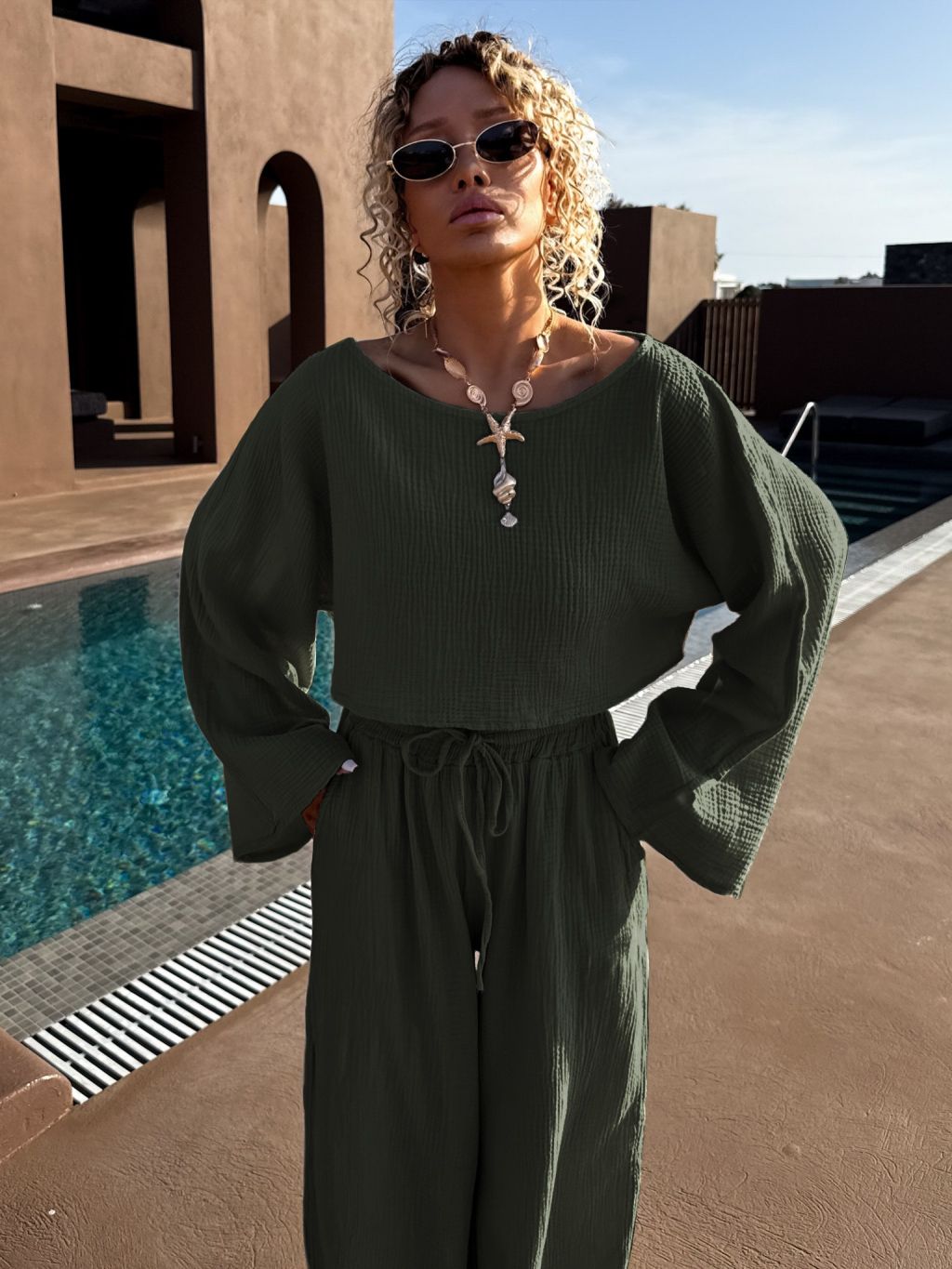 Kaki mušelínový crop top VHAGAR s dlhým rukávom