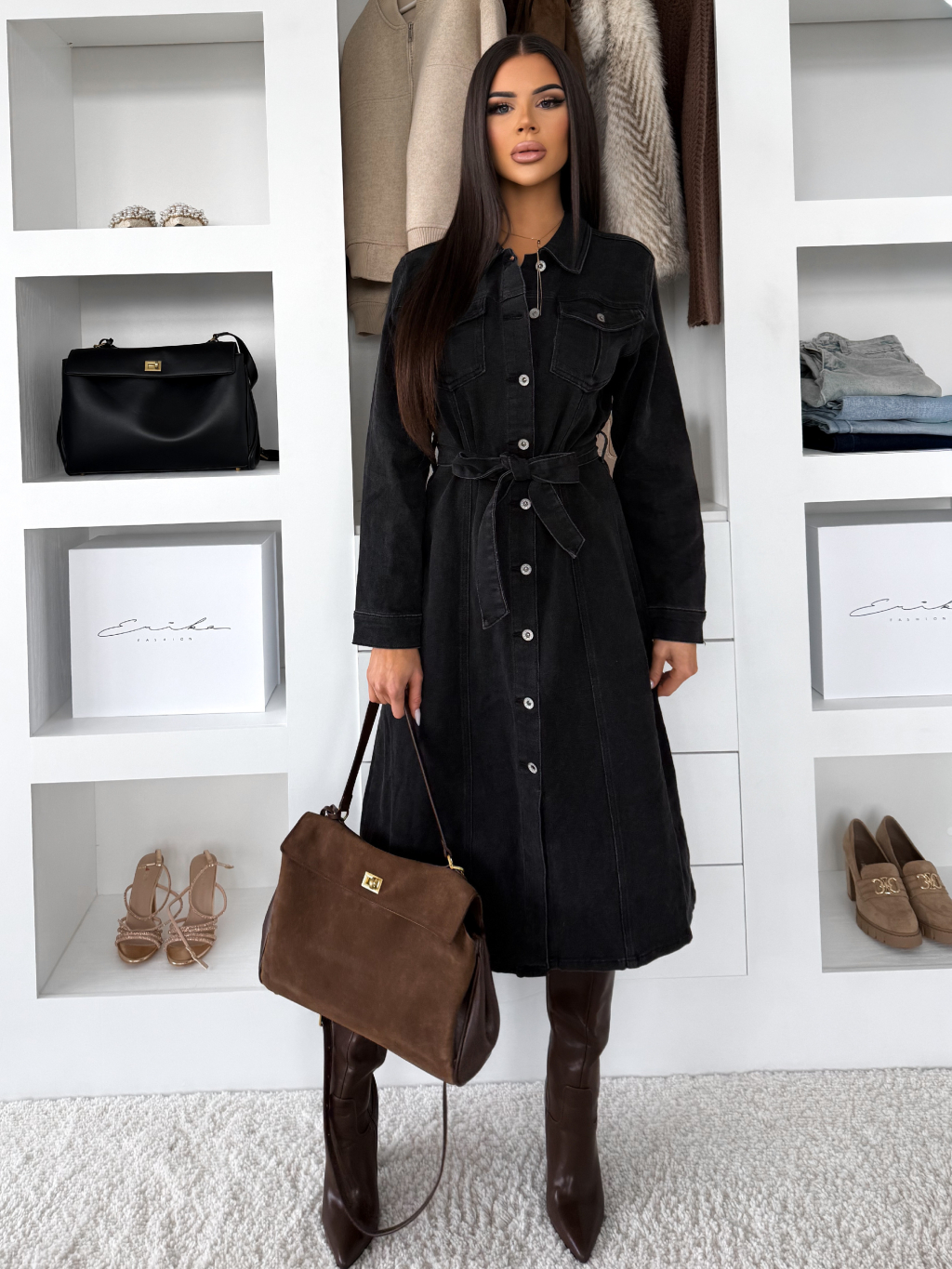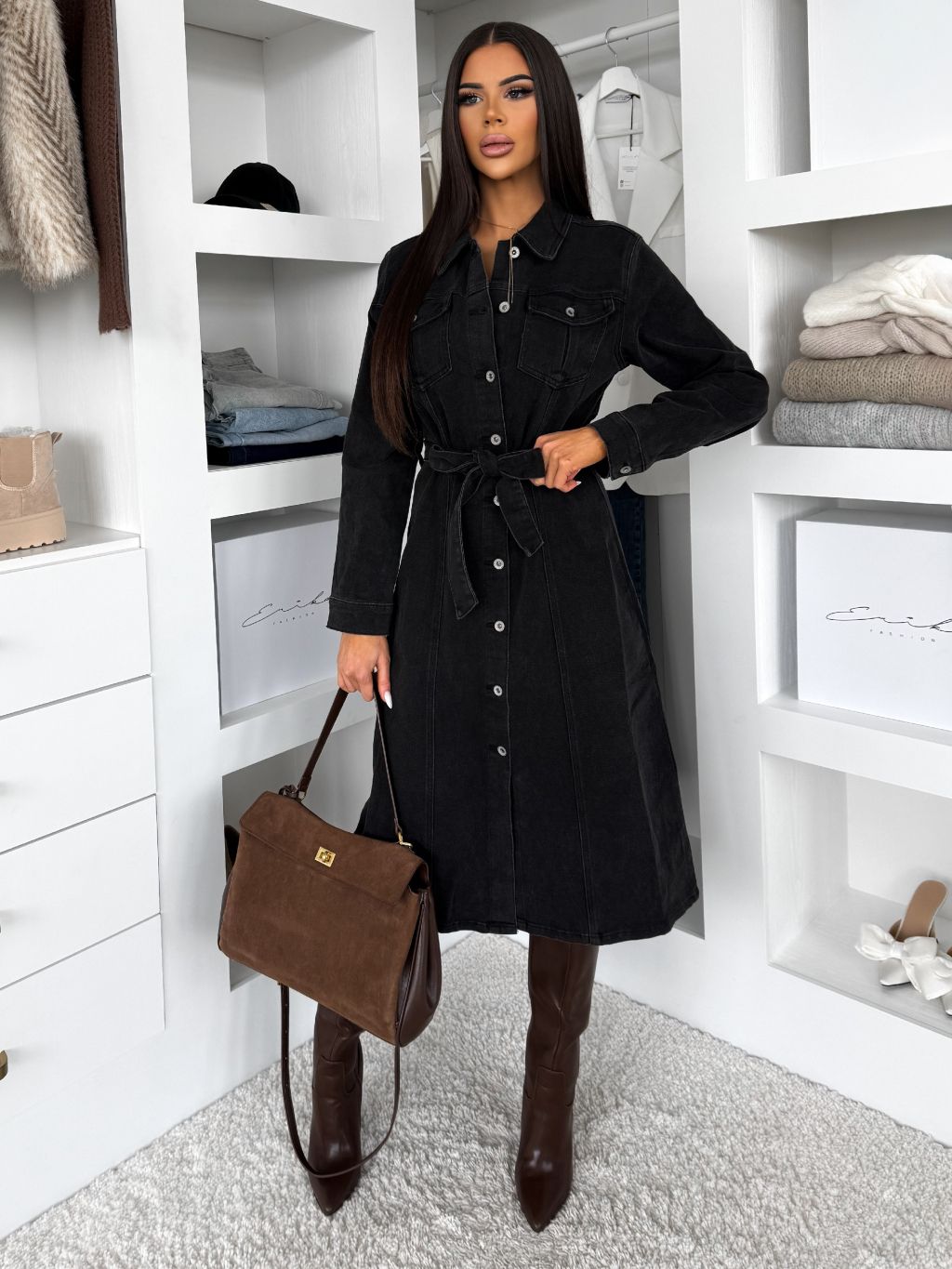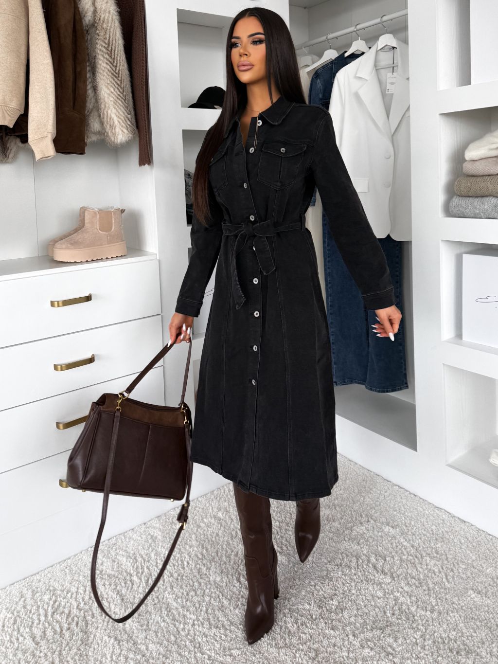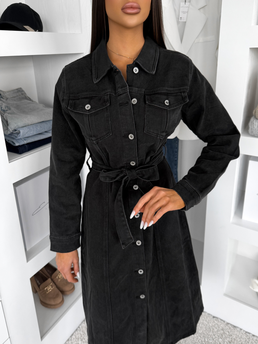 Čierne džínsové midi šaty HERTOZ s dlhým rukávom