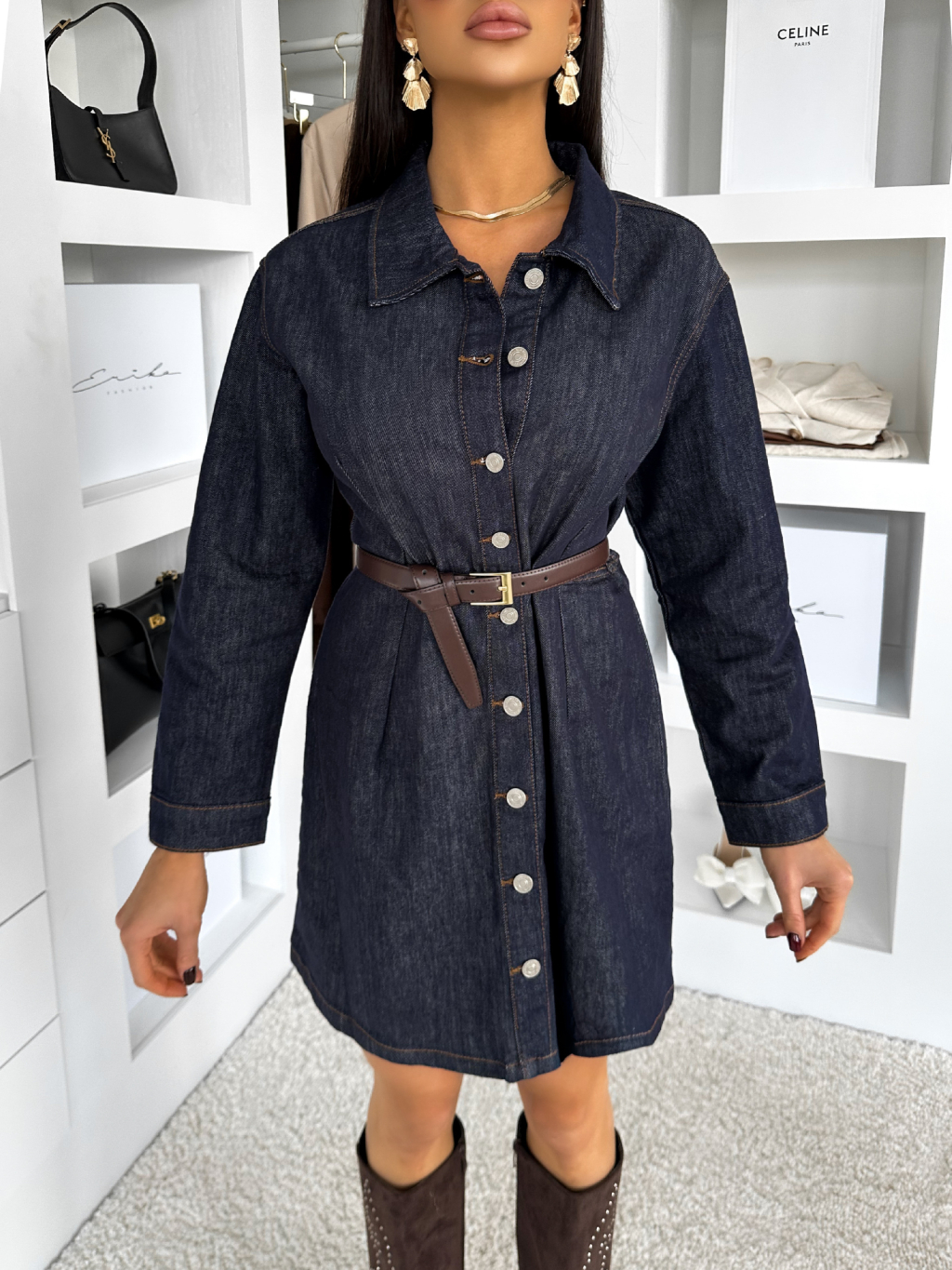 Tmavomodré džínsové krátke šaty CRYSTAL s dlhým rukávom