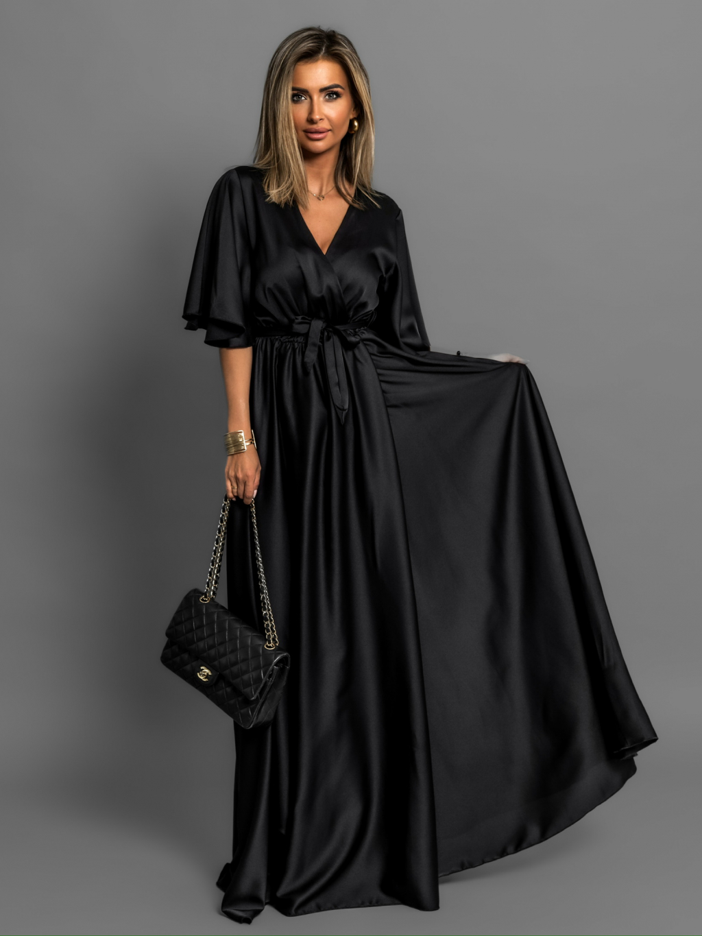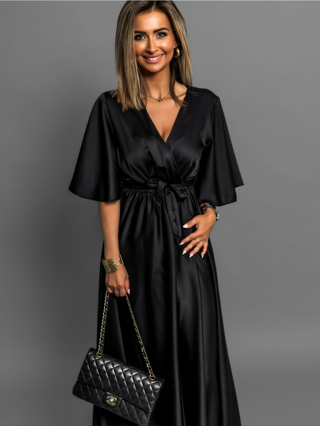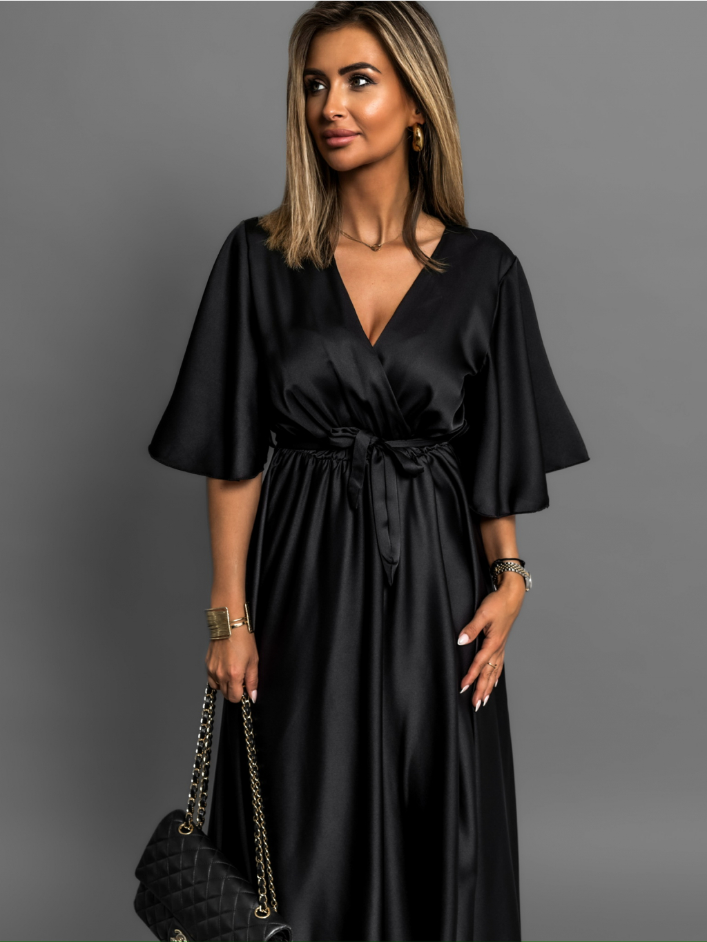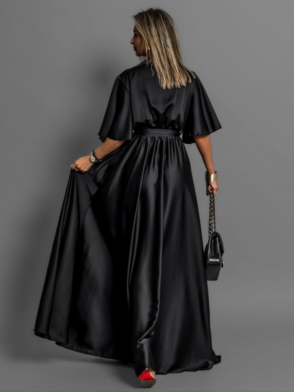 Čierne saténové dlhé šaty GO HOME s krátkym rukávom