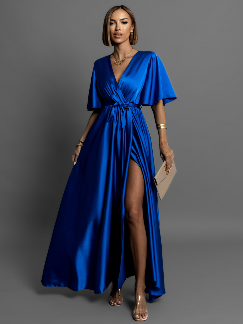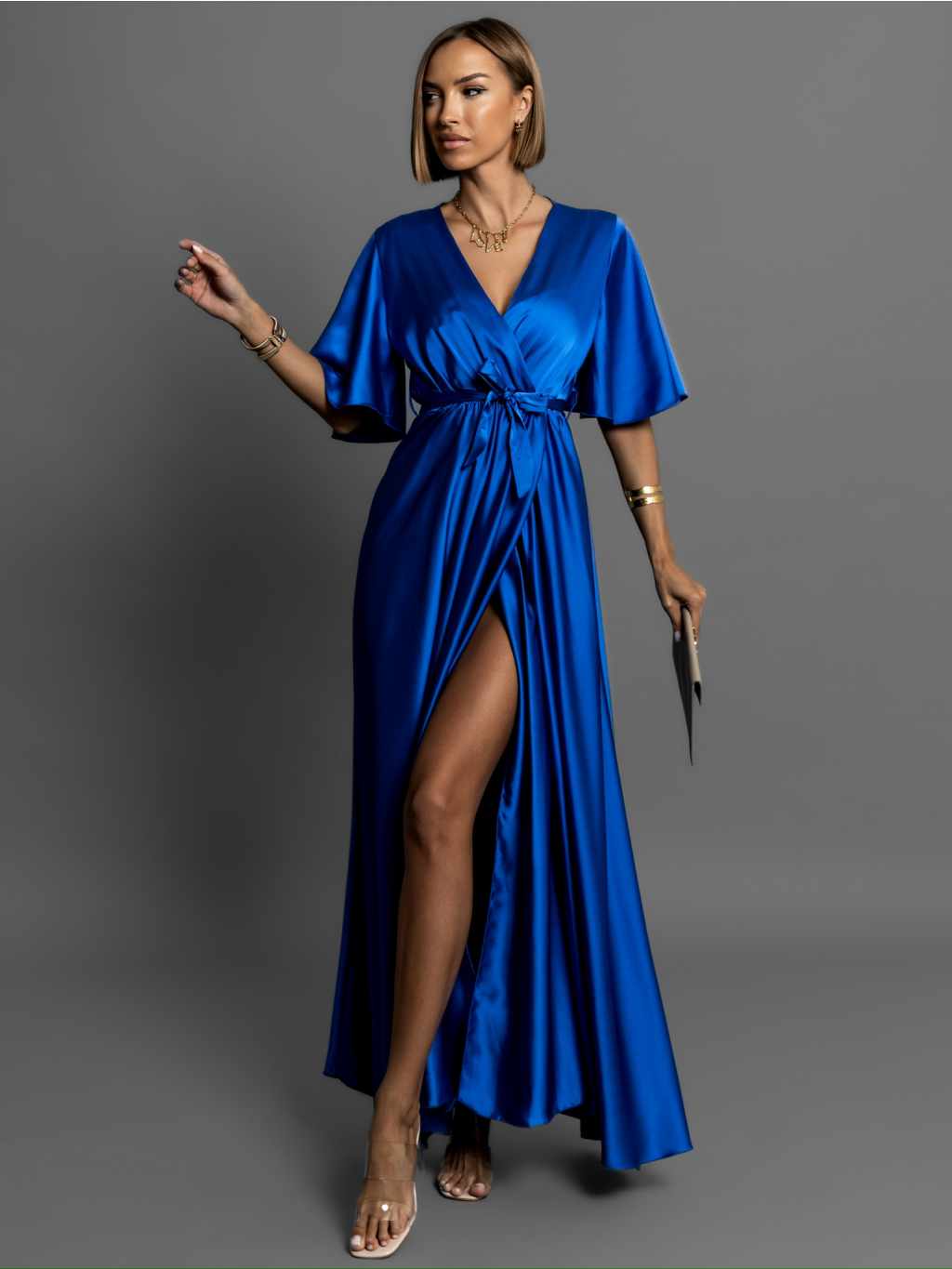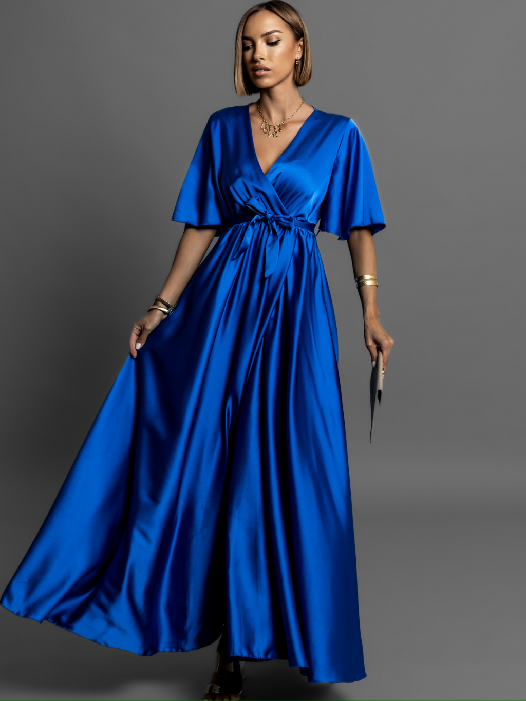 Kráľovsky modré saténové dlhé šaty GO HOME s krátkym rukávom