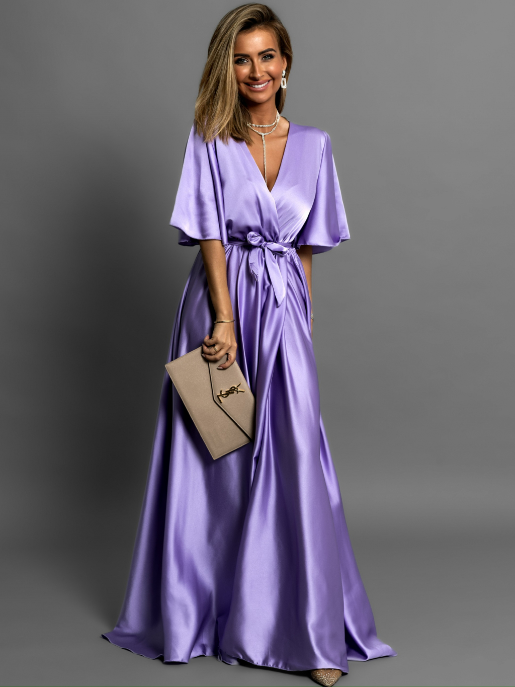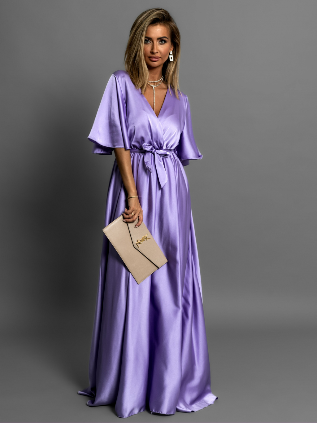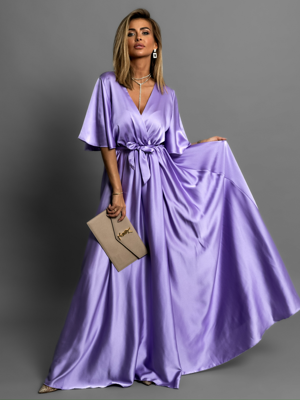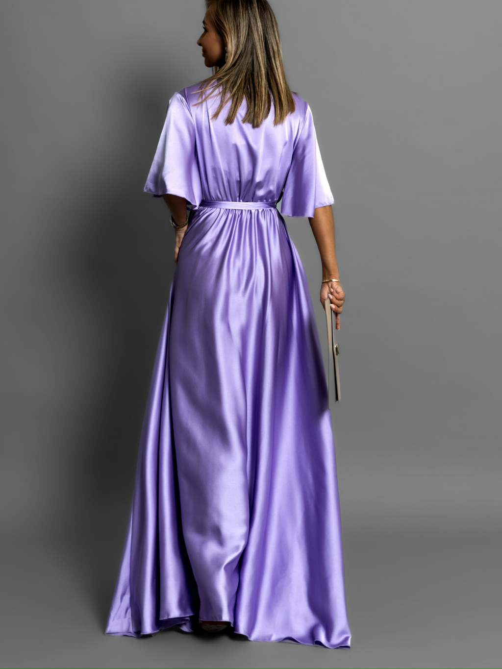Levanduľové dlhé saténové šaty GO HOME s krátkym rukávom