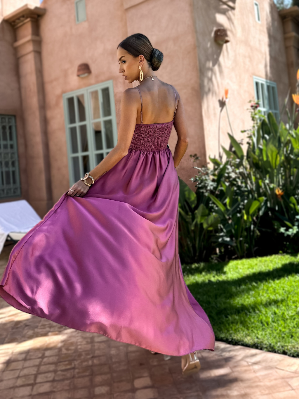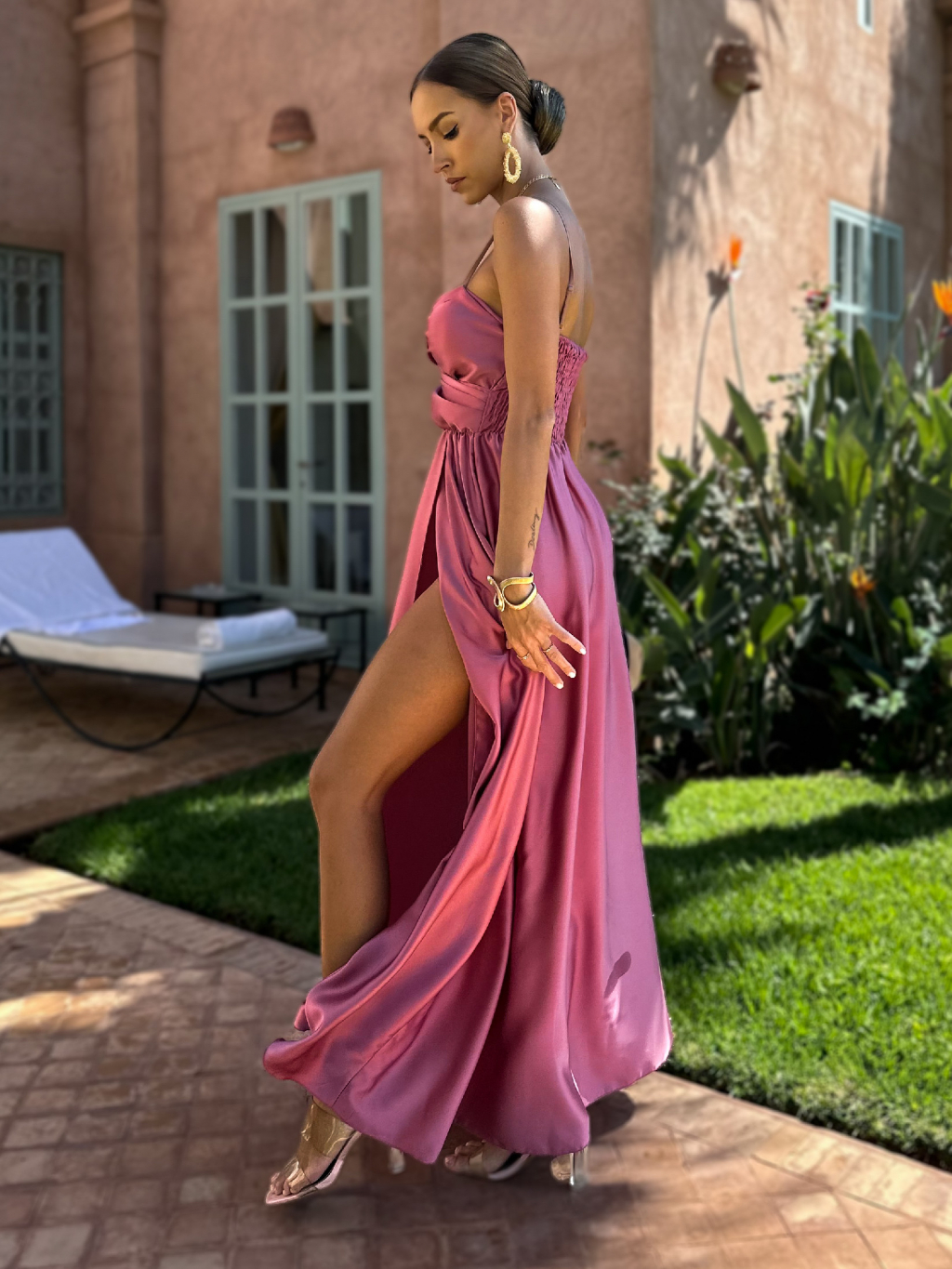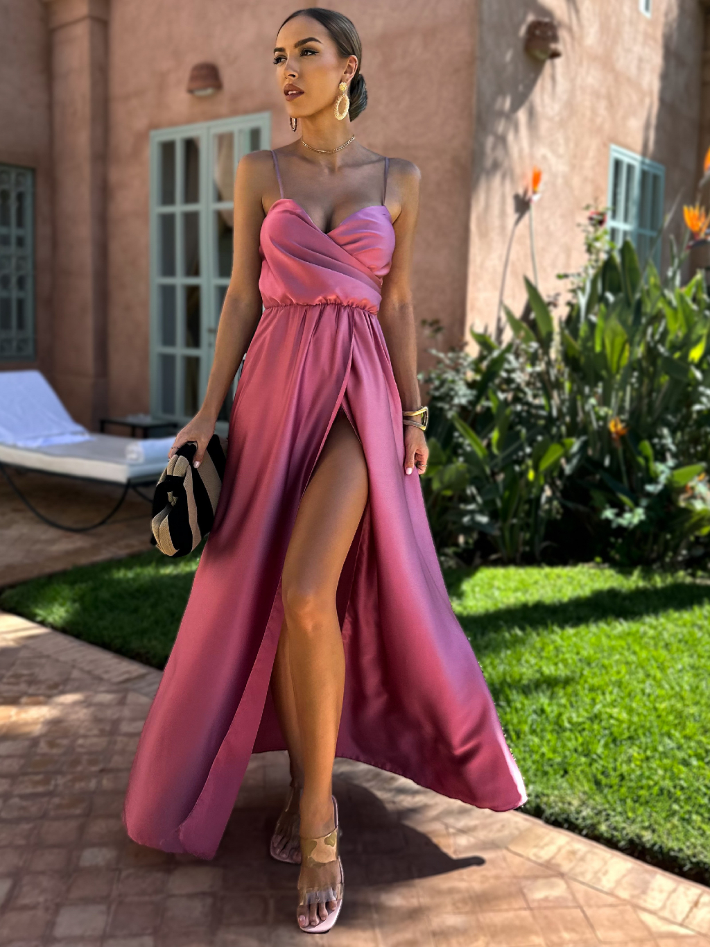 Malinové dlhé saténové spoločenské šaty PATILLA s rázporkom