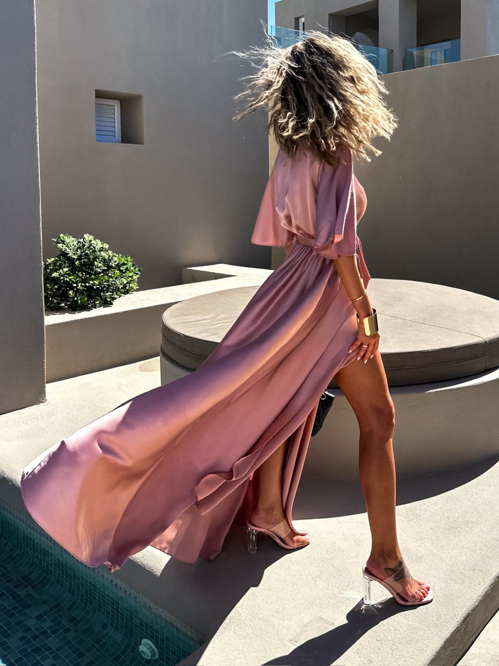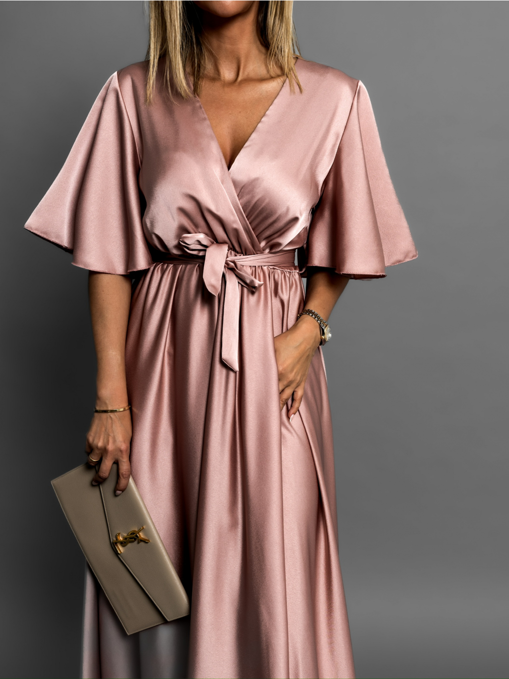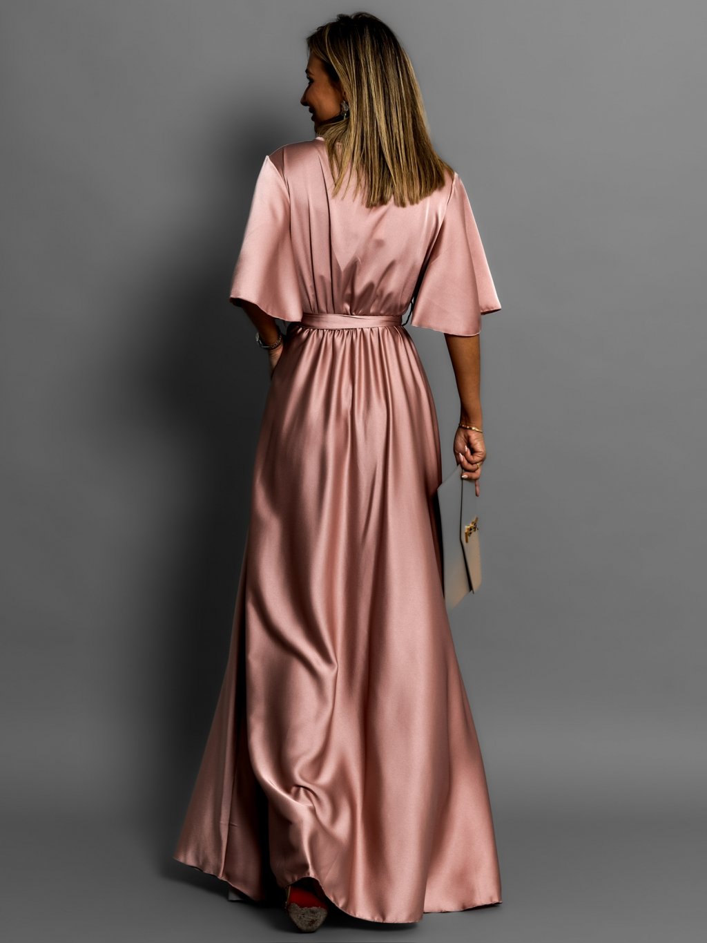 Staroružové dlhé saténové šaty GO HOME s krátkym rukávom