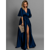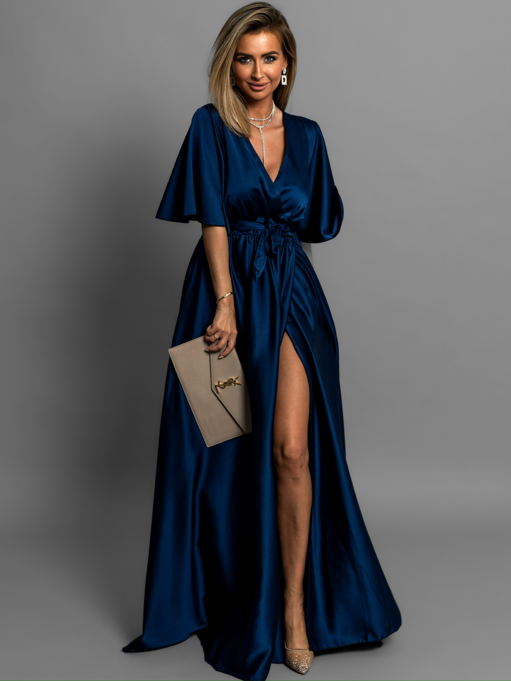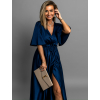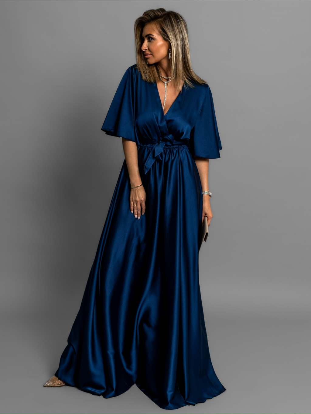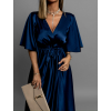 Tmavomodré saténové dlhé šaty GO HOME s krátkym rukávom