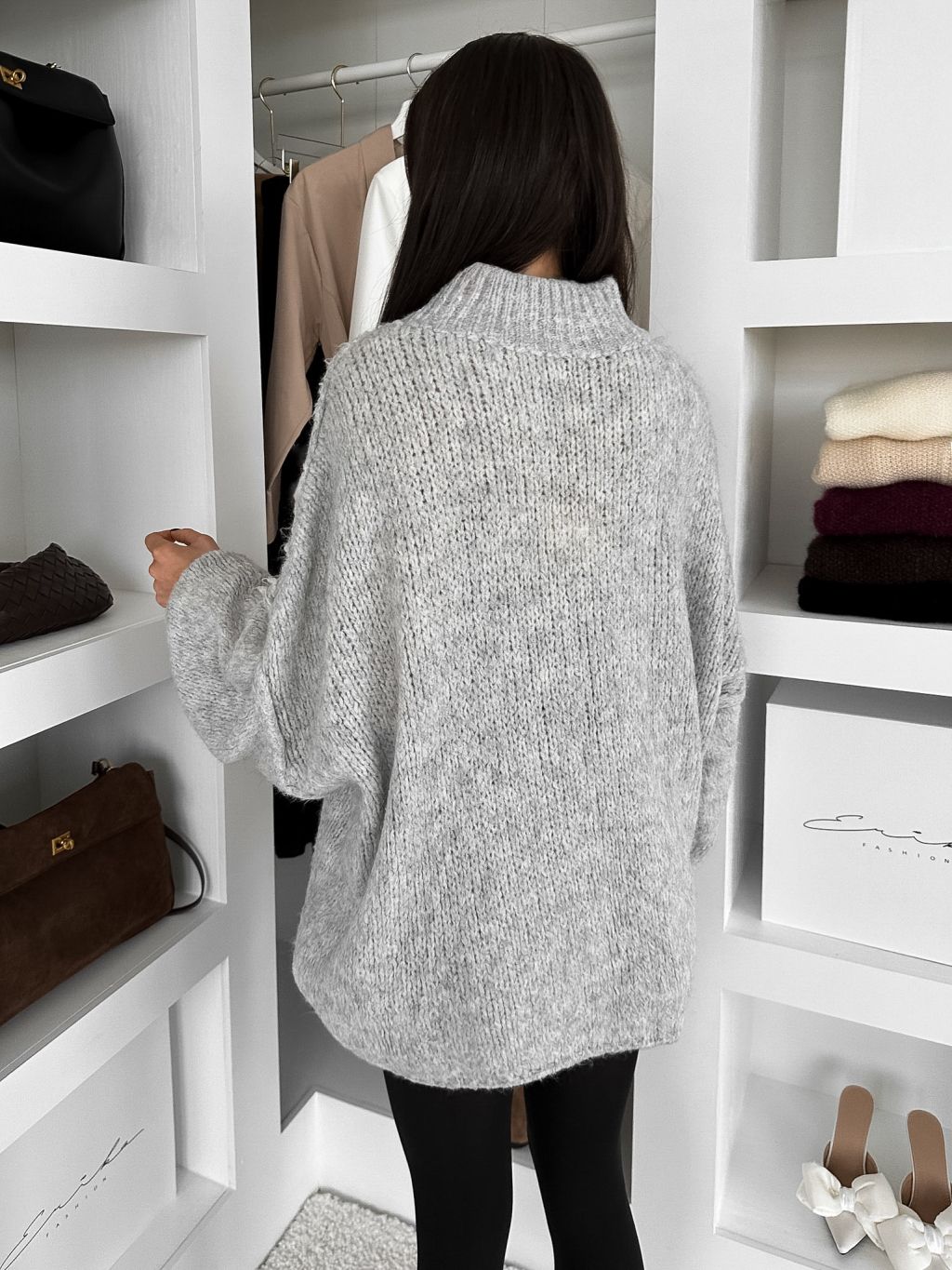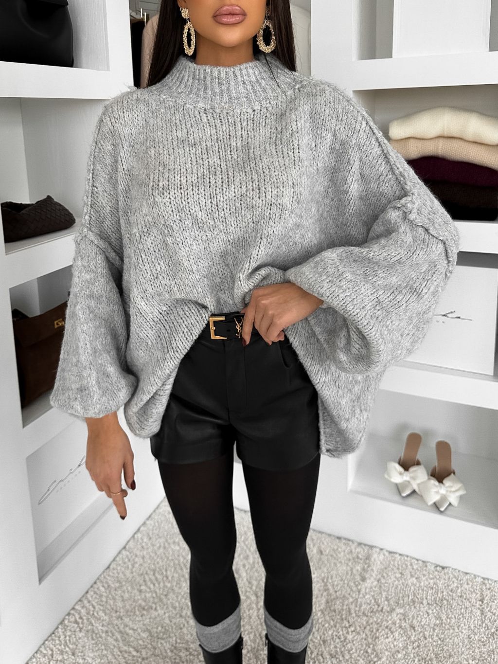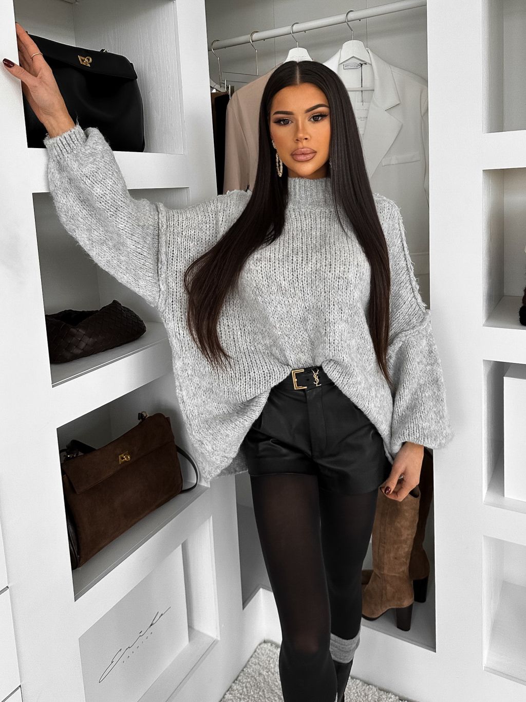Šedý dlhý s vlnou pletený sveter FEROLYN