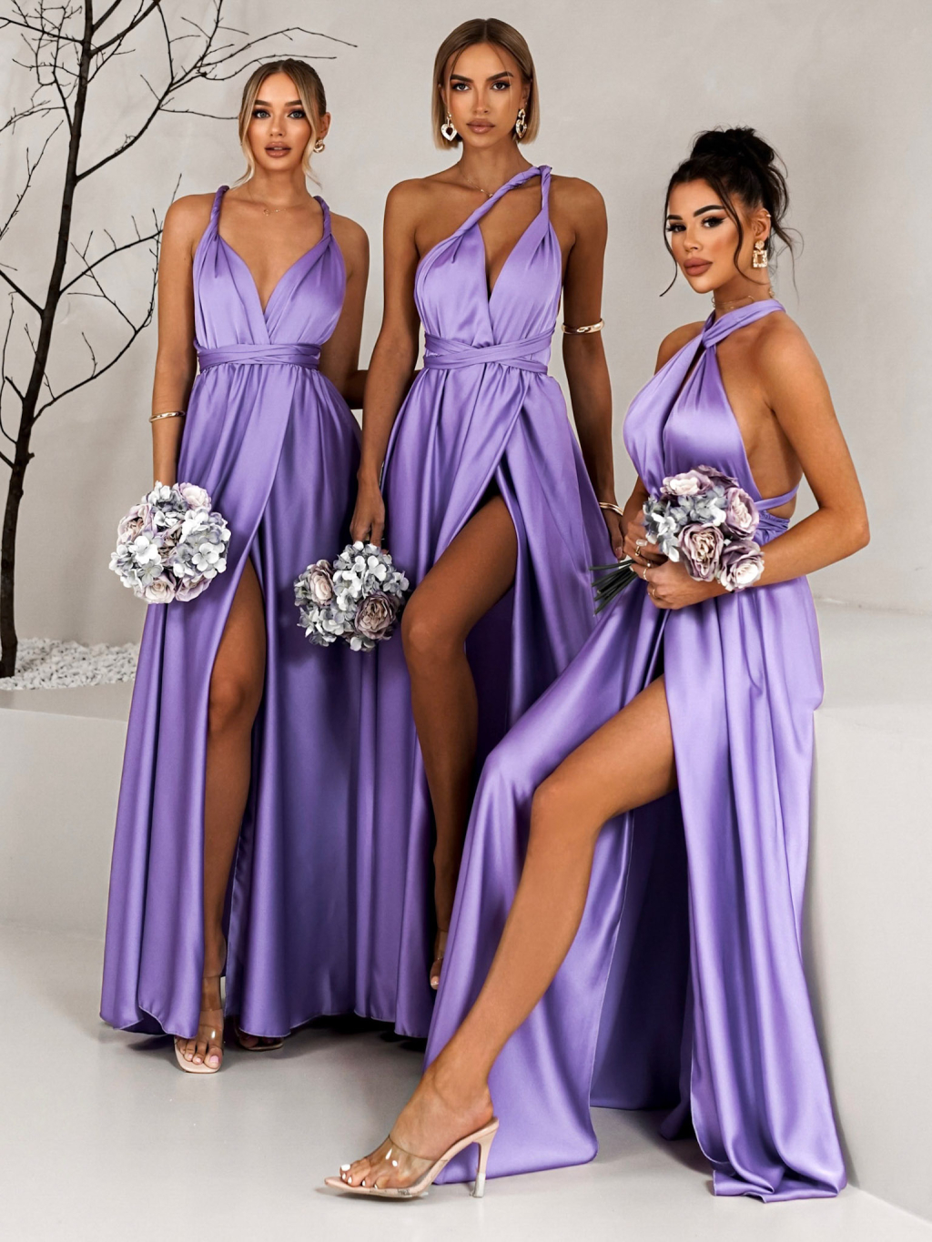 Fialové šaty VALERDI s variabilným viazaním a rázporkom pre družičky