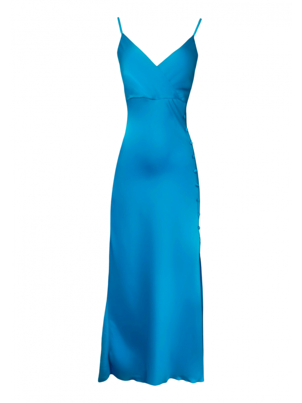 Modré dlhé lesklé šaty MOSES s rázporkom