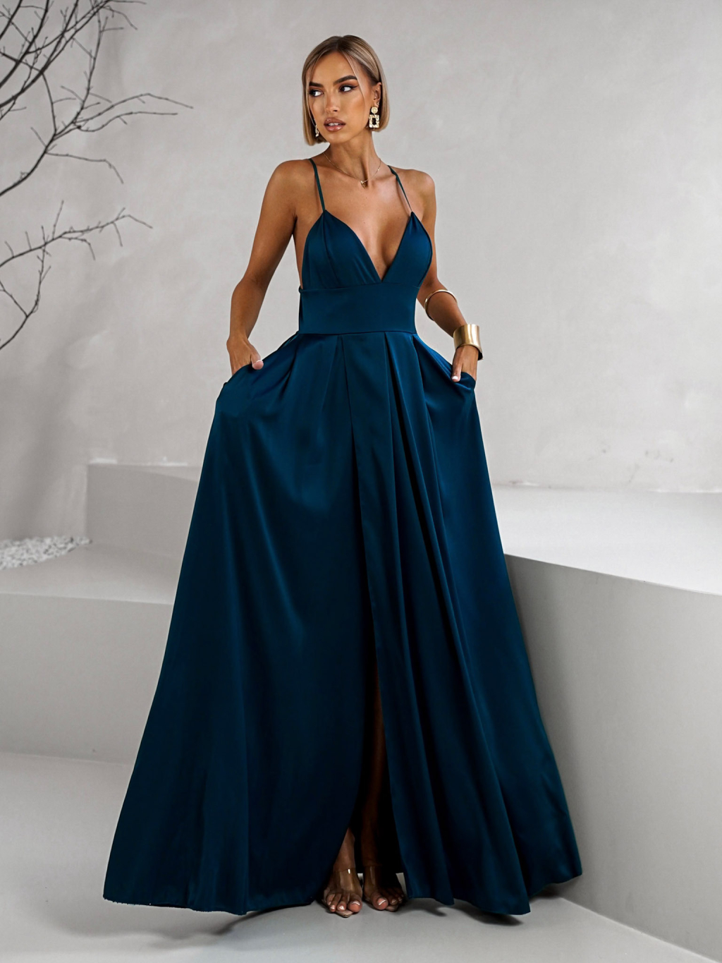Petrolejové dlhé šaty BREALYN pre družičky s vreckami