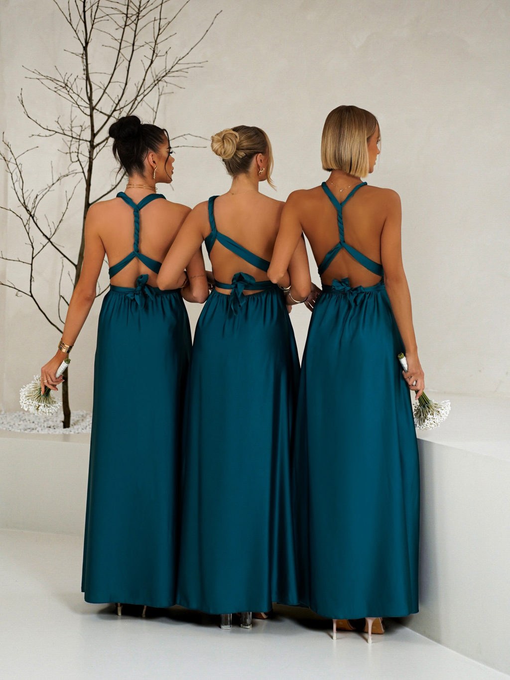 Petrolejové dlhé šaty VALERDI s variabilným viazaním a rázporkom pre družičky