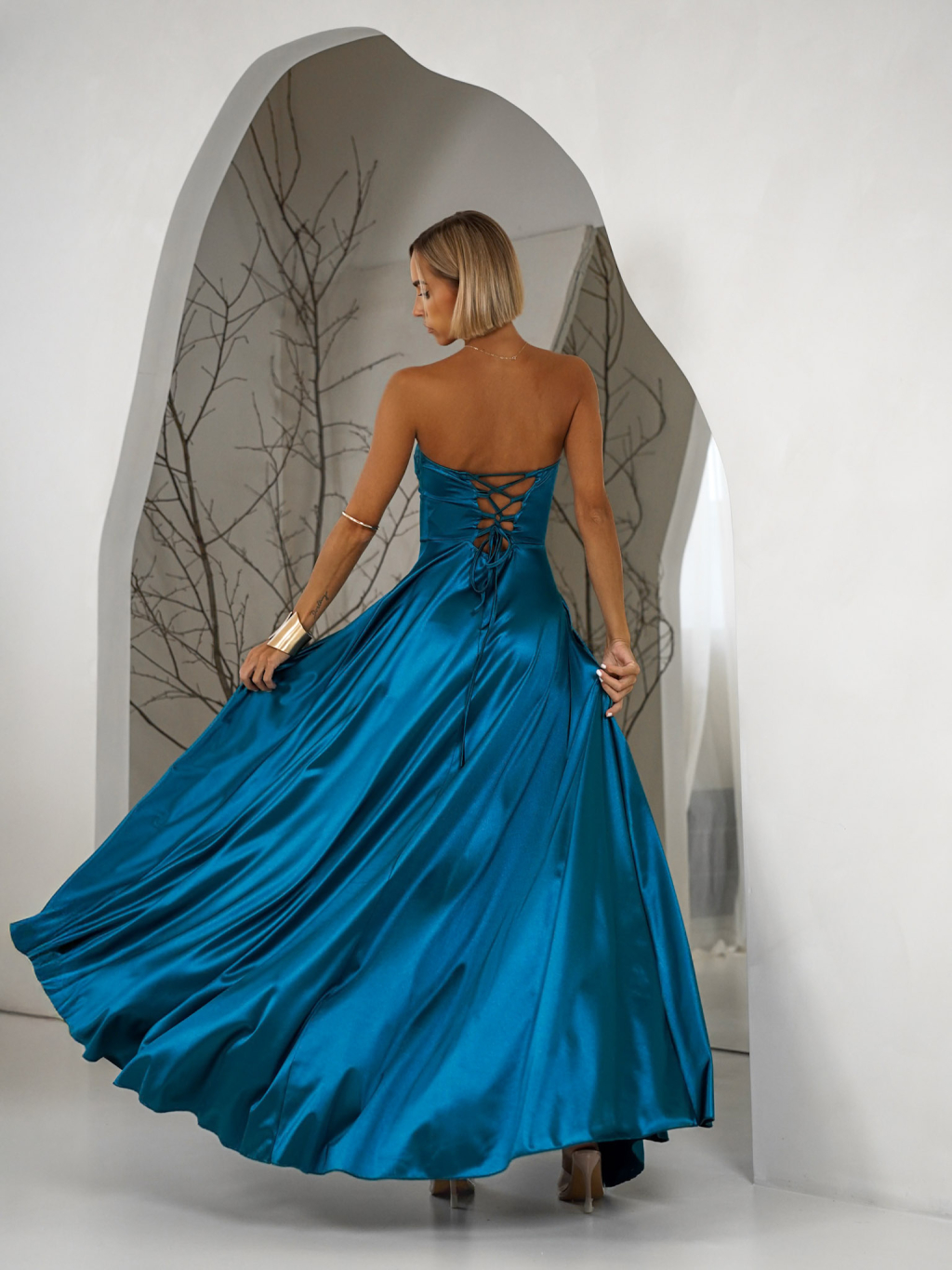 Petrolejové saténové dlhé šaty GYBRAL pre družičky s rázporkom
