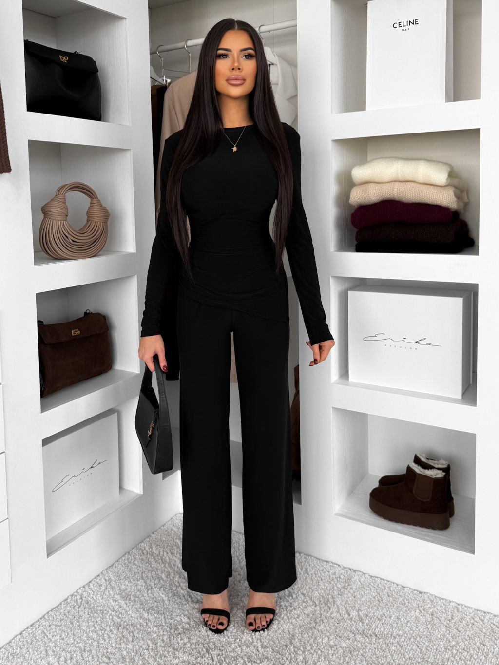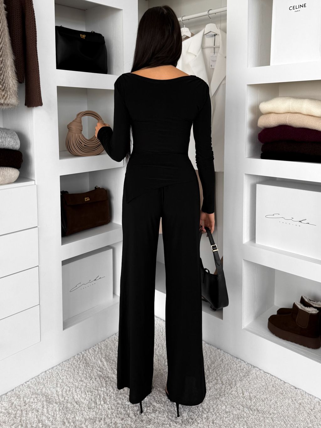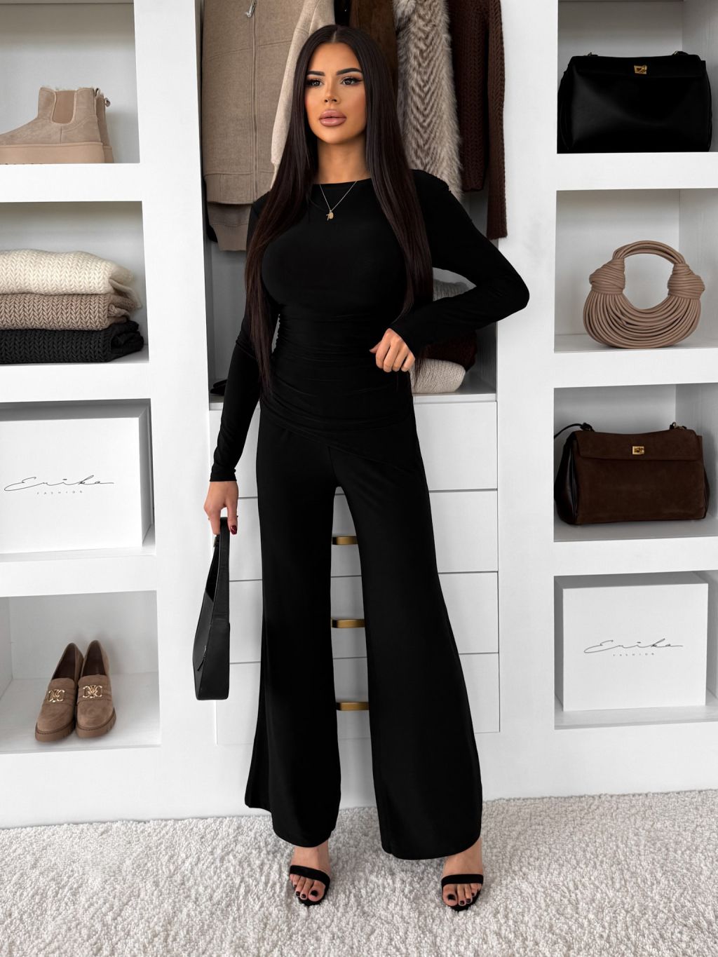Čierny elegantný nohavicový elastický komplet FELUREATY