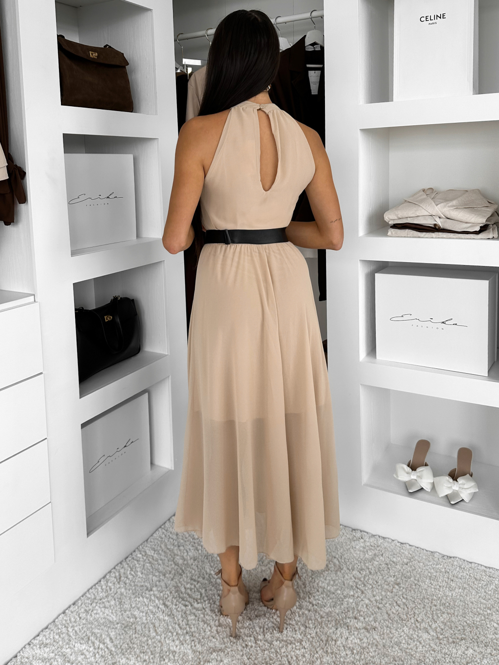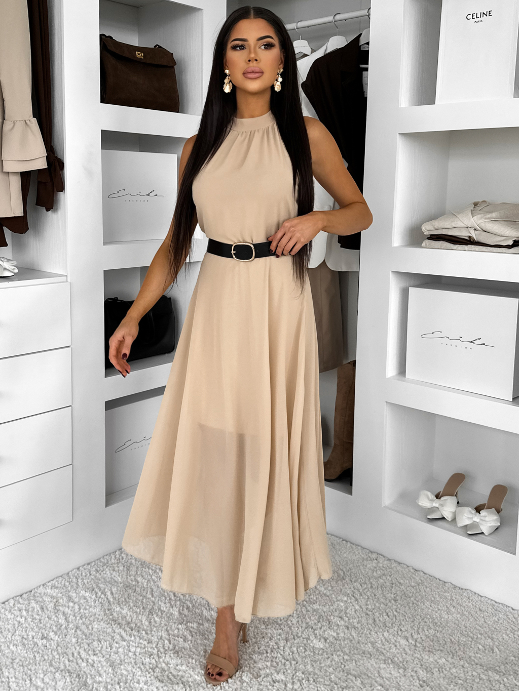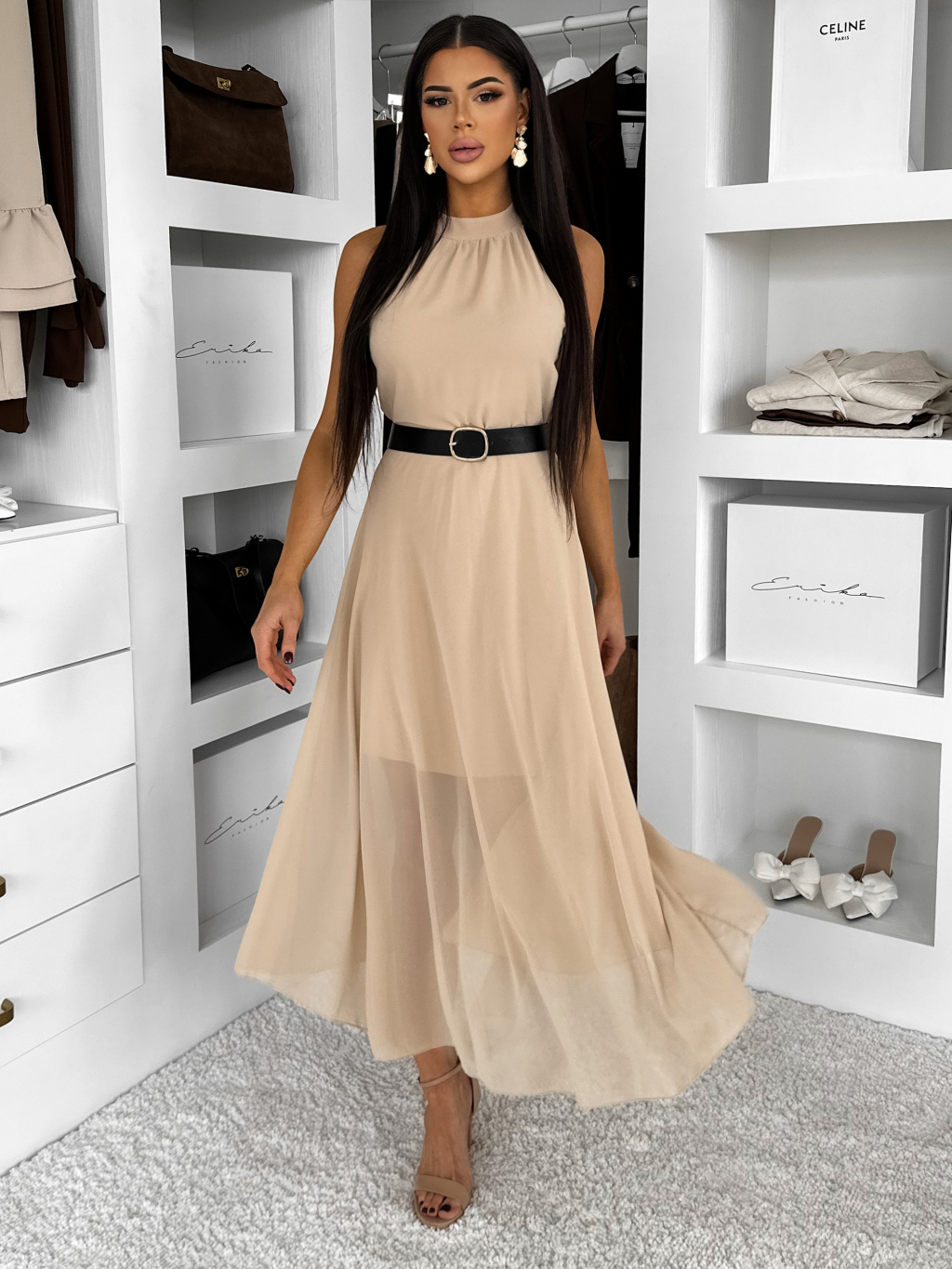 Béžové dlhé šaty DLEGO s opaskom