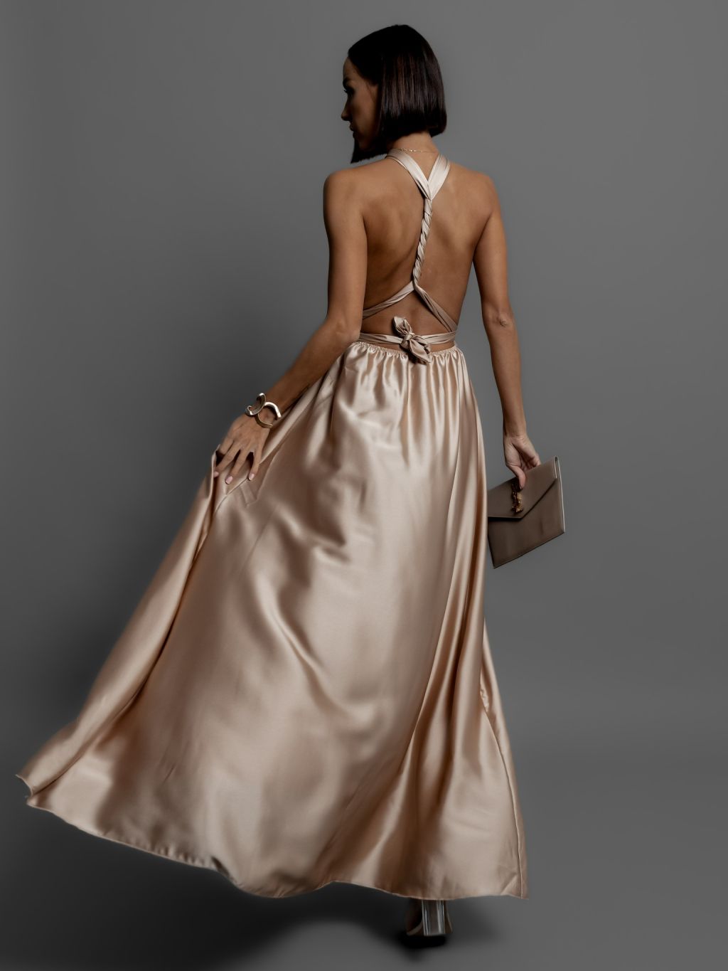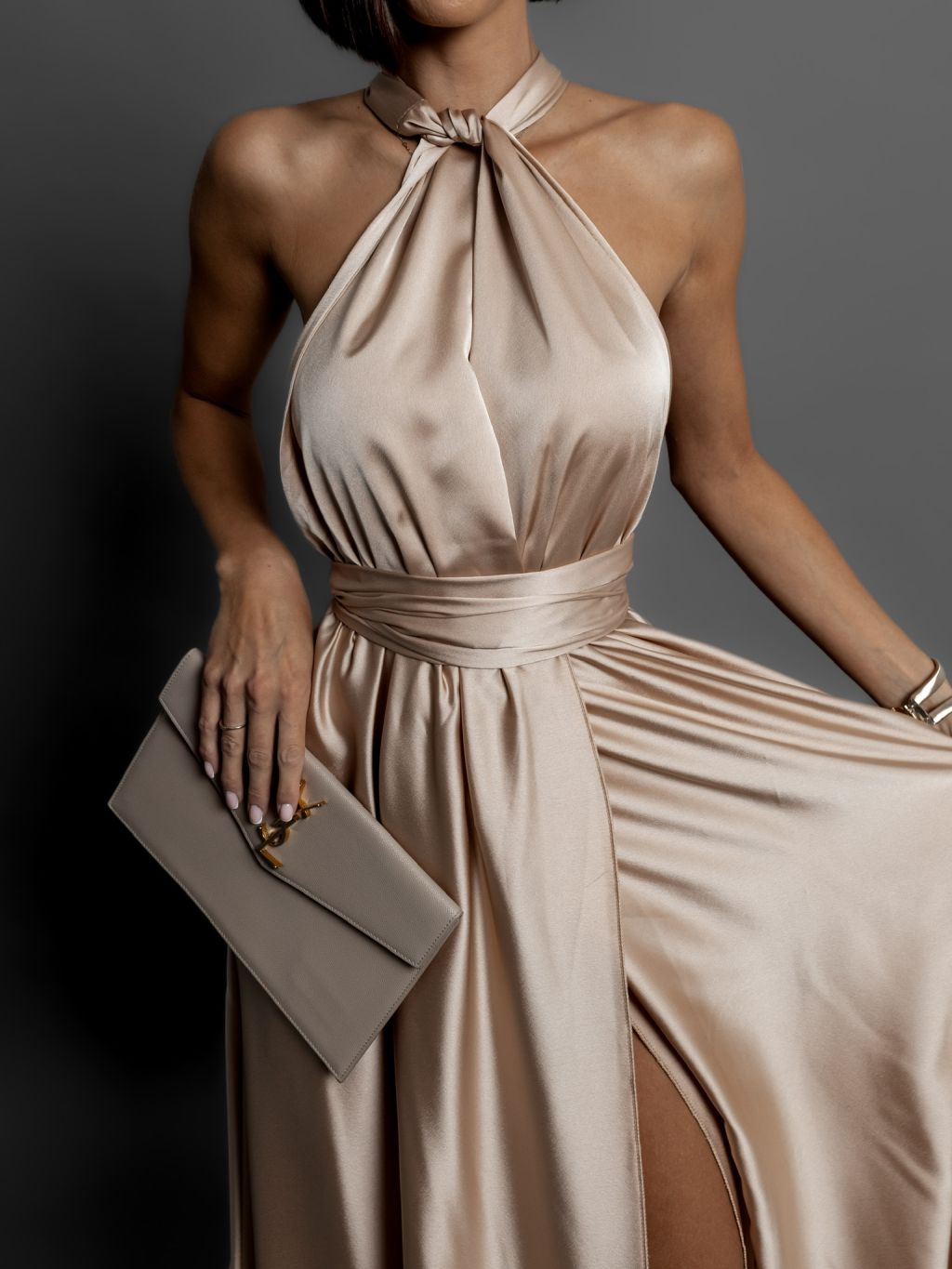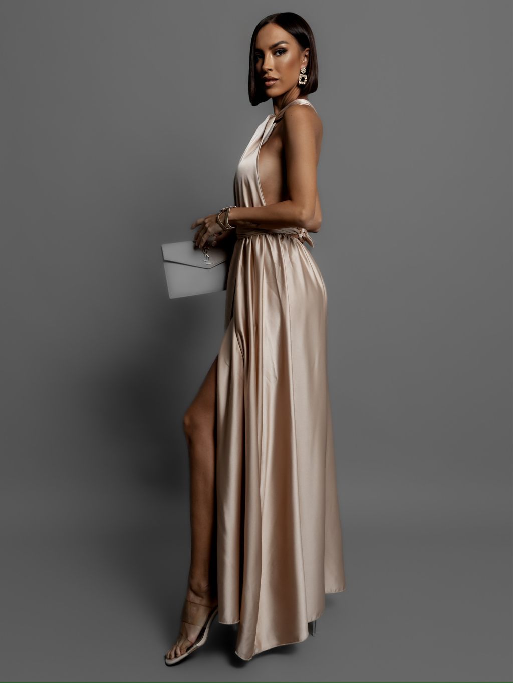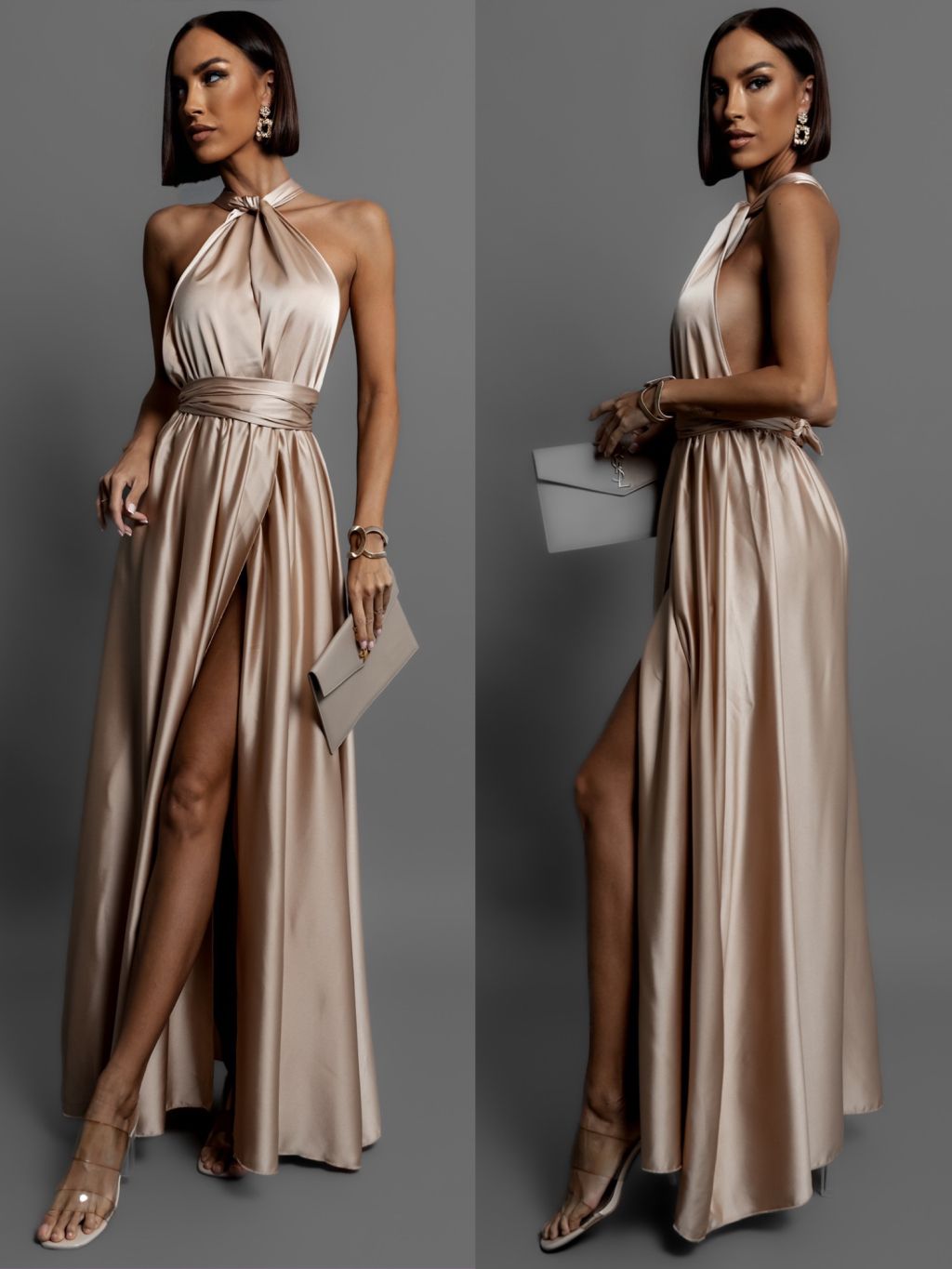 Béžové lesklé šaty VALERDI s variabilným viazaním a rázporkom