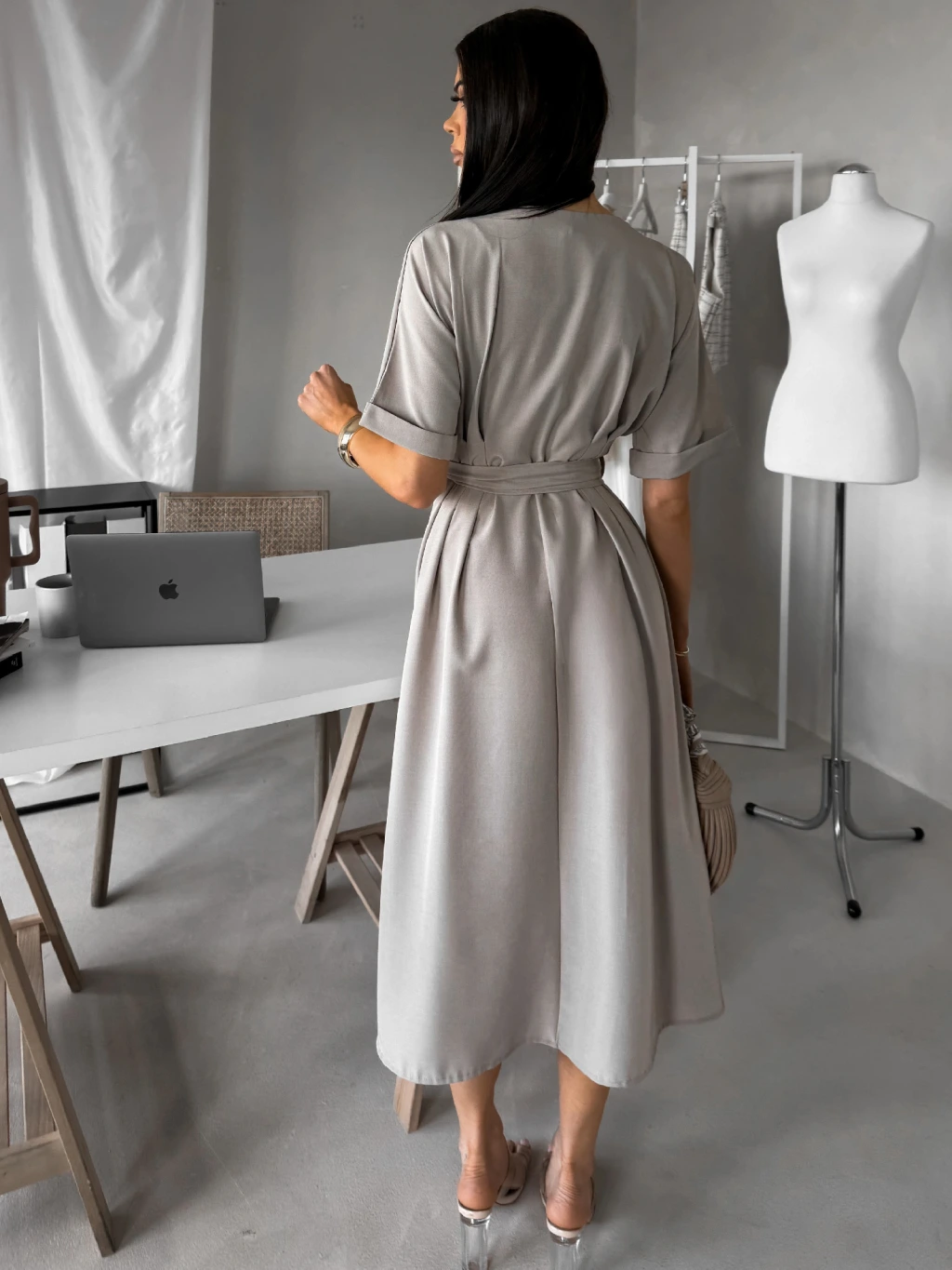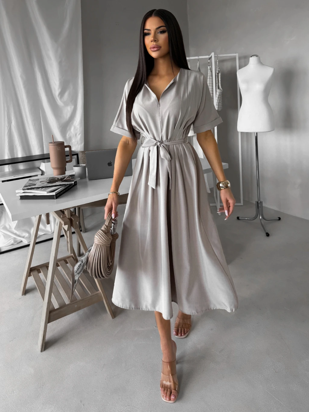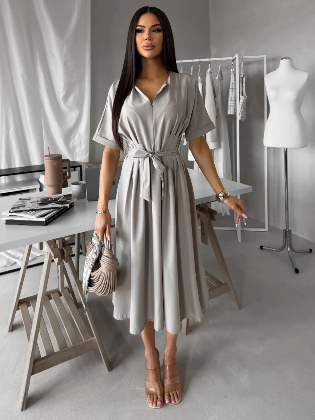 Béžovošedé košeľové midi šaty YELONY s opaskom