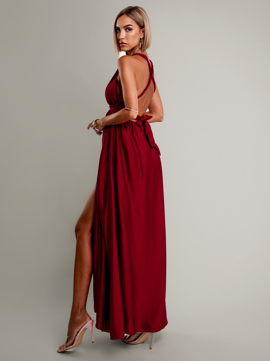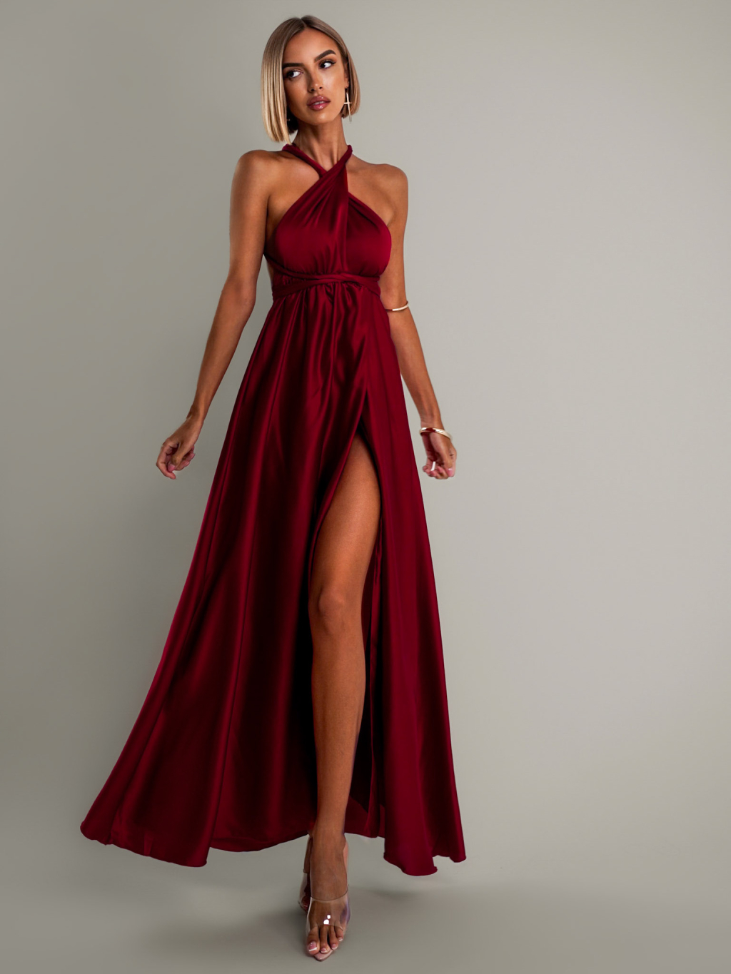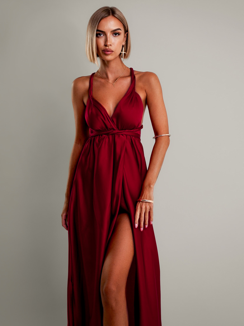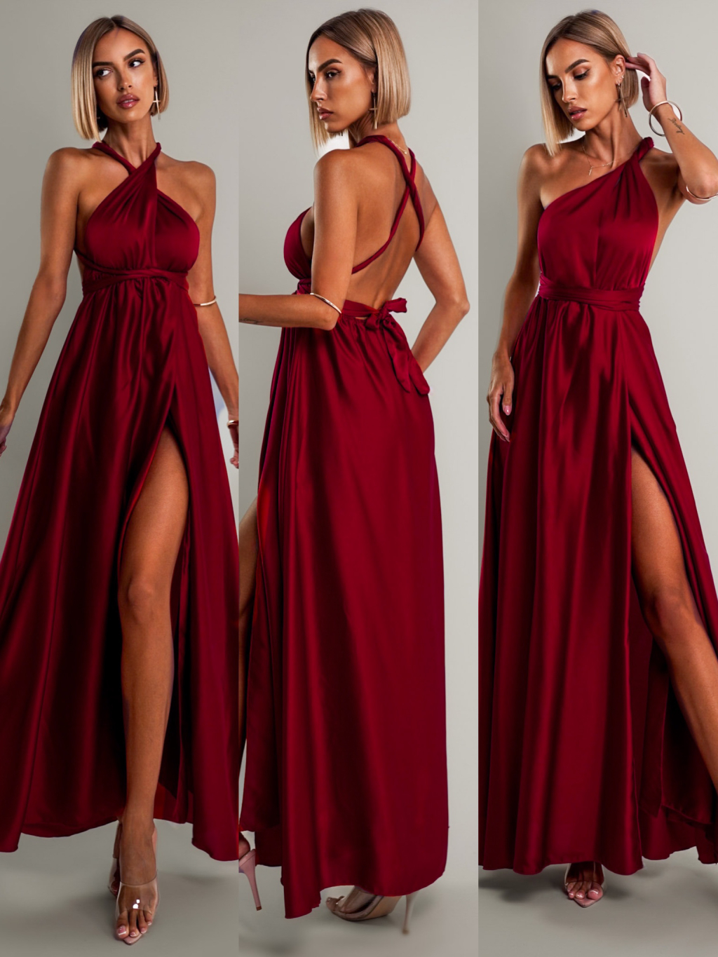 Bordové saténové šaty VALERDI s variabilným viazaním a rázporkom