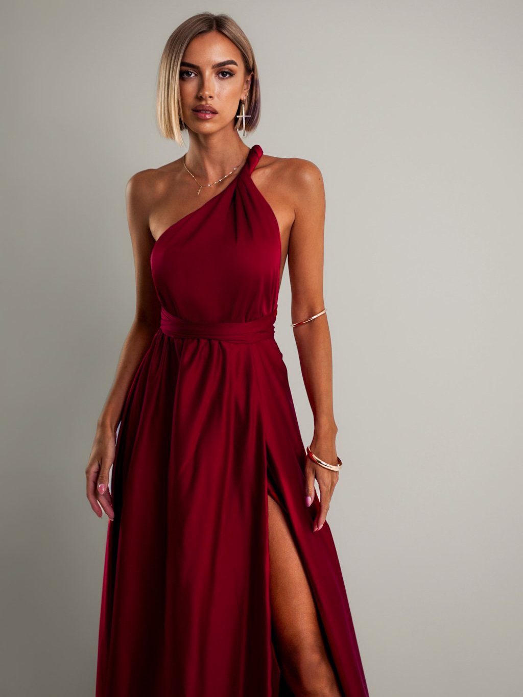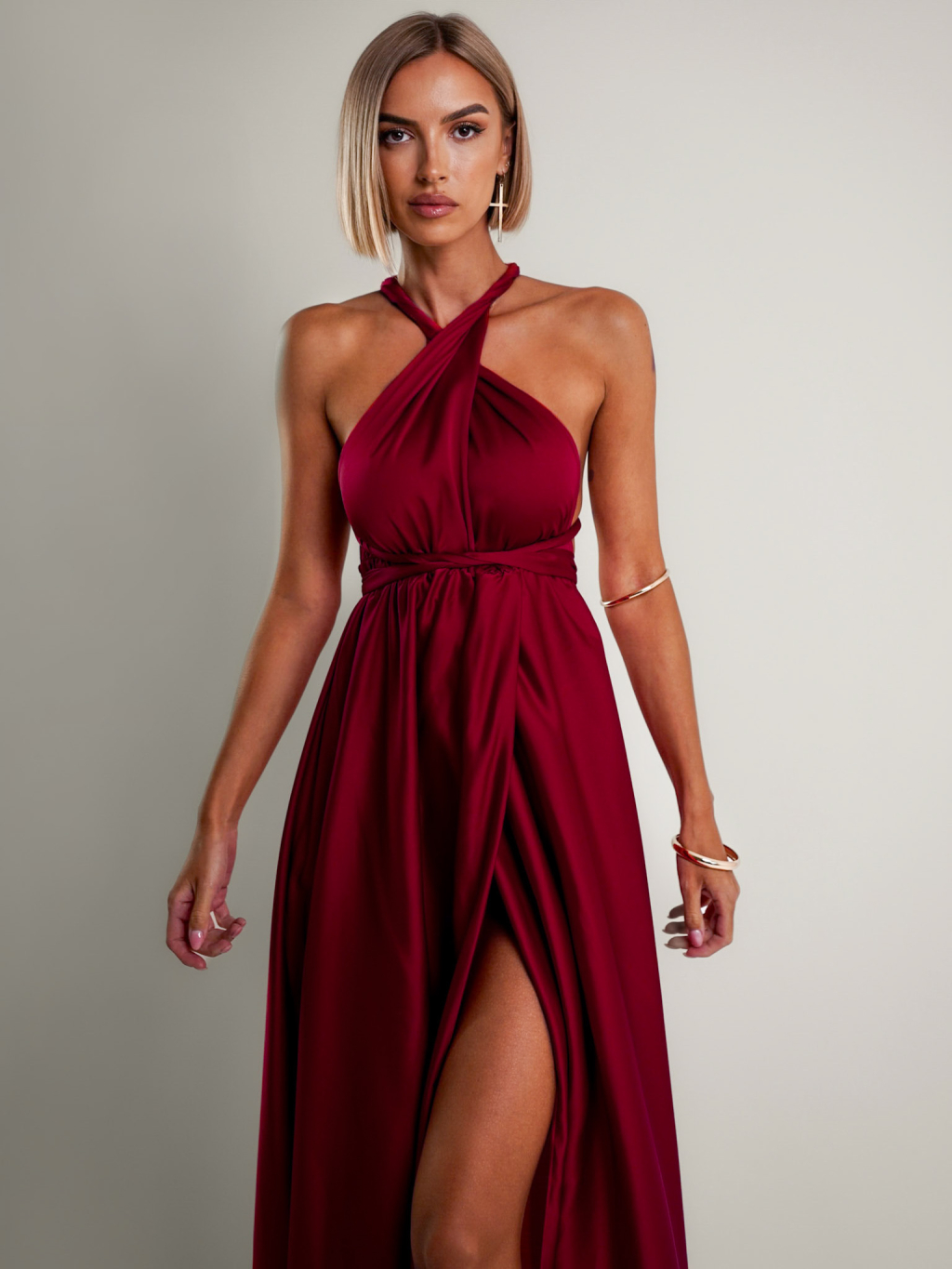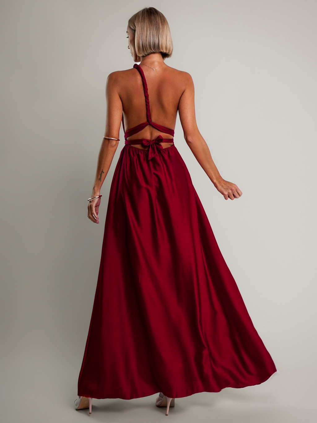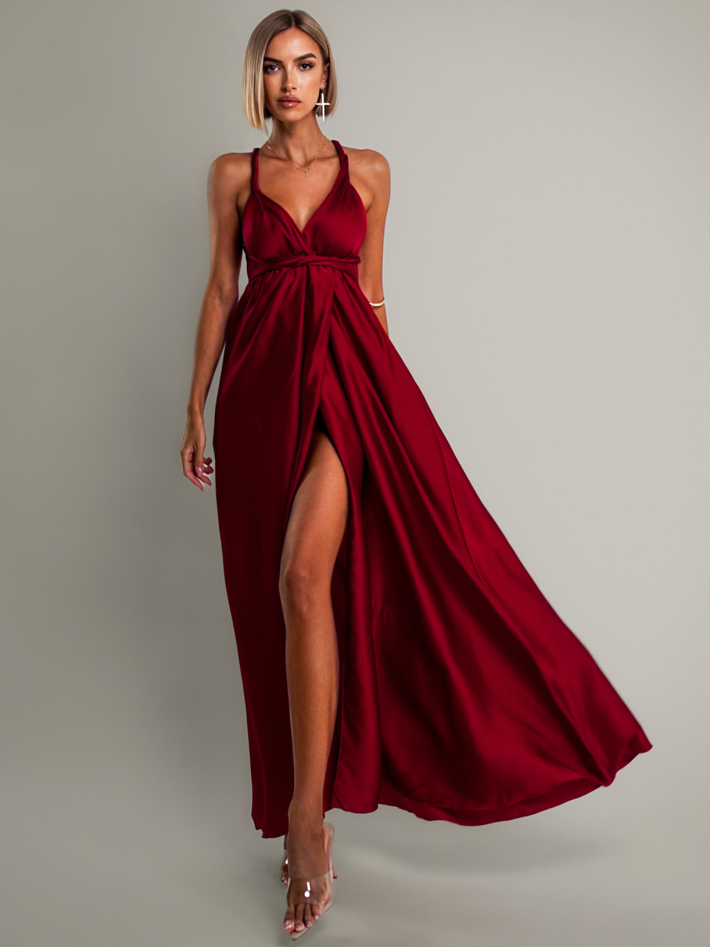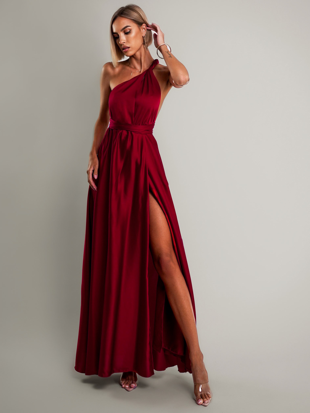 Bordové saténové šaty VALERDI s variabilným viazaním a rázporkom