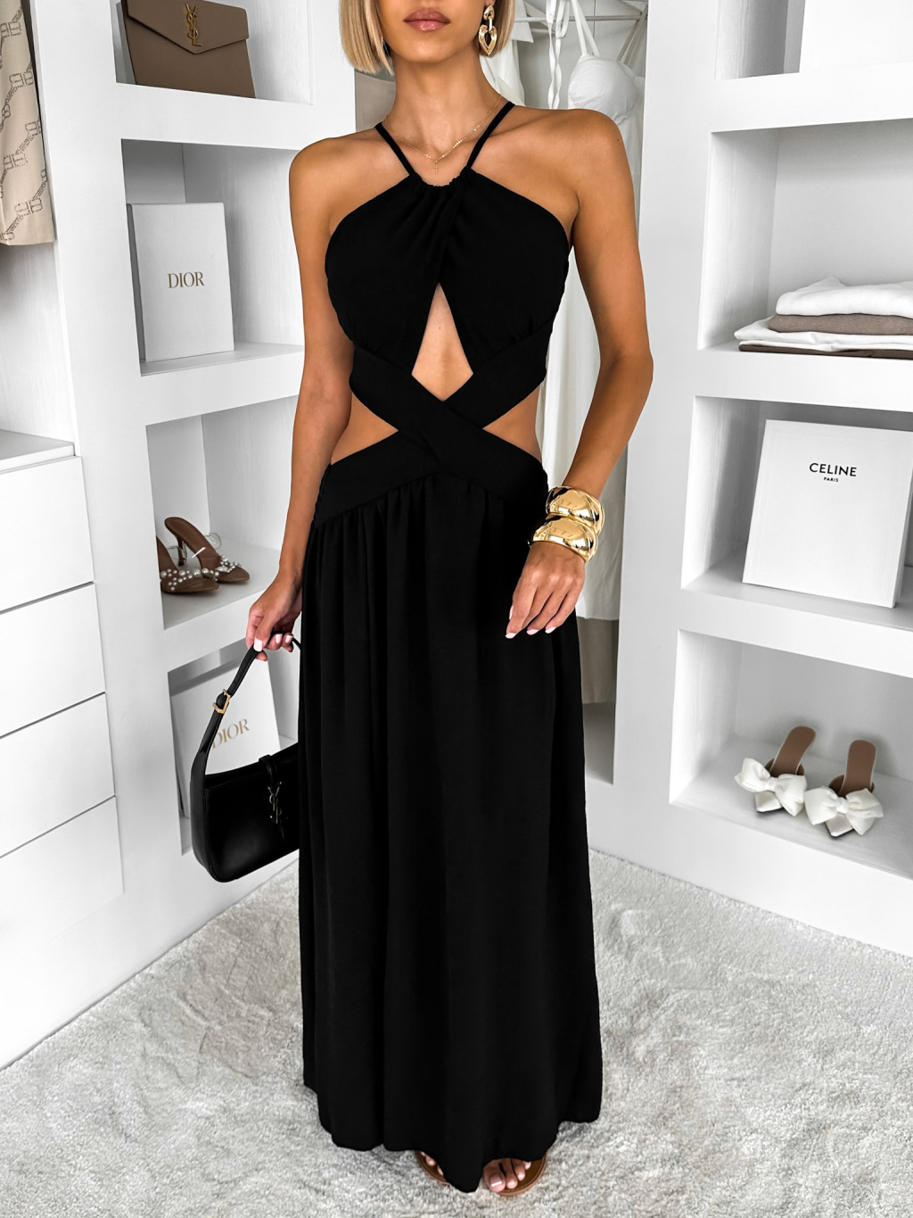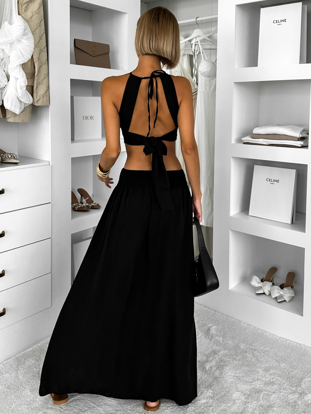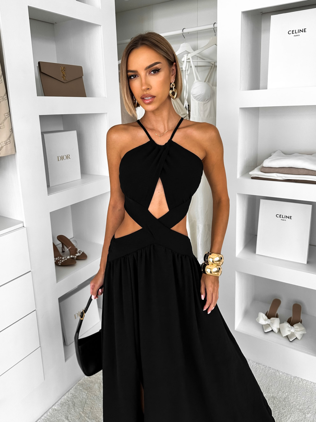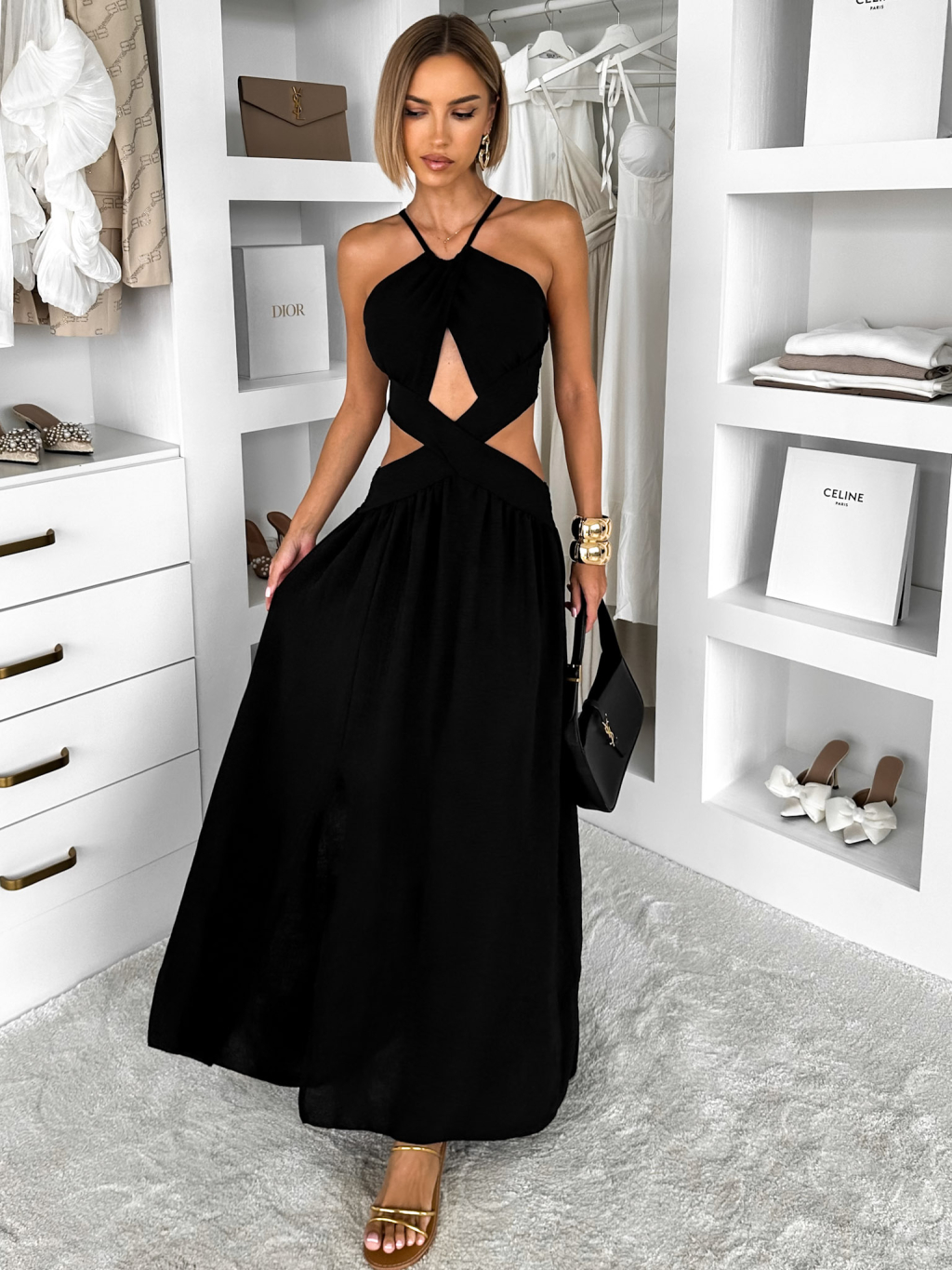 Čierne dlhé šaty DELYEXA s viazaním a rázporkom