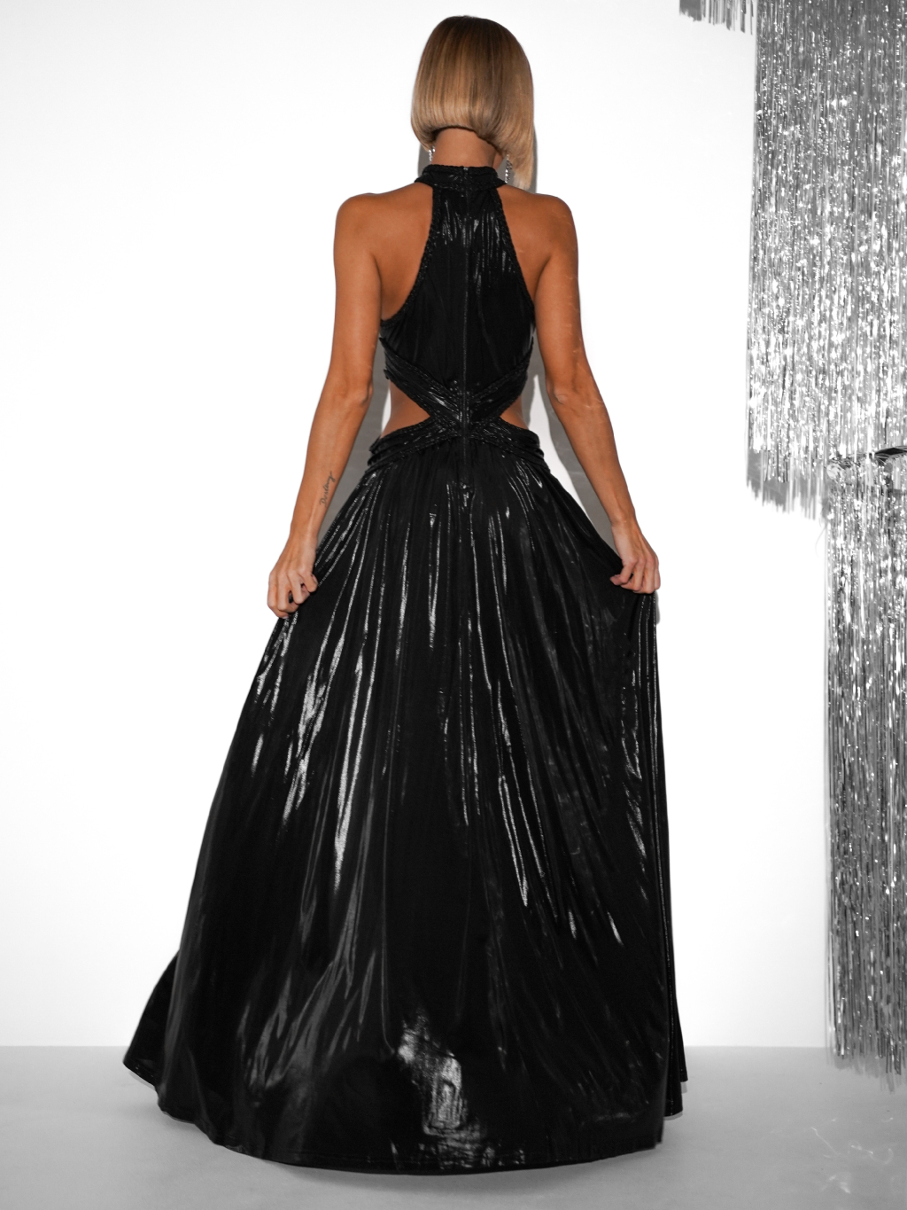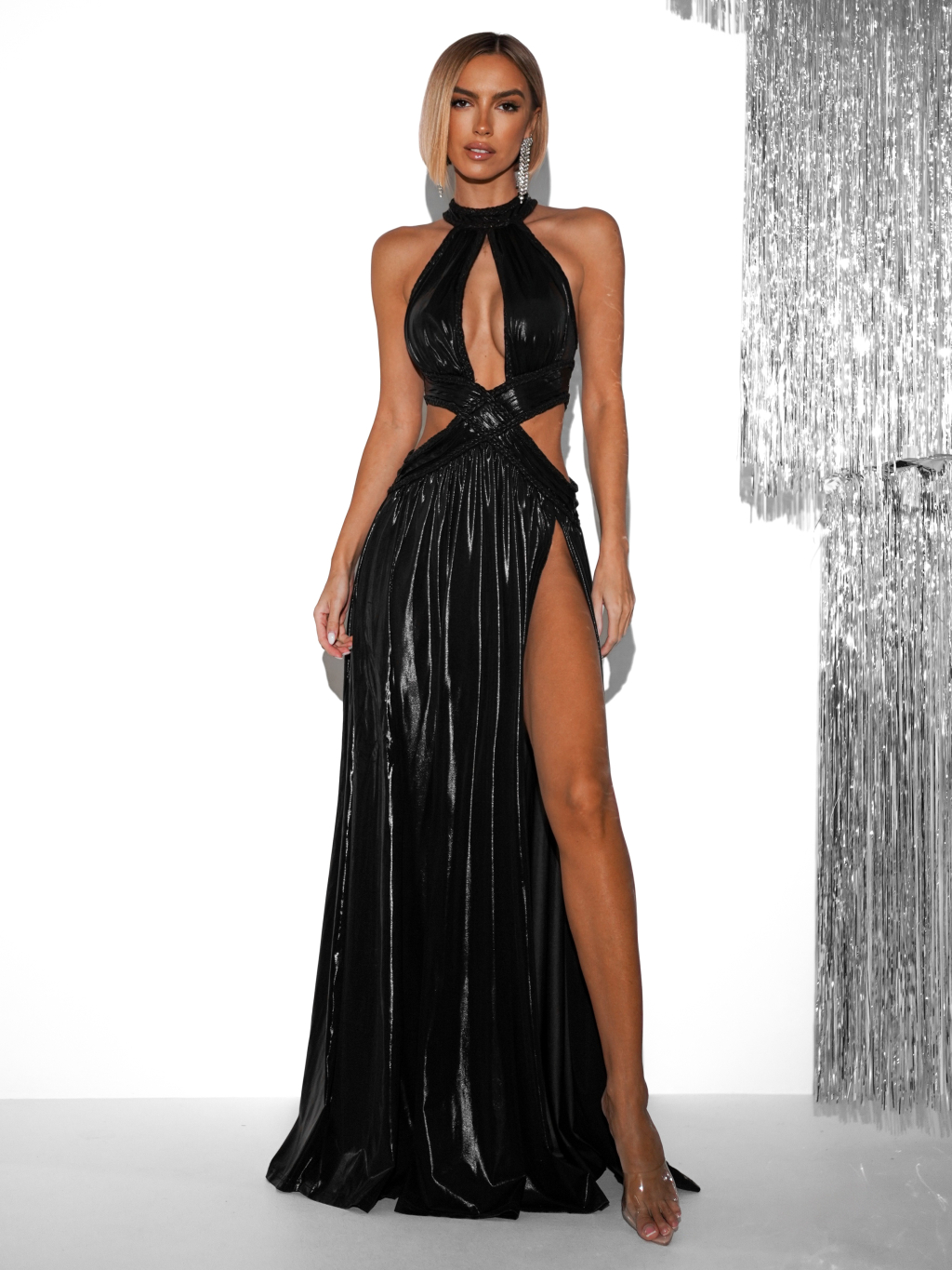 Čierne koženkové dlhé šaty ARYA s odhalenými bokmi