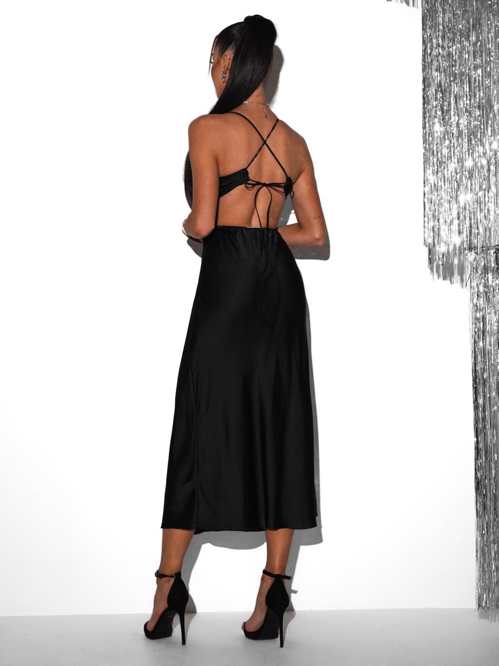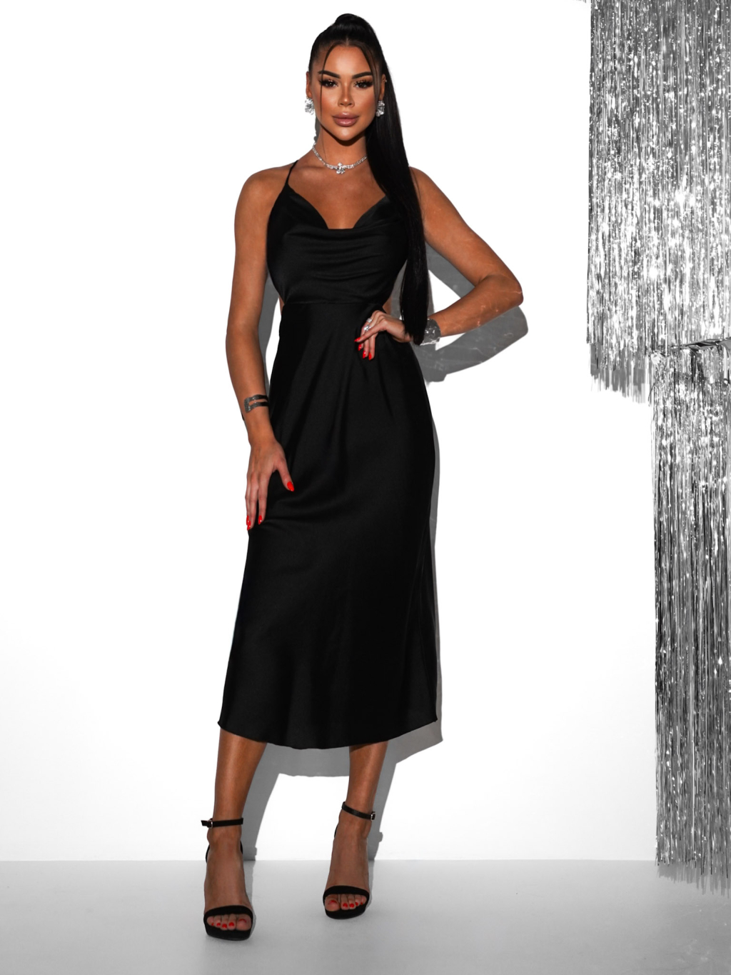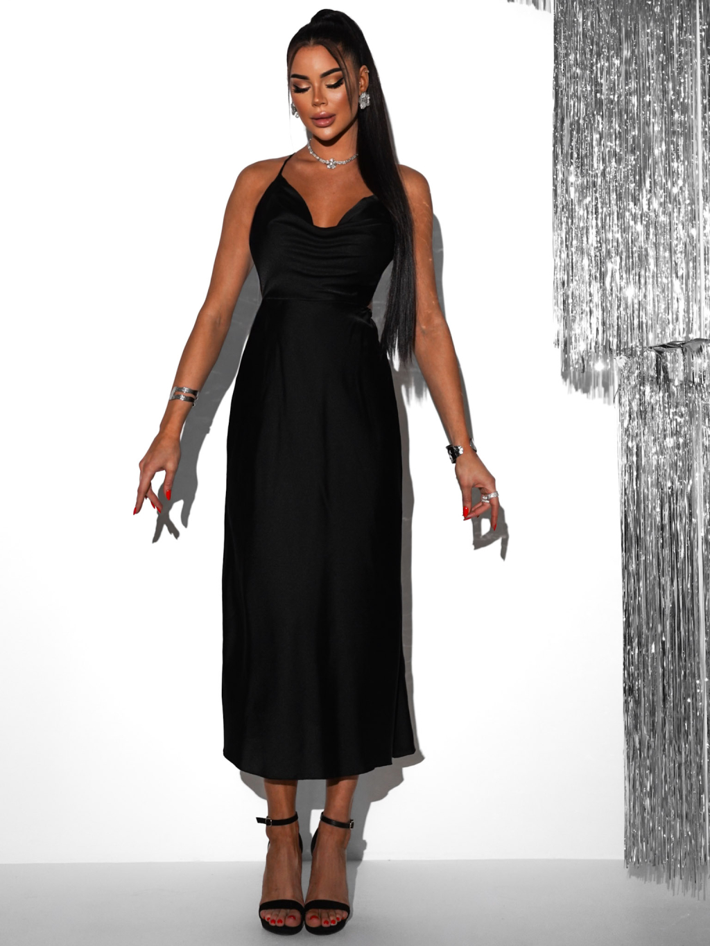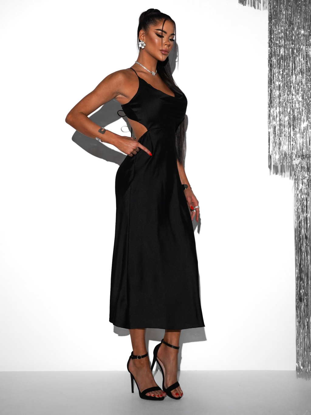 Čierne lesklé saténové šaty MADALYN s prestrihmi