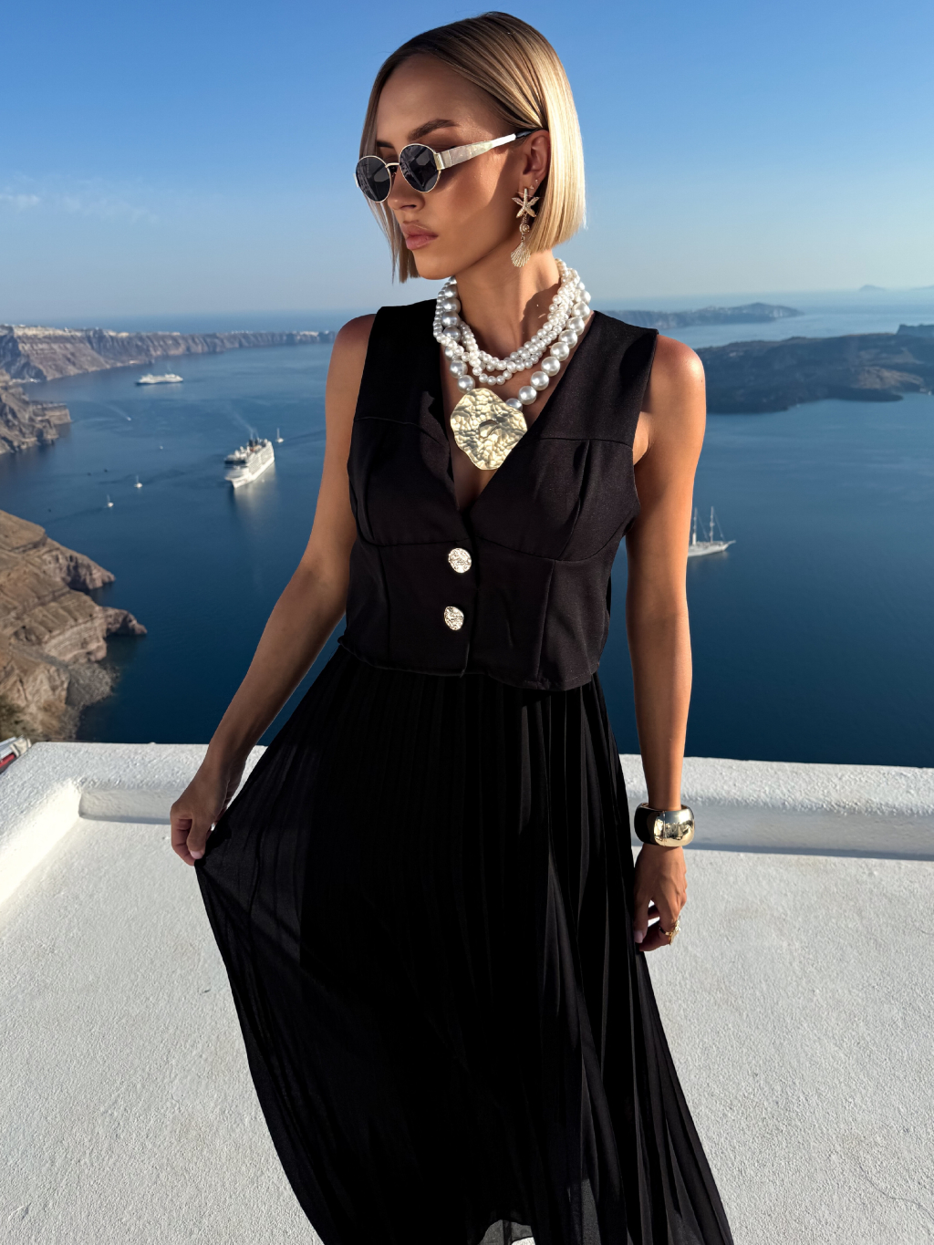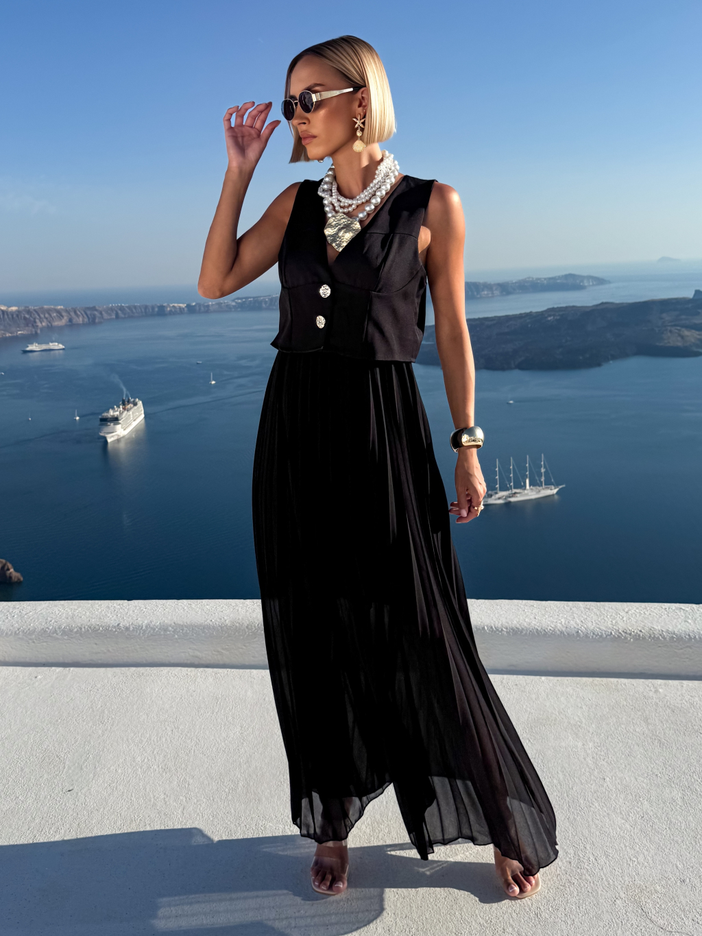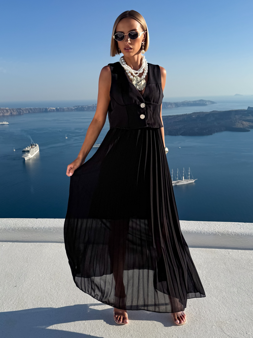 Čierne štýlové dlhé šaty FAENA s plisovanou sukňou
