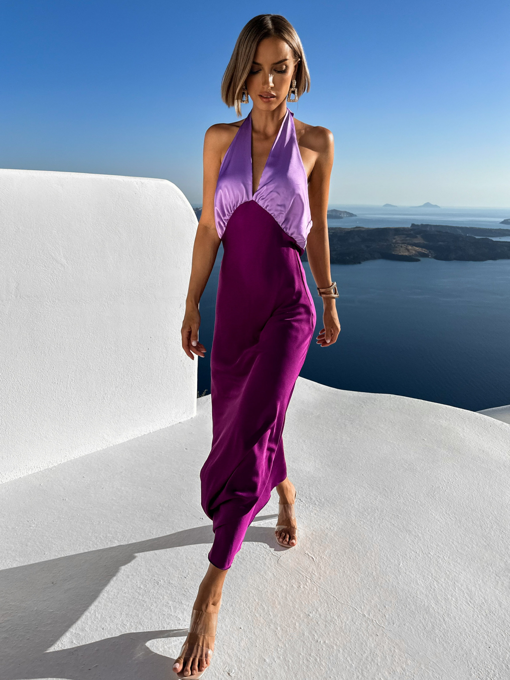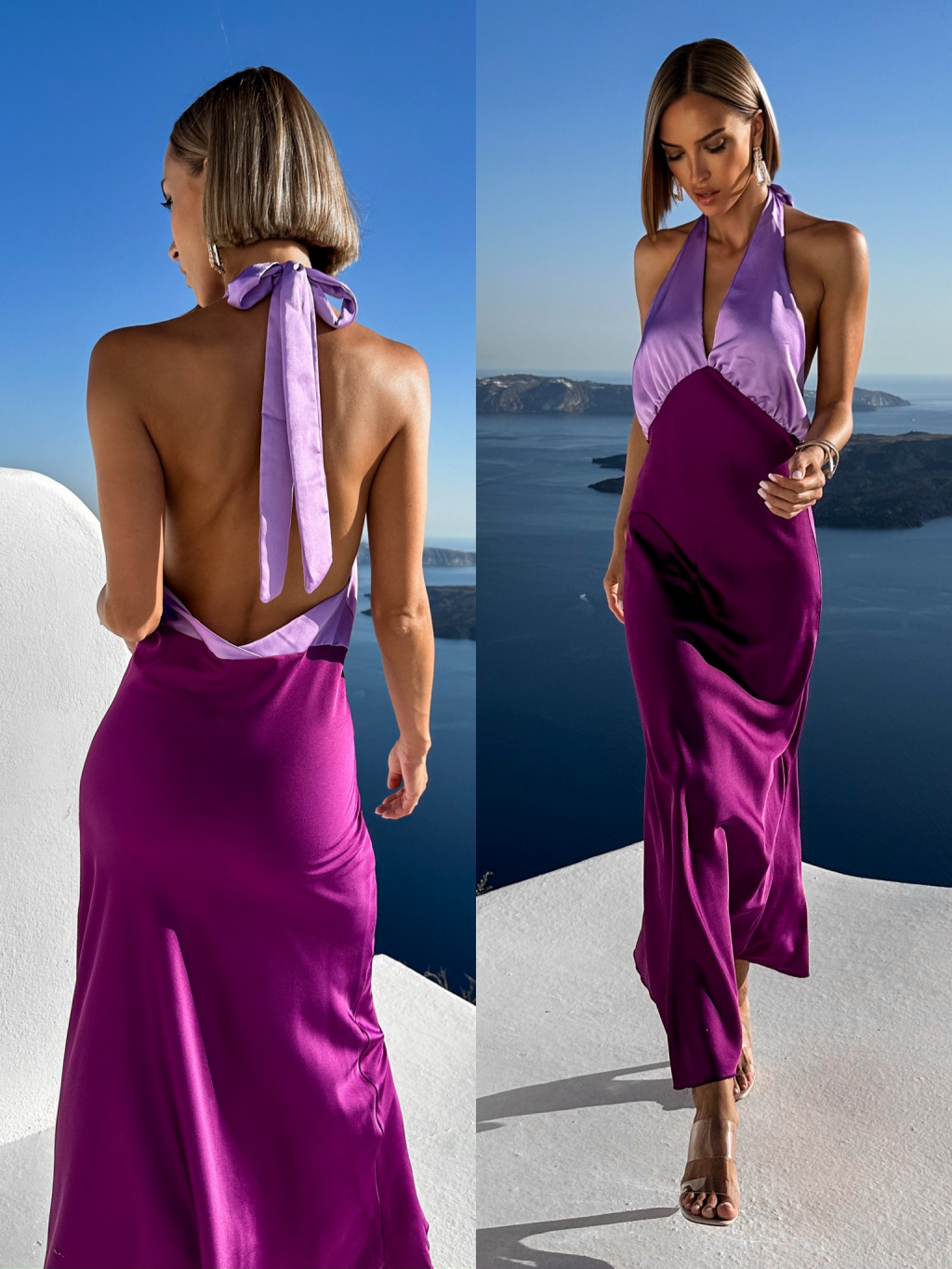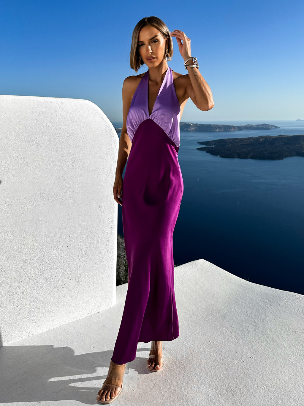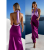 Fialové dlhé elegantné šaty JOLIED na zaviazanie okolo krku