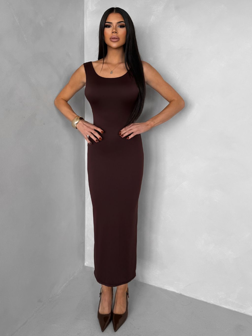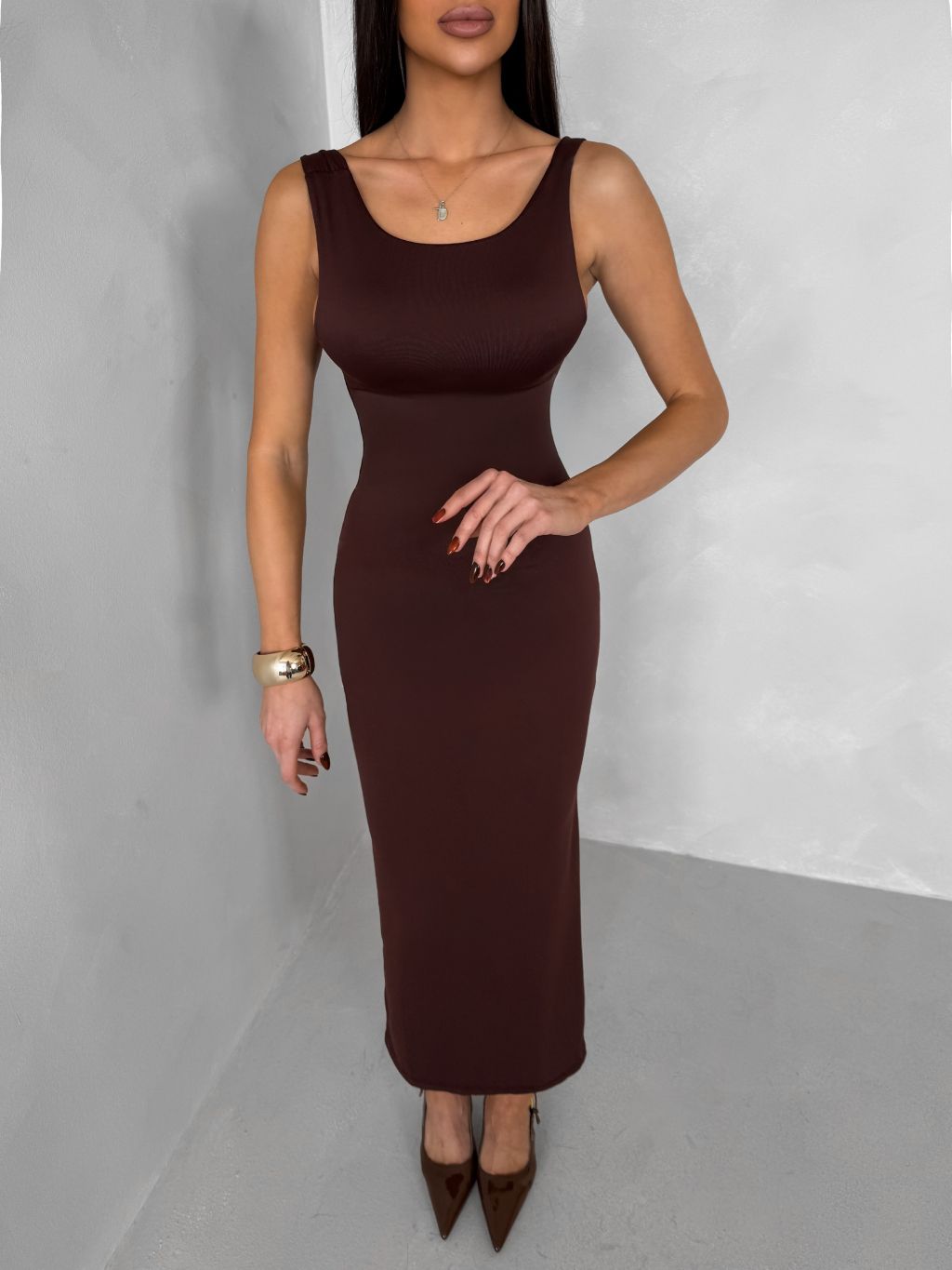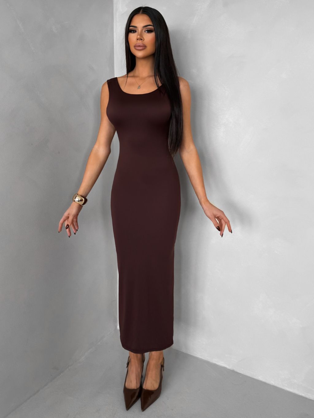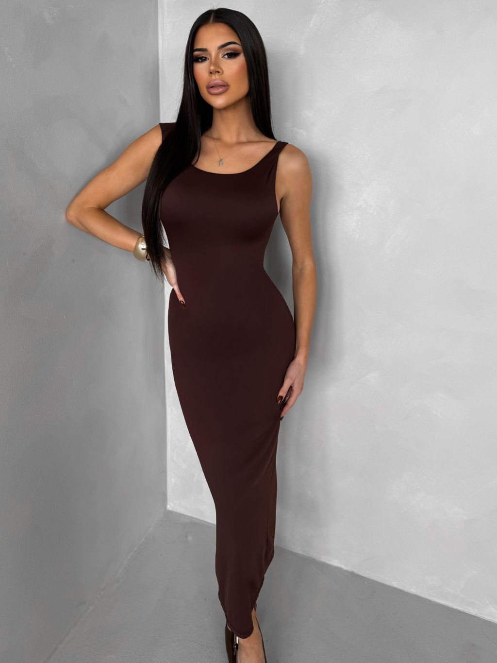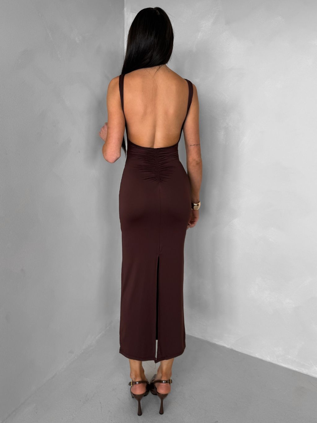 Hnedé priliehavé midi šaty TREVY s odhaleným chrbtom