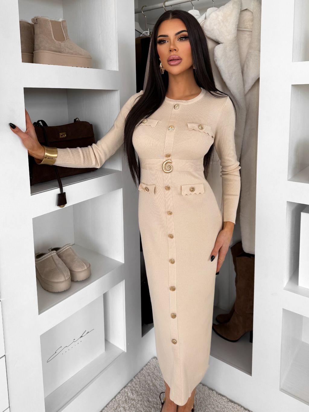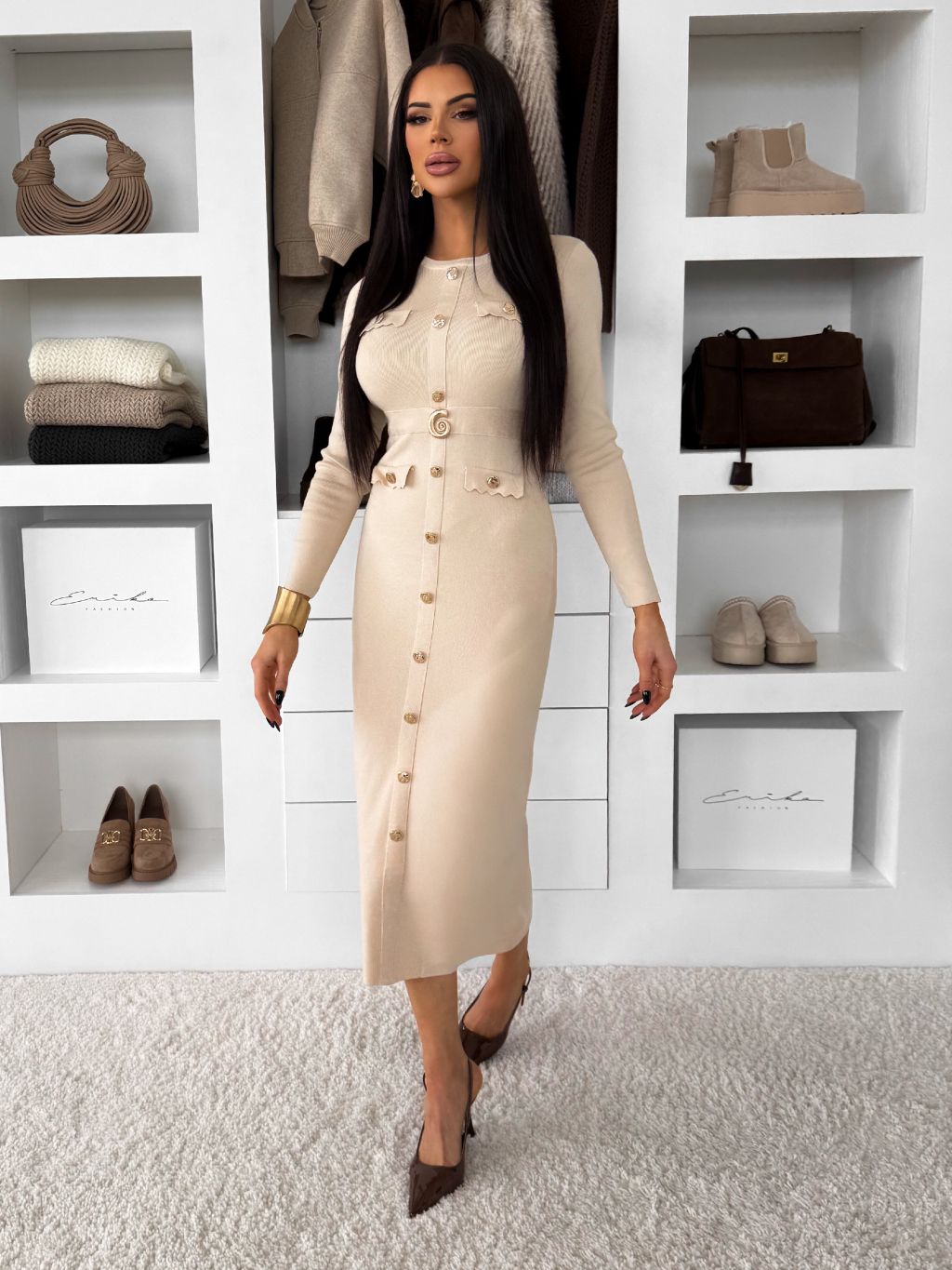 Krémové dlhé šaty CRESTILO s dlhým rukávom