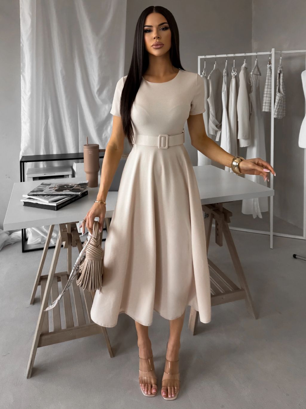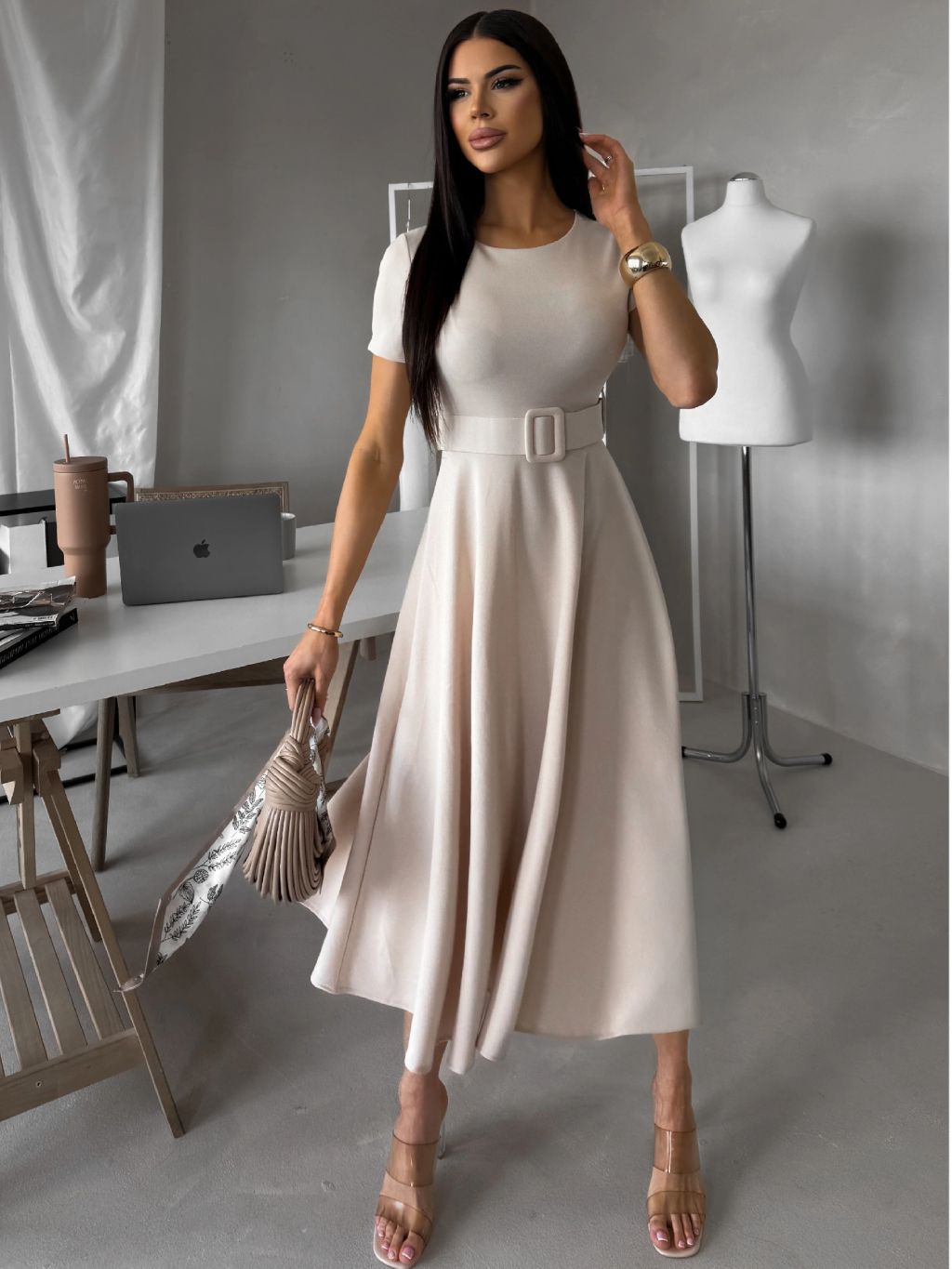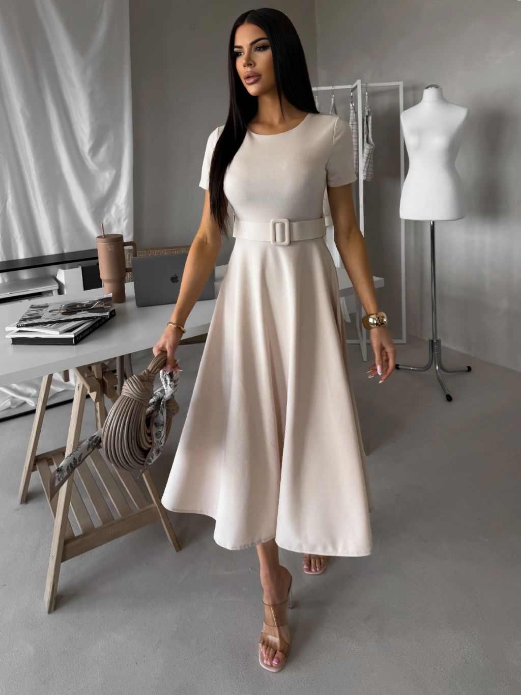 Krémové púzdrové midi áčkové šaty WONDIX s opaskom