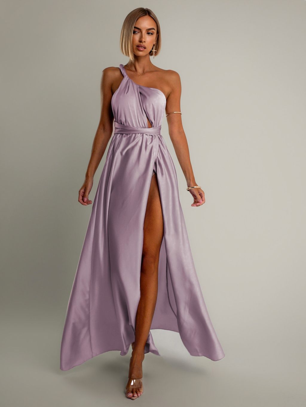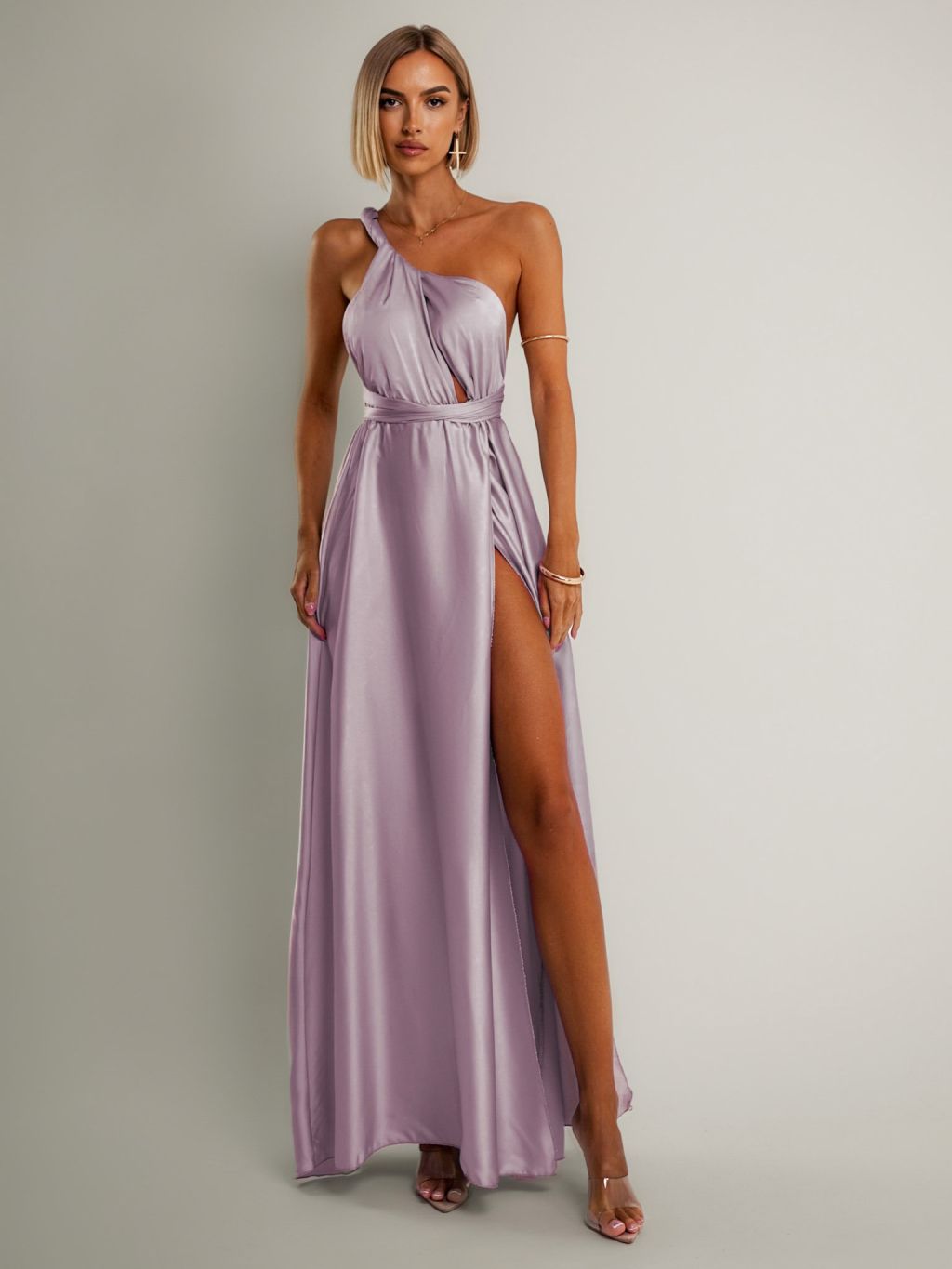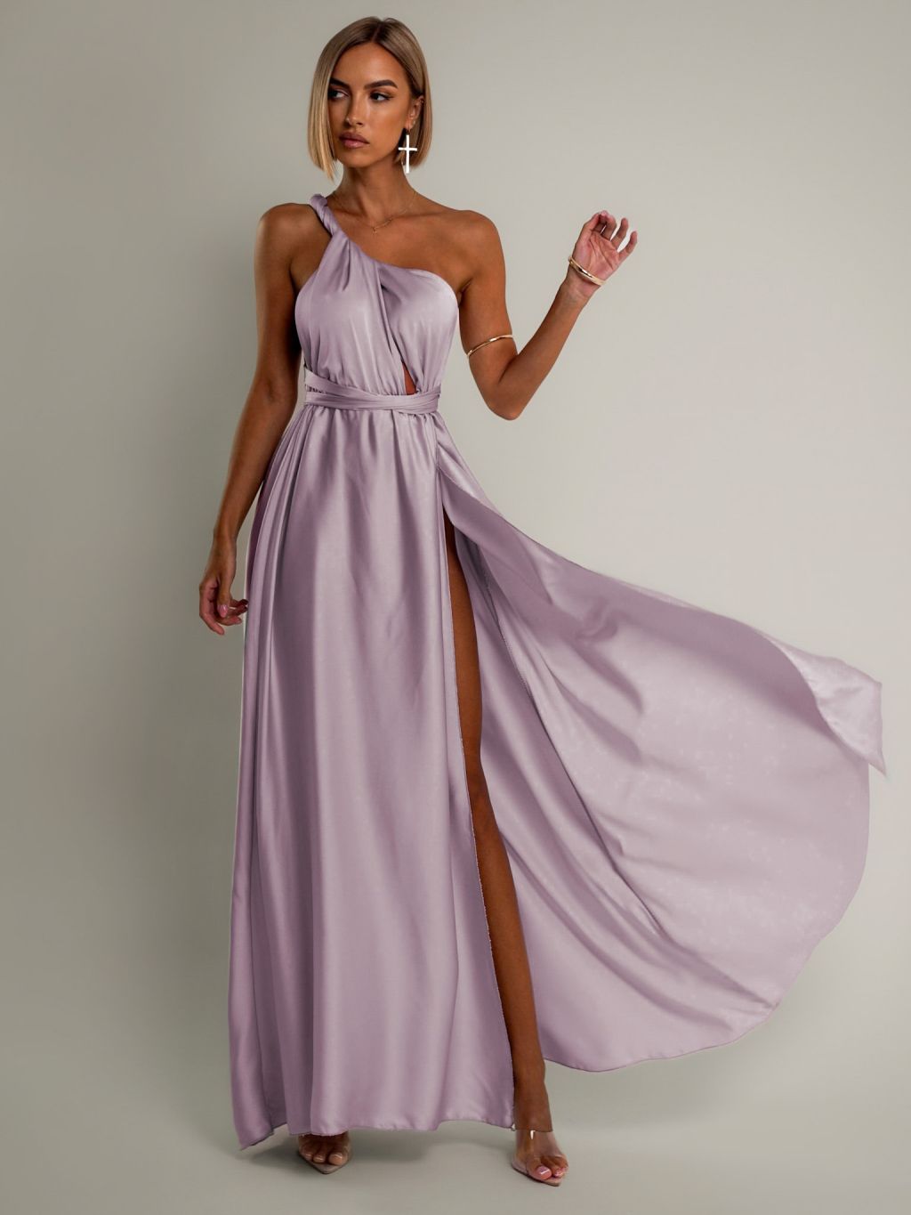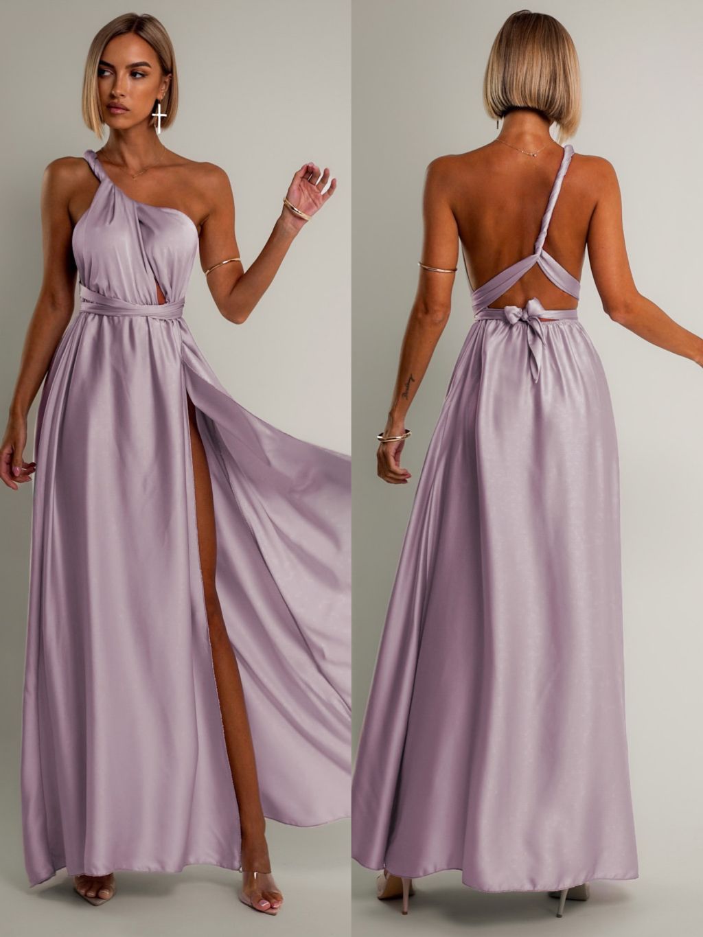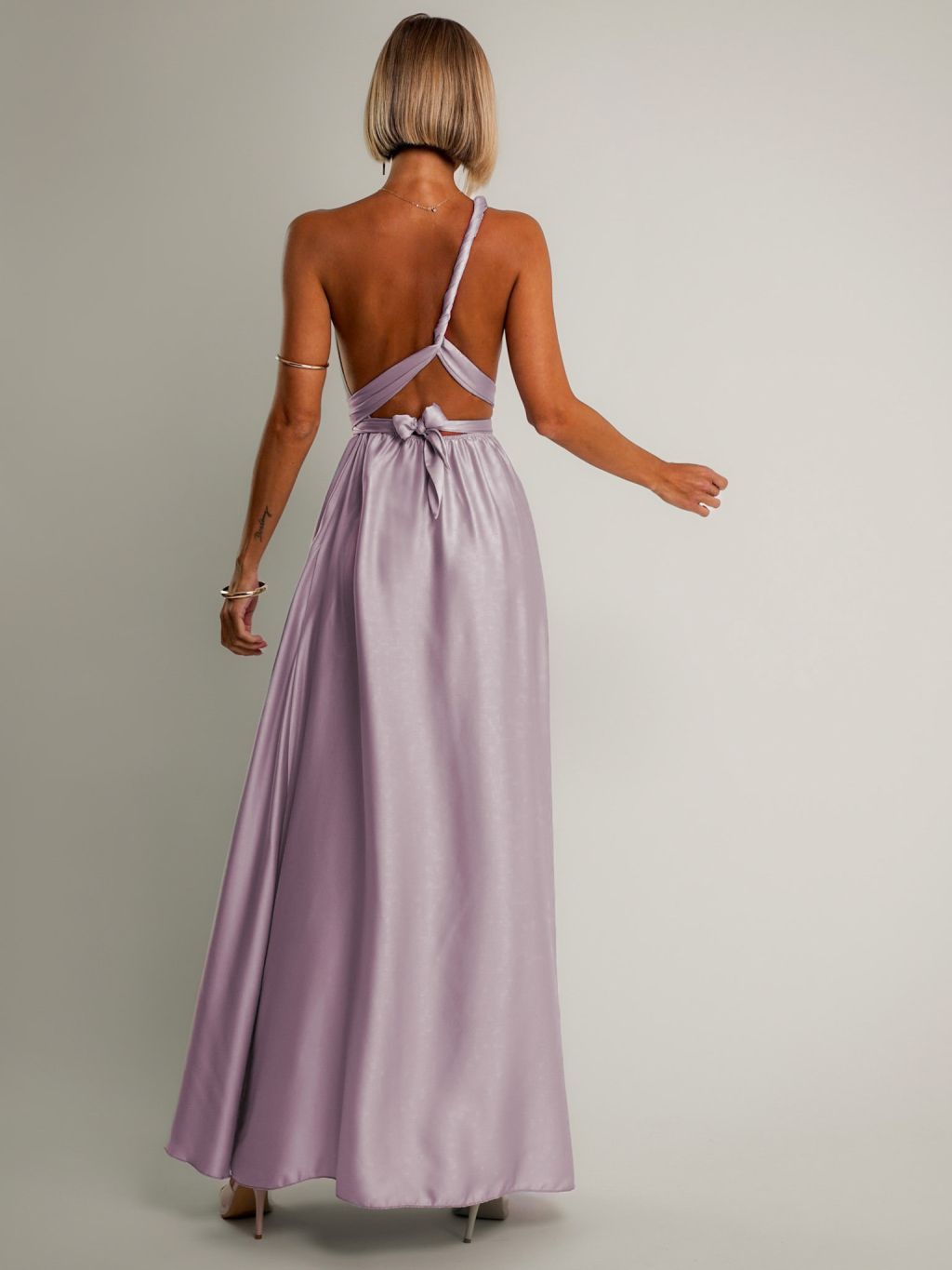 Levanduľové saténové šaty VALERDI s variabilným viazaním a rázporkom