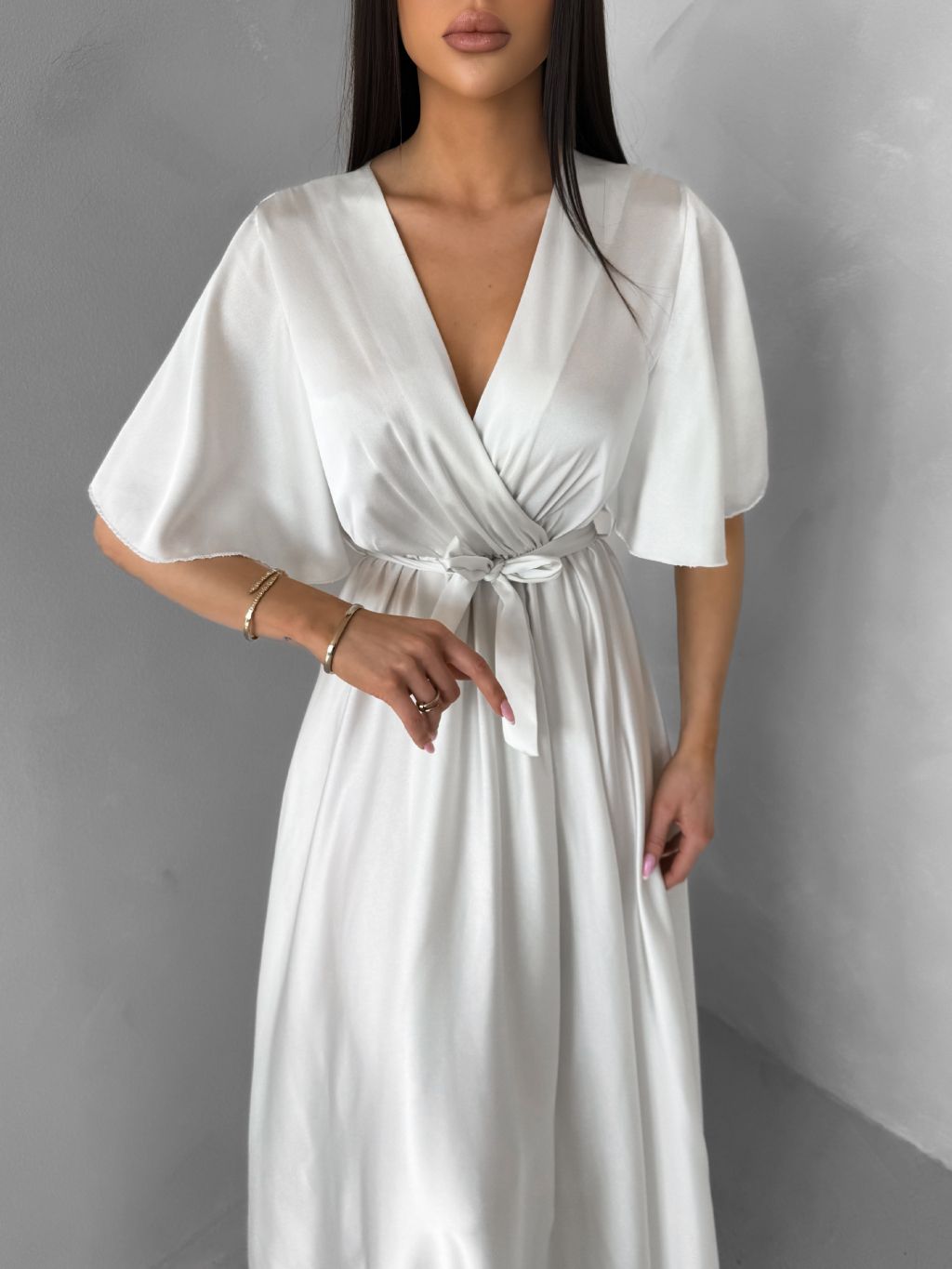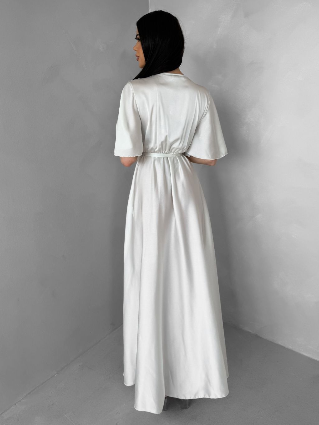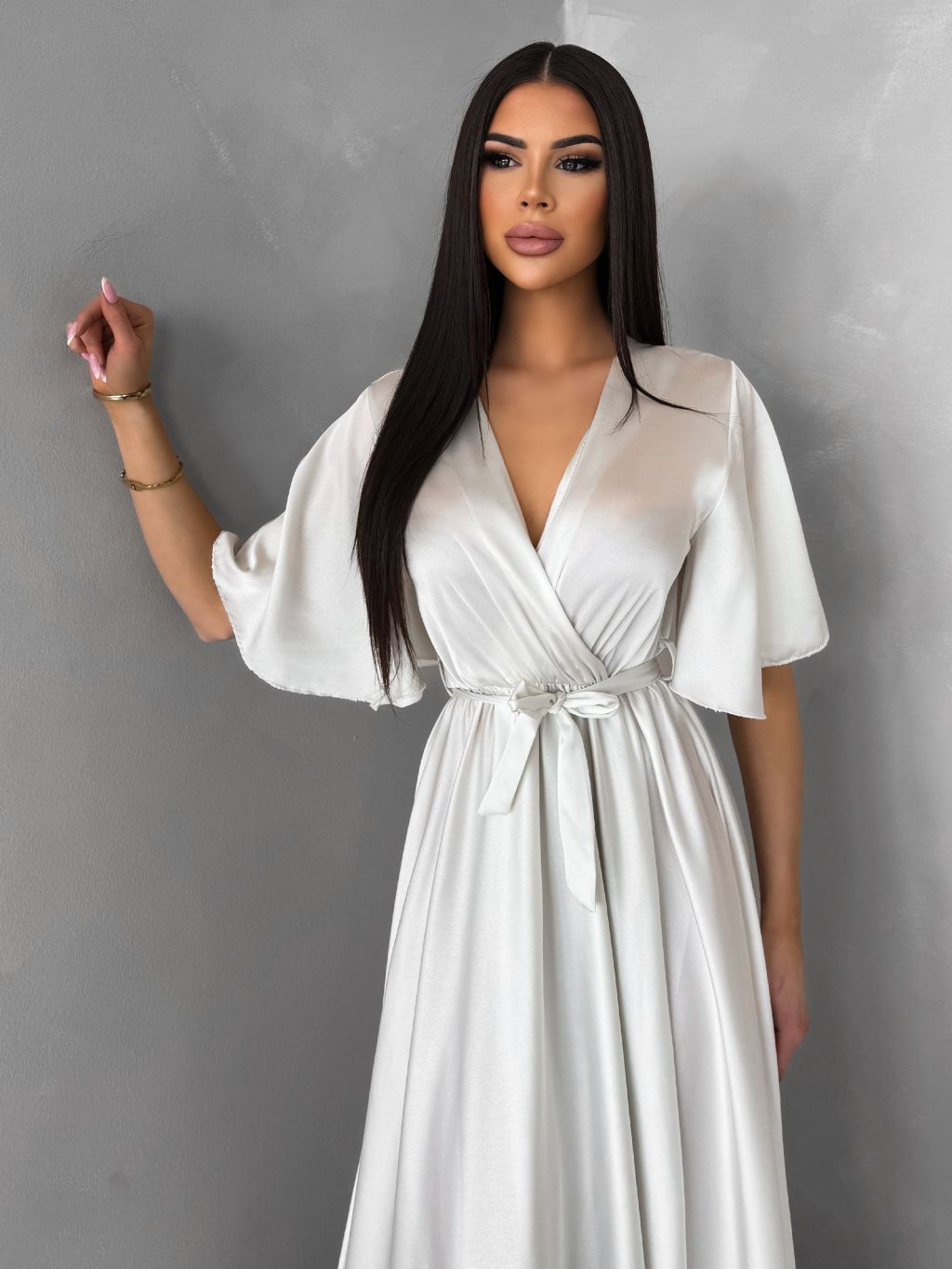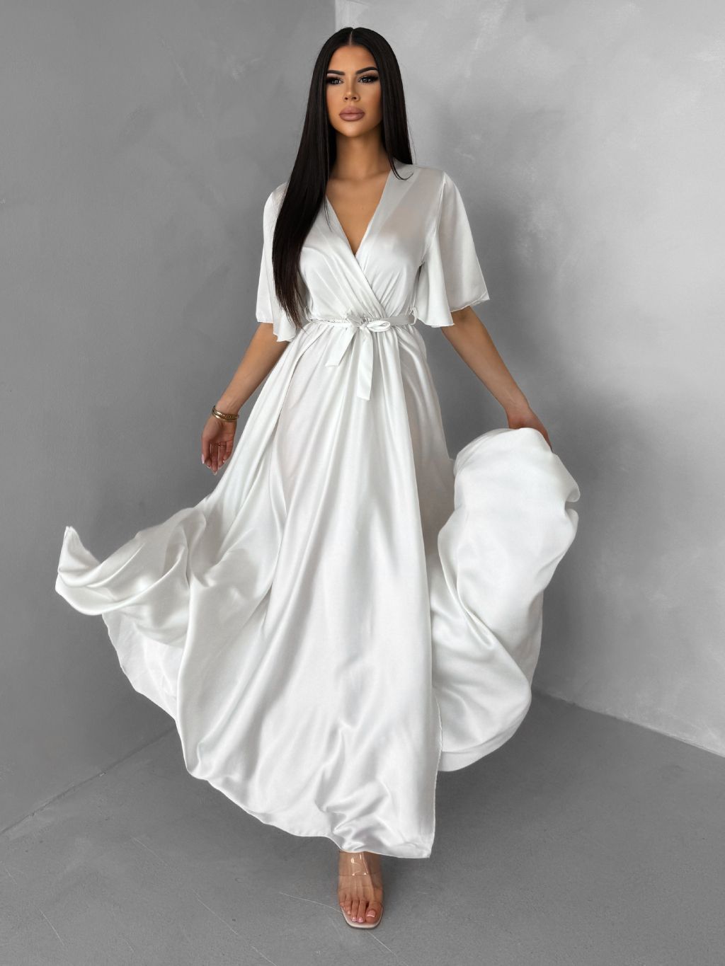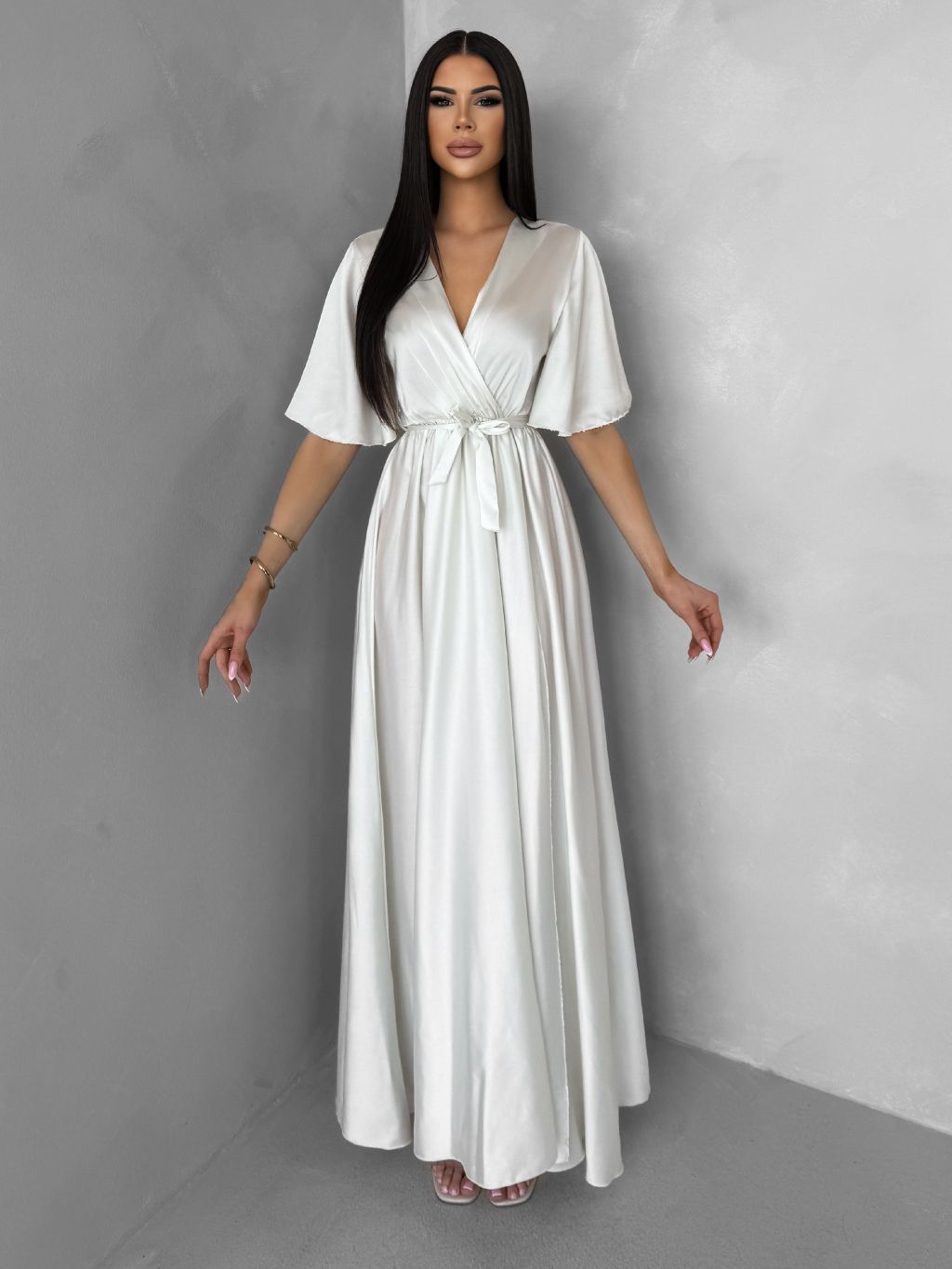 Perleťové dlhé saténové šaty GO HOME s opaskom