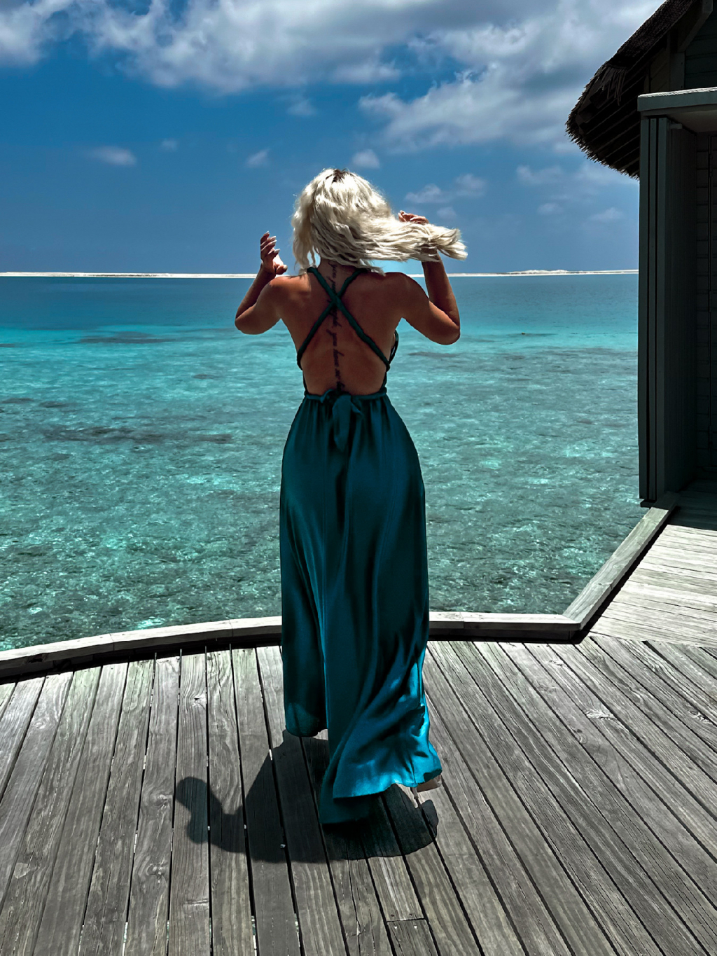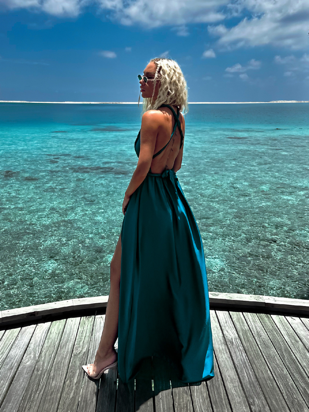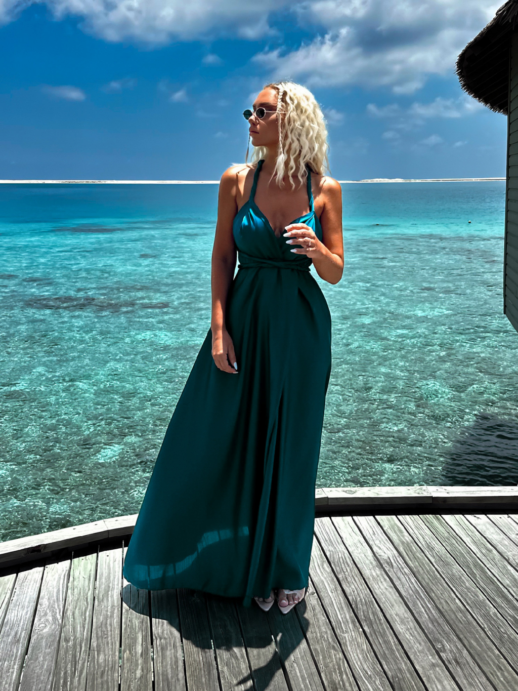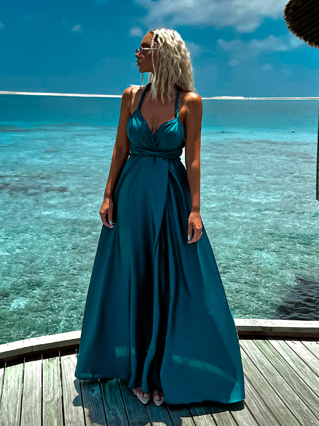 Petrolejové dlhé šaty VALERDI s variabilným viazaním a rázporkom