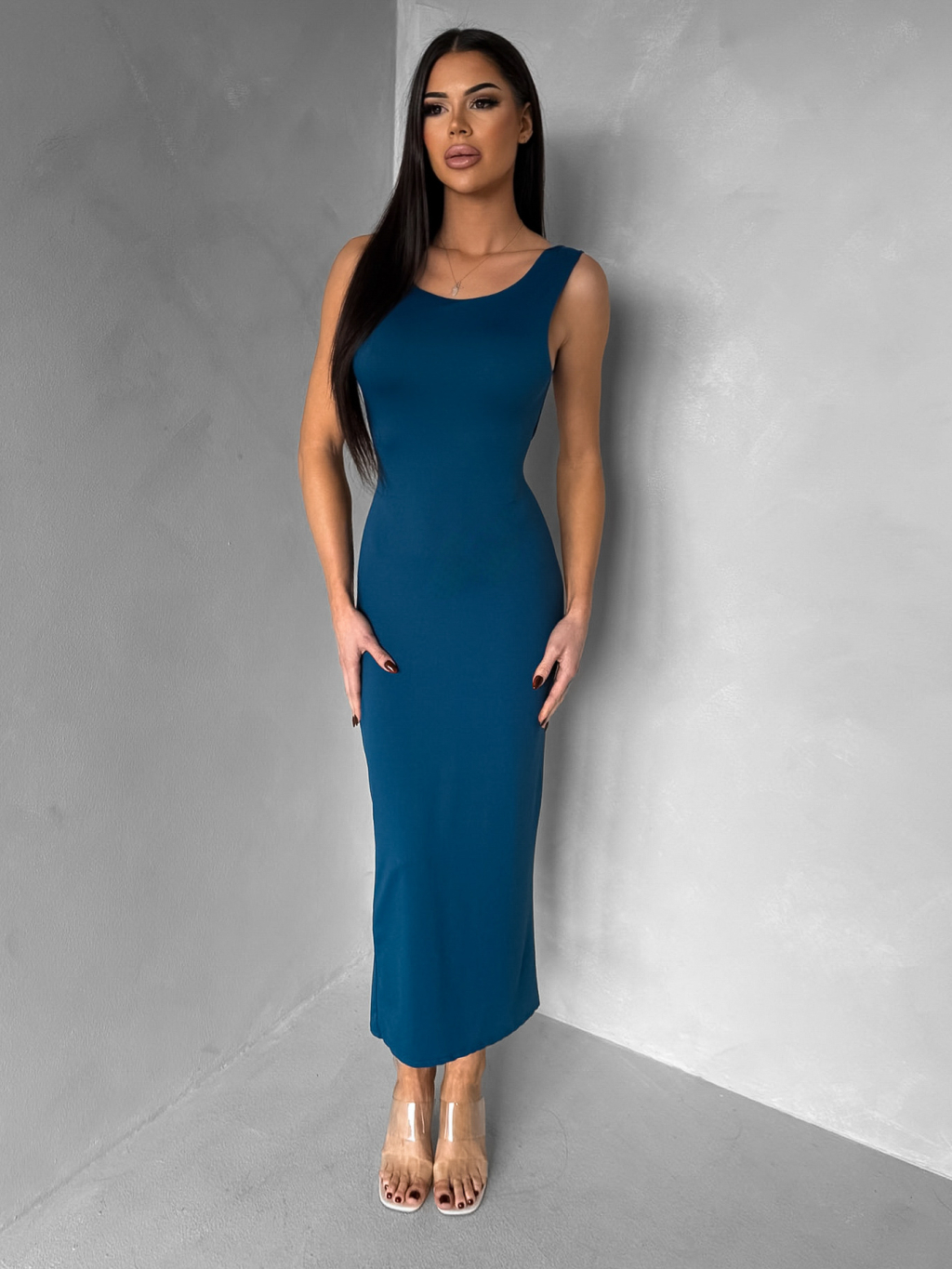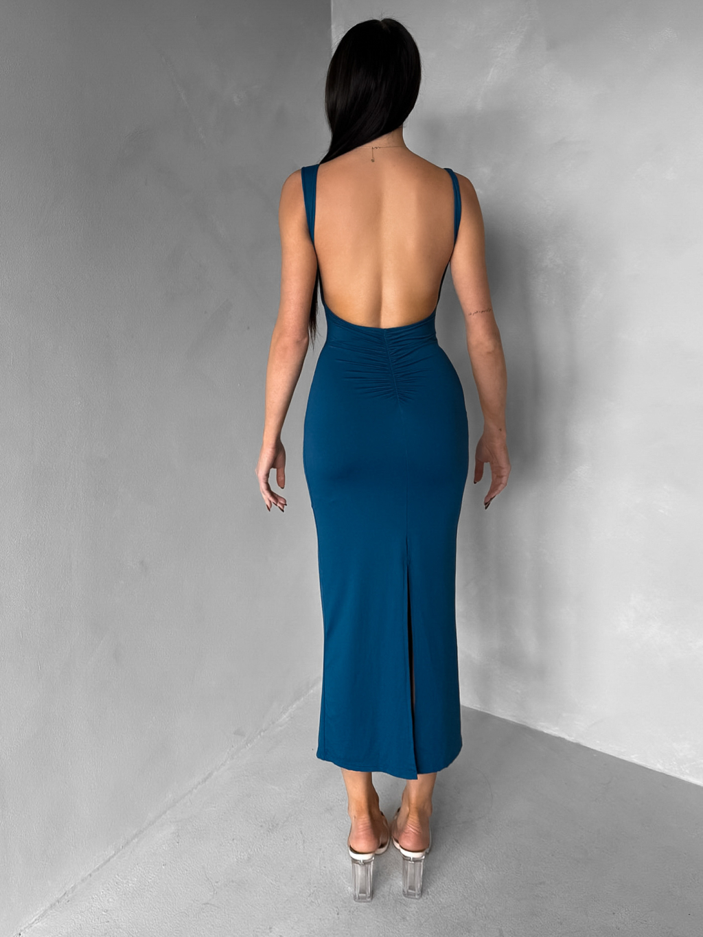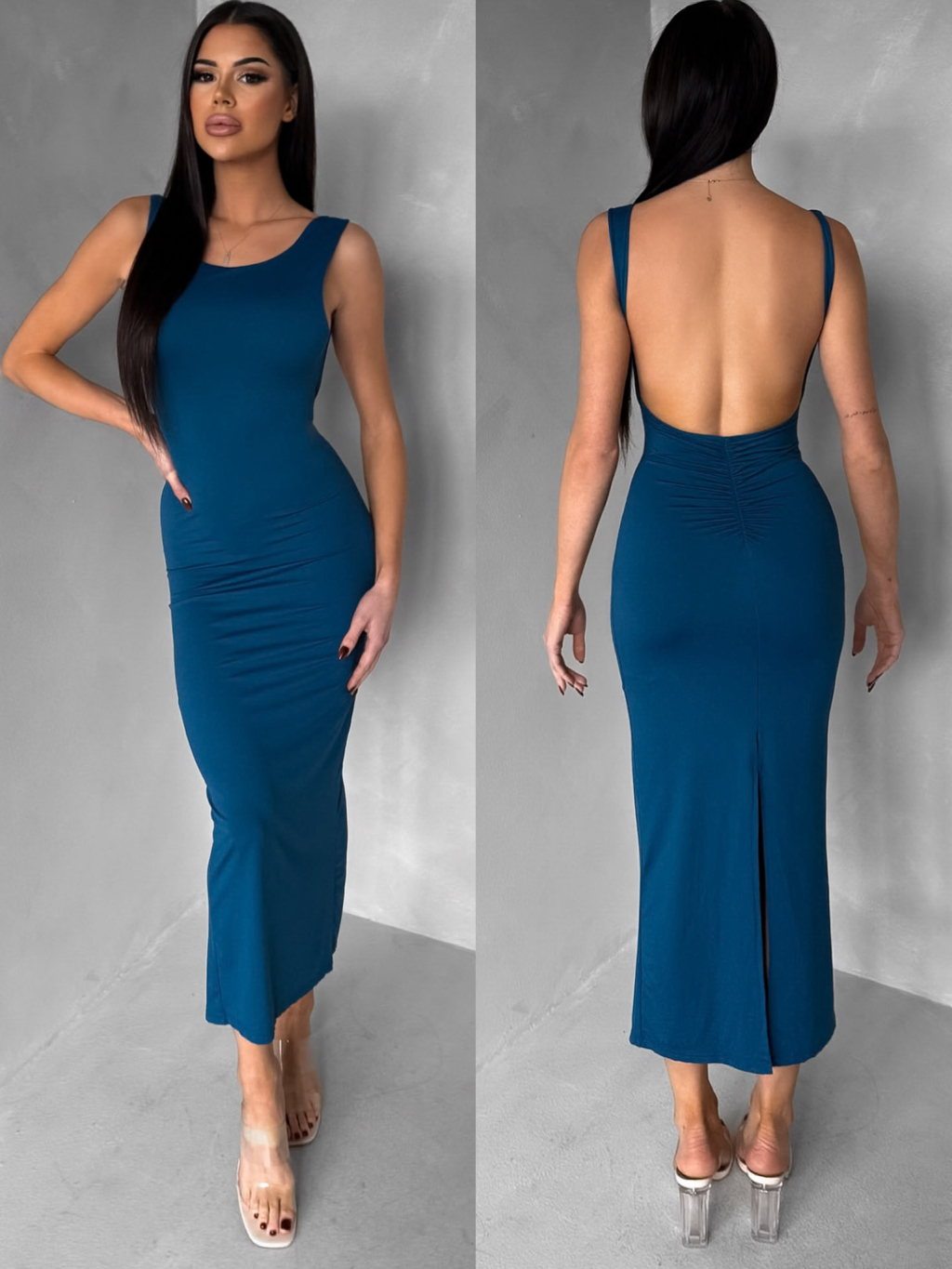 Petrolejové priliehavé midi šaty TREVY s holým chrbtom