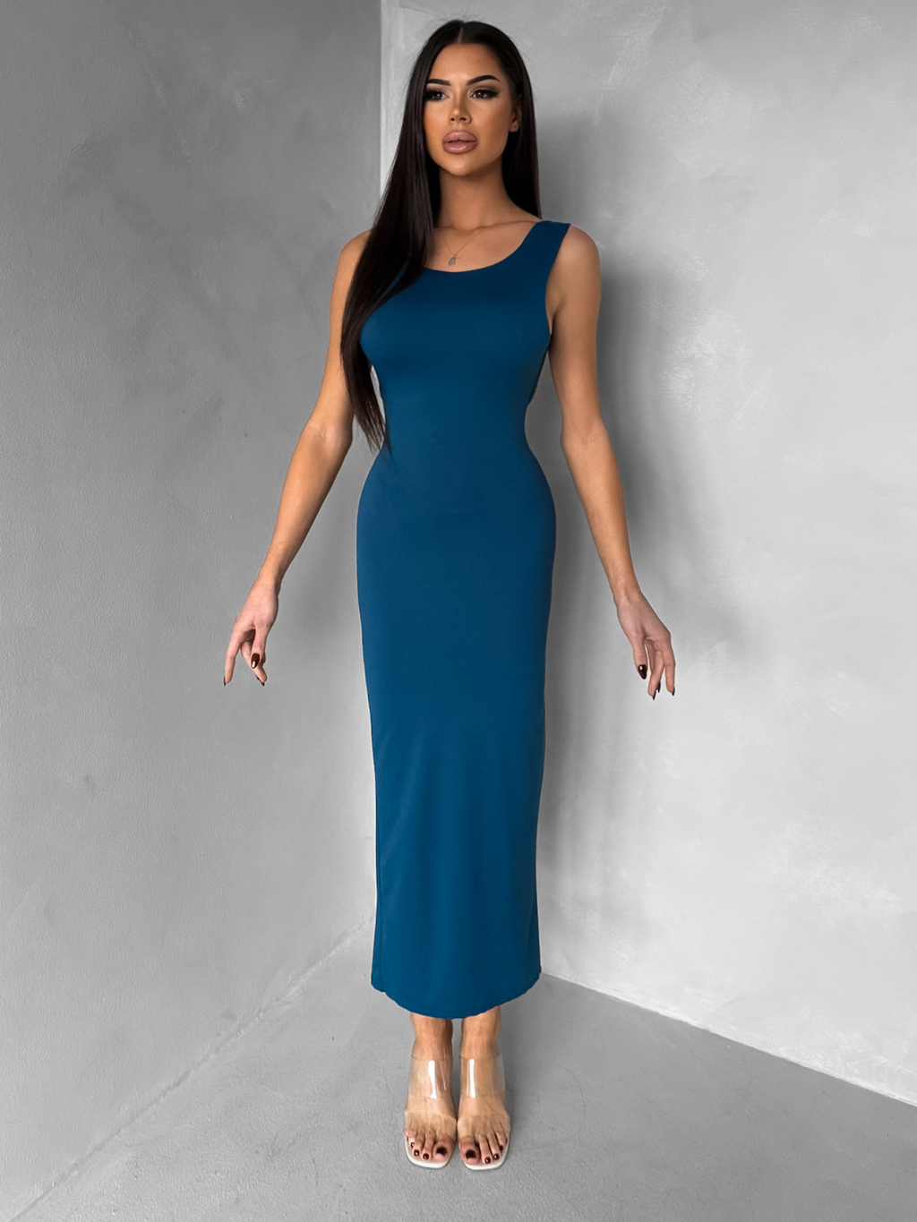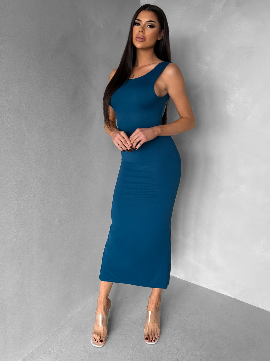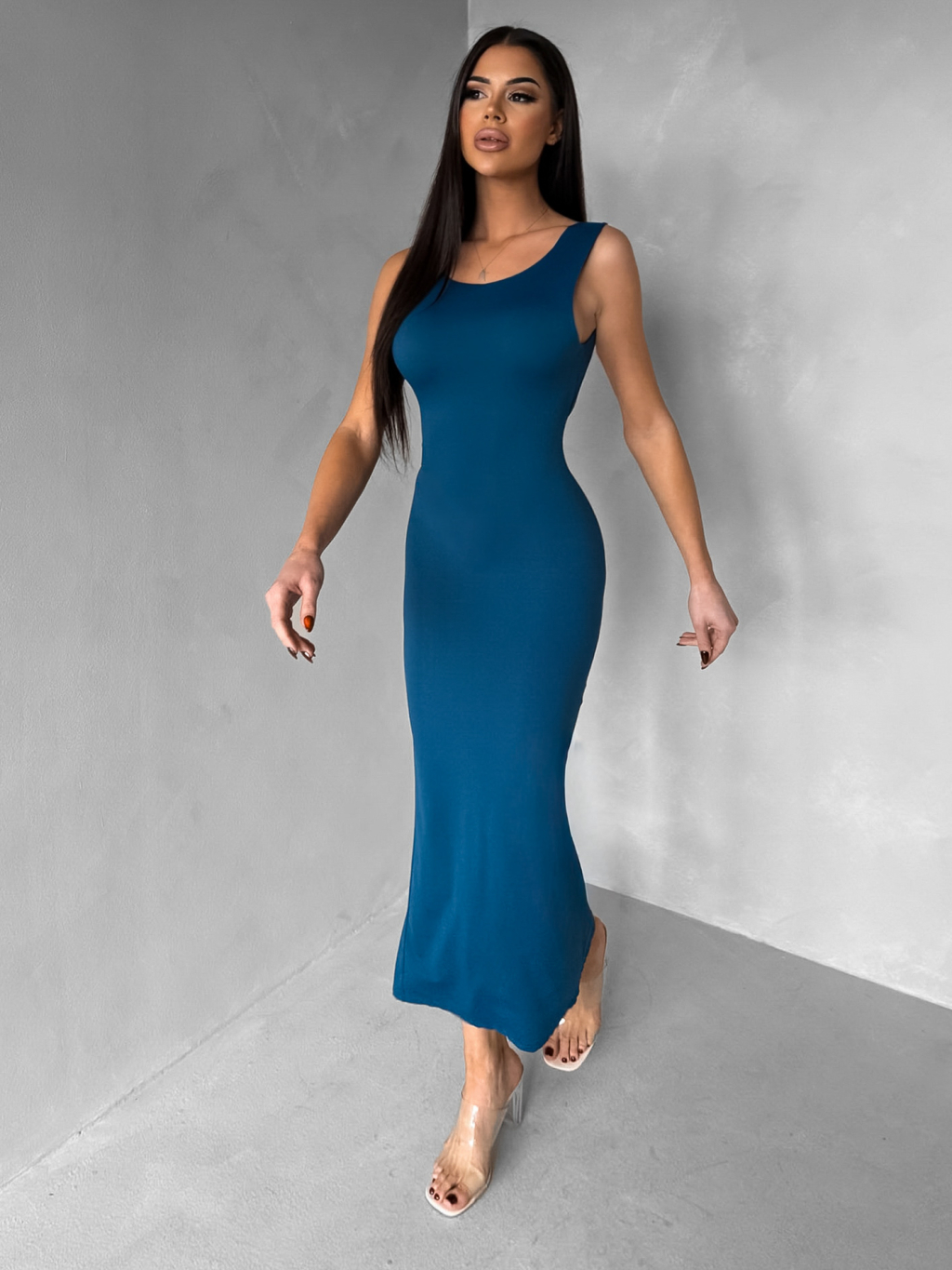 Petrolejové priliehavé midi šaty TREVY s holým chrbtom