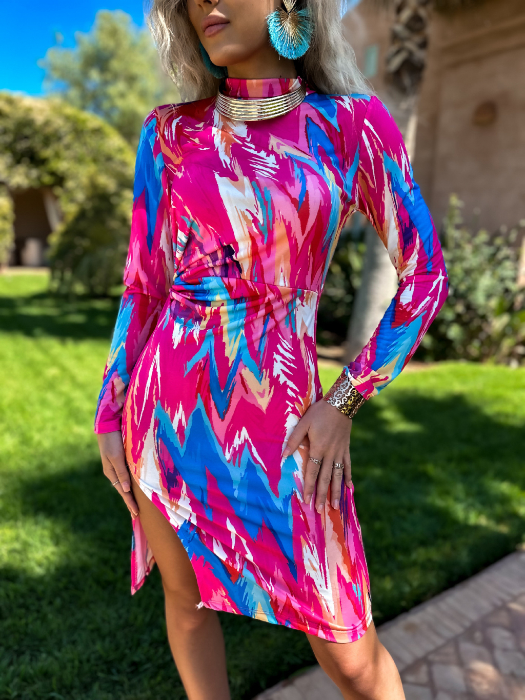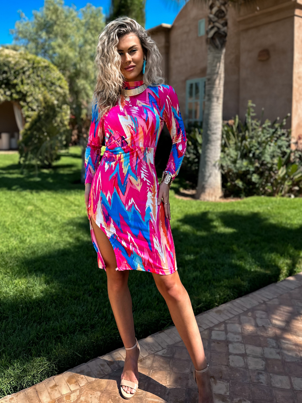 Ružové elastické krátke šaty NEJAT s rázporkom
