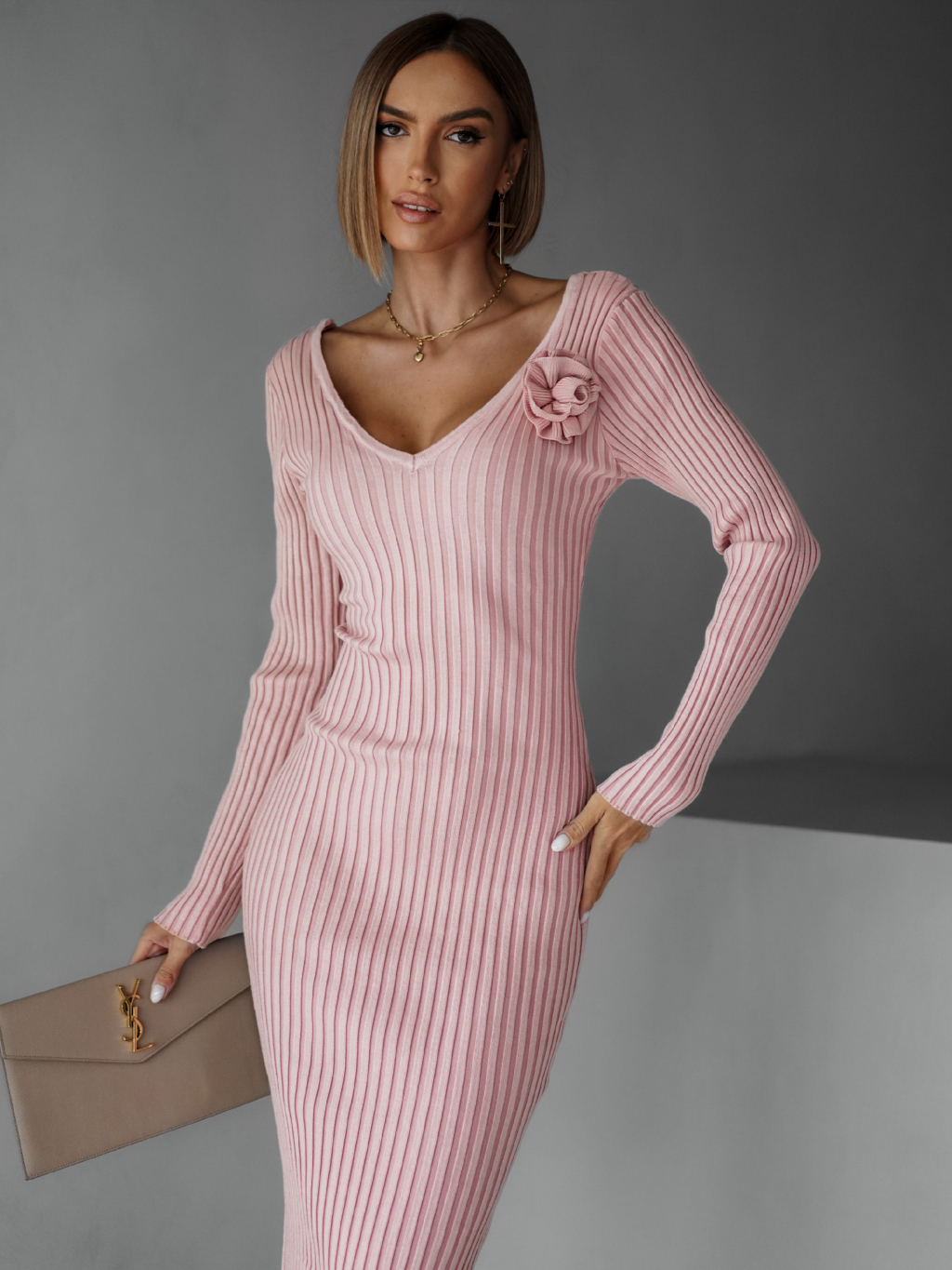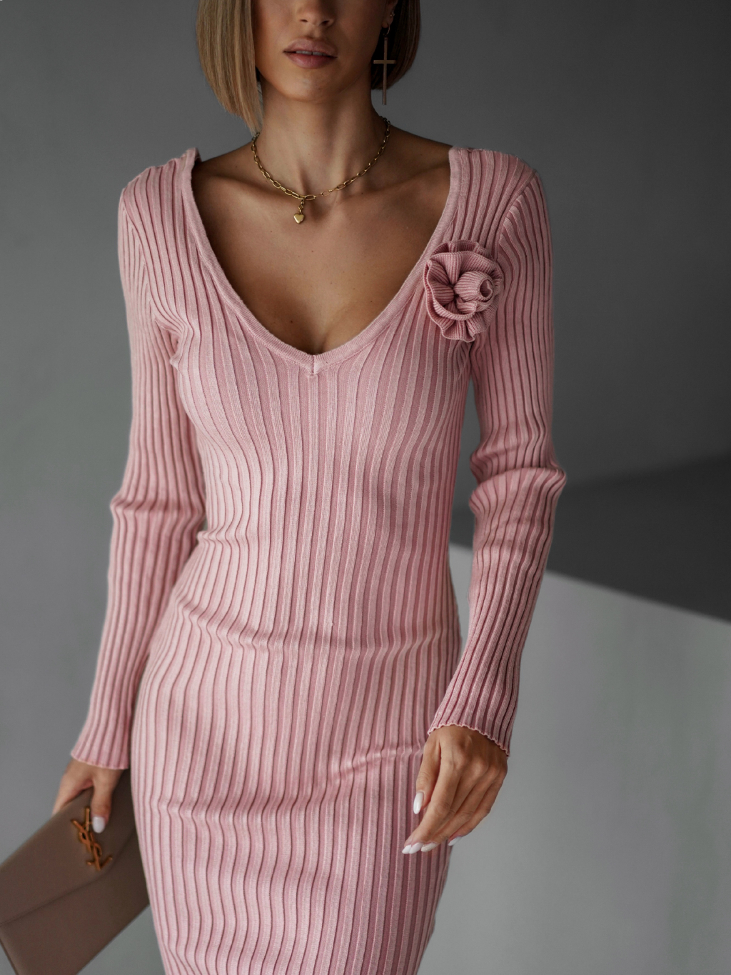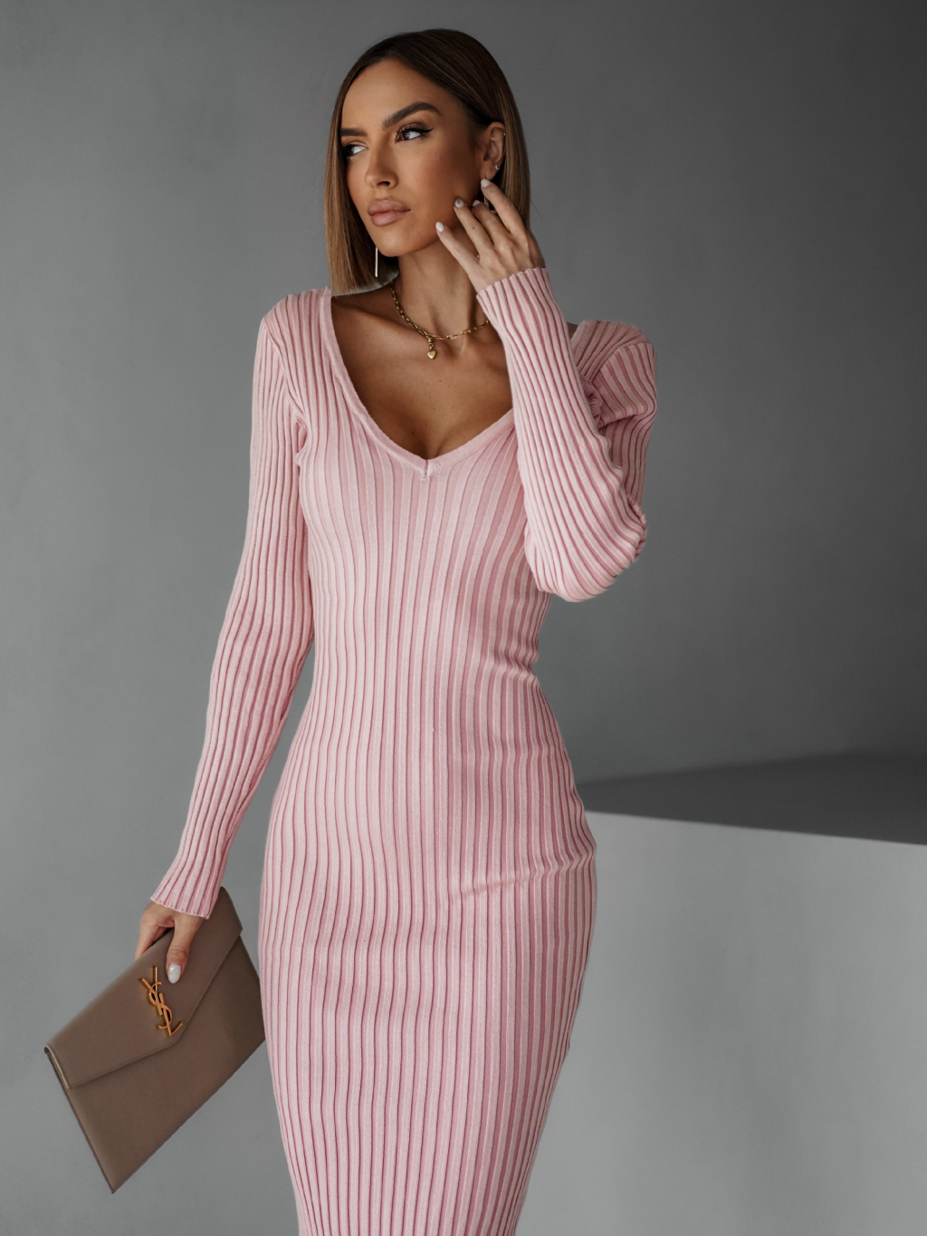 Ružové úpletové šaty VOLALA s výstrihom