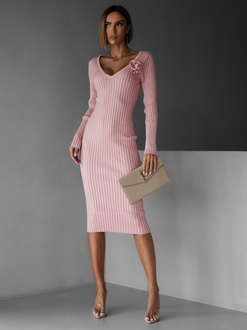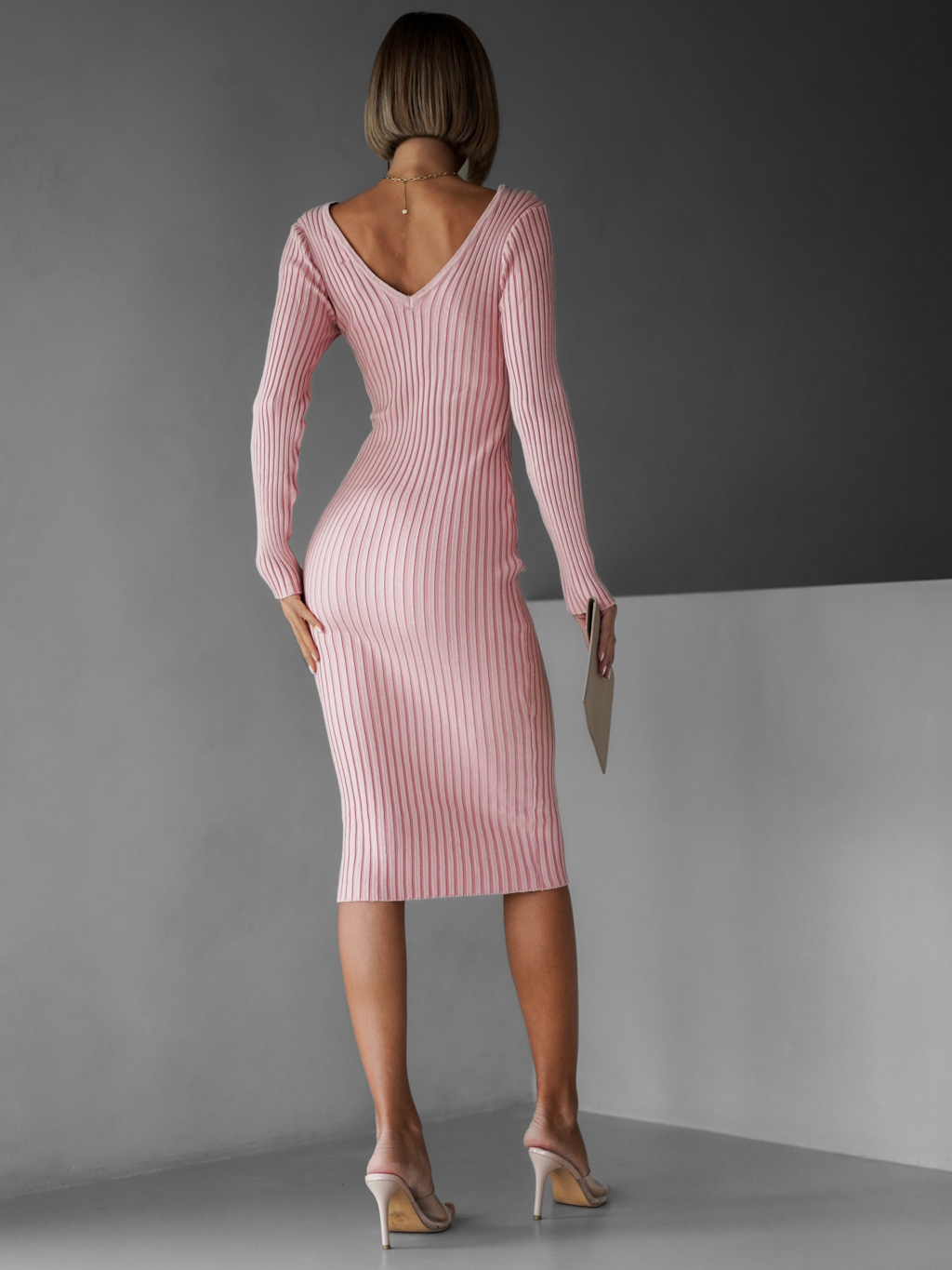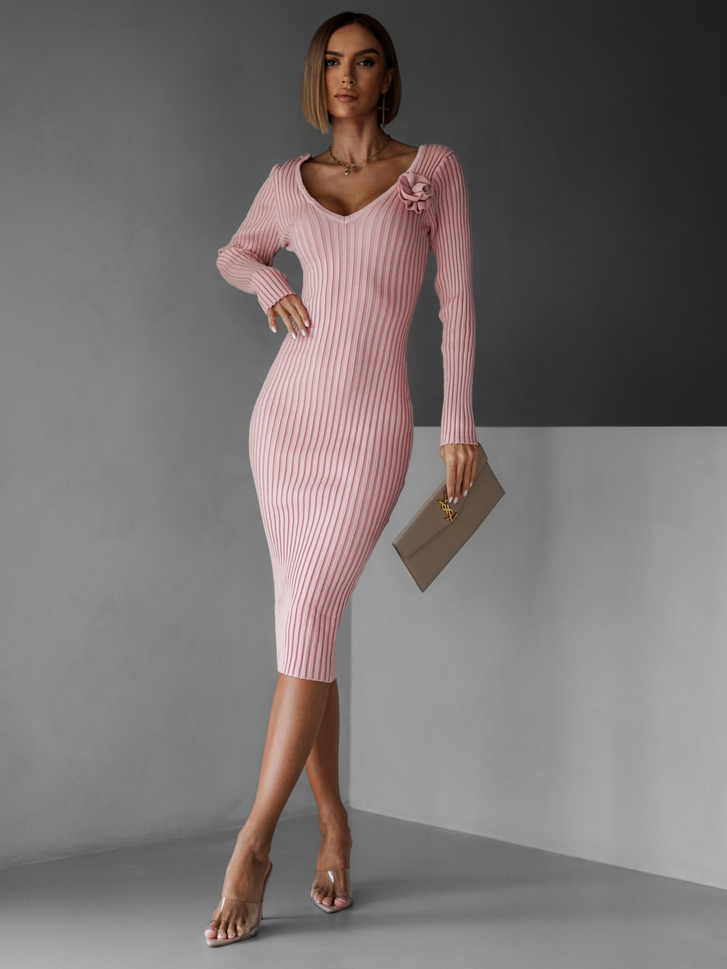 Ružové úpletové šaty VOLALA s výstrihom