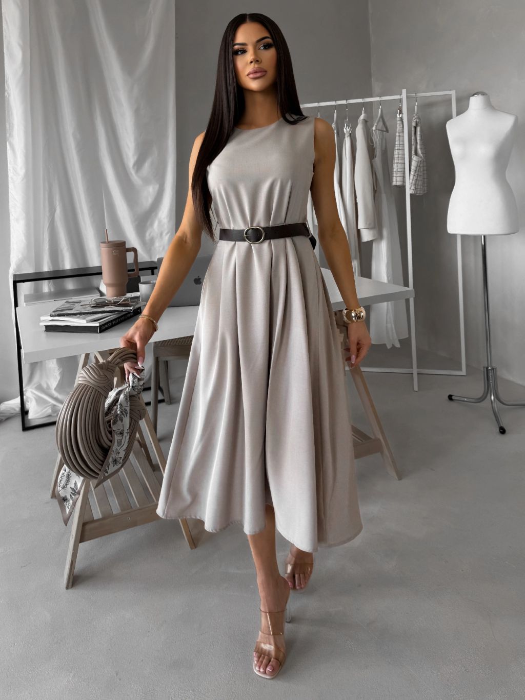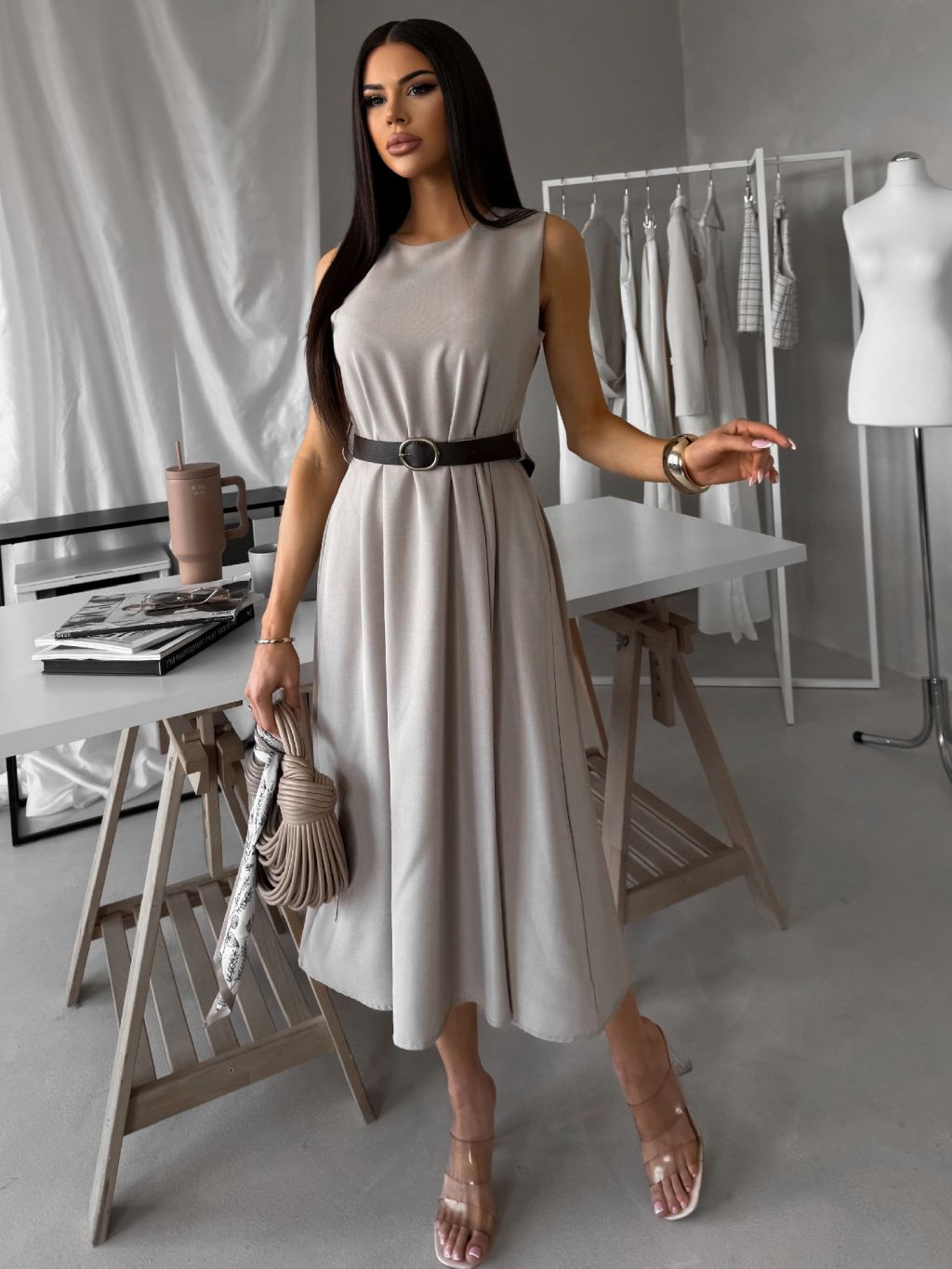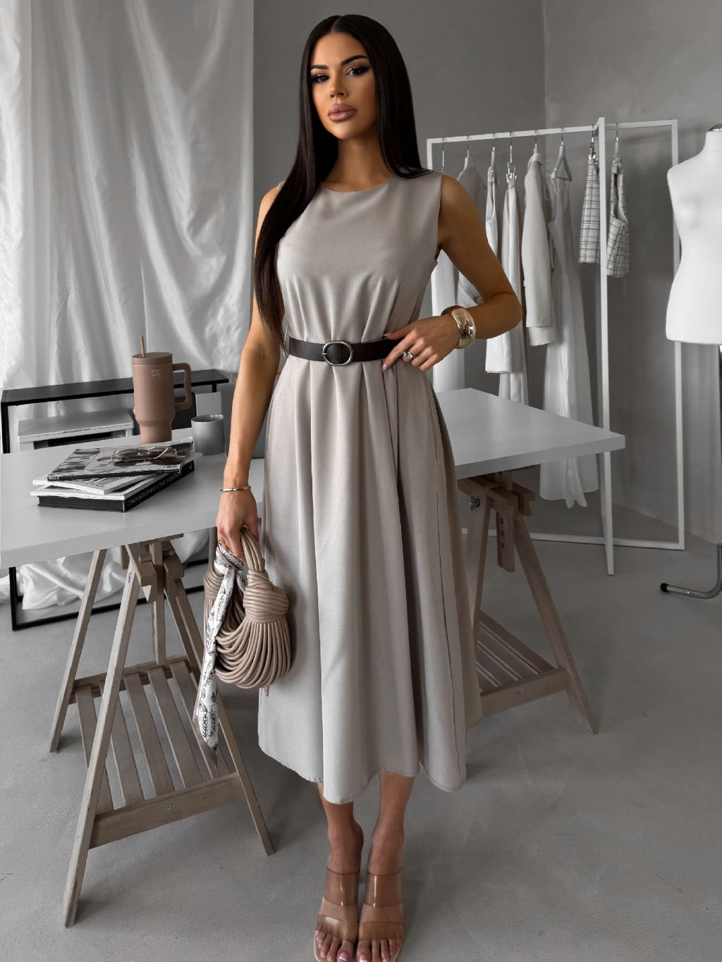 Šedé puzdrové áčkové midi šaty GERARDYS s opaskom