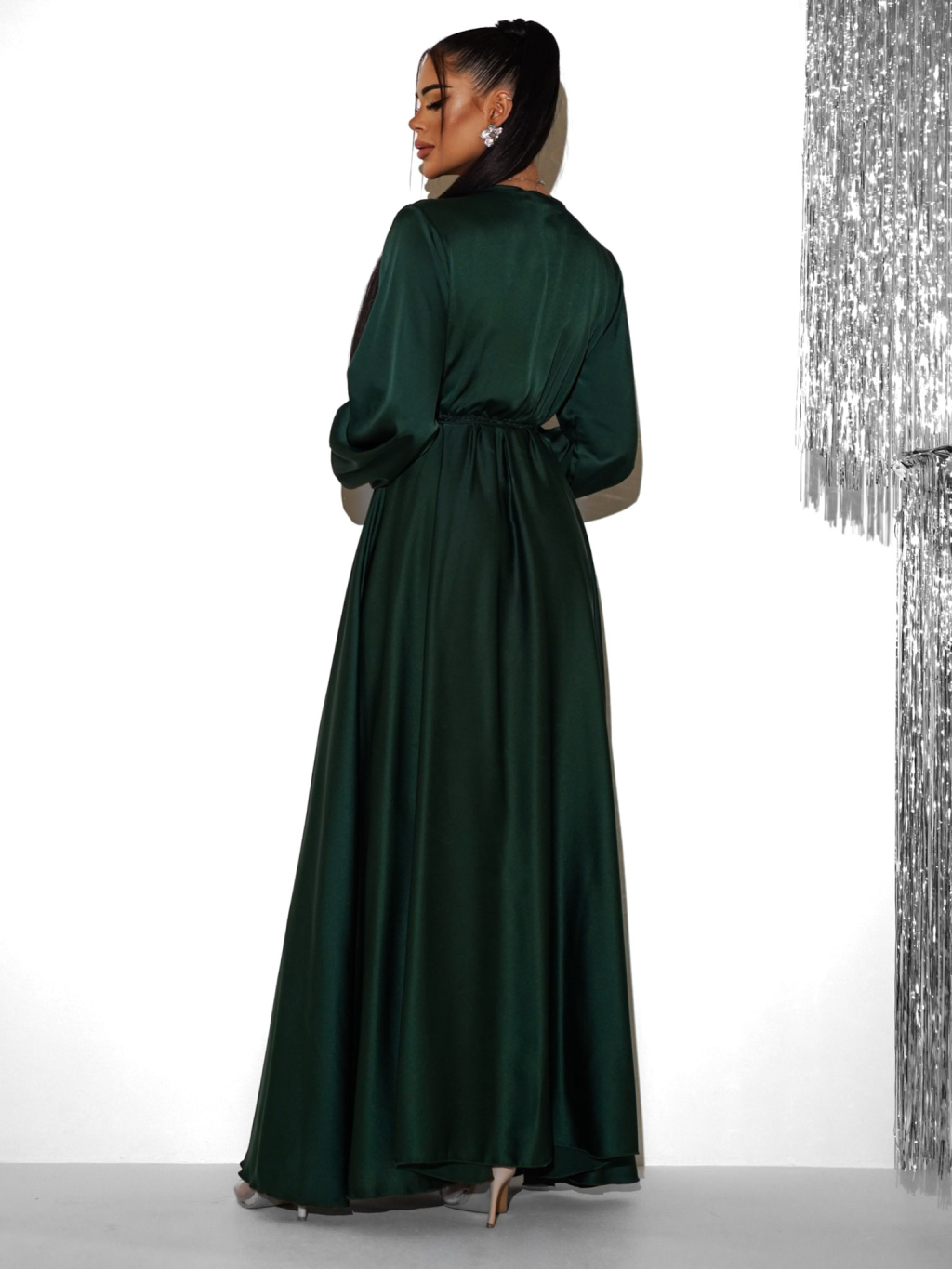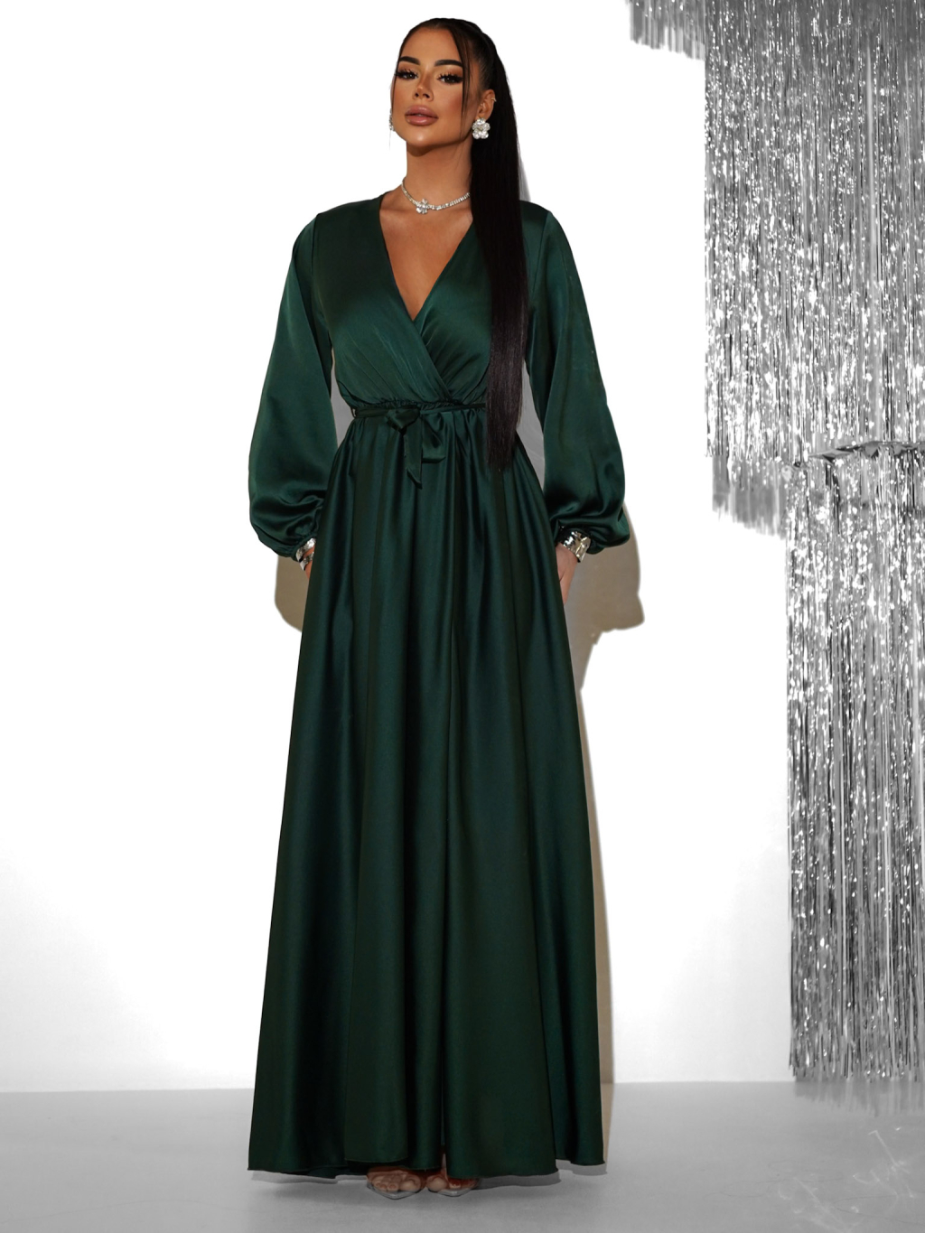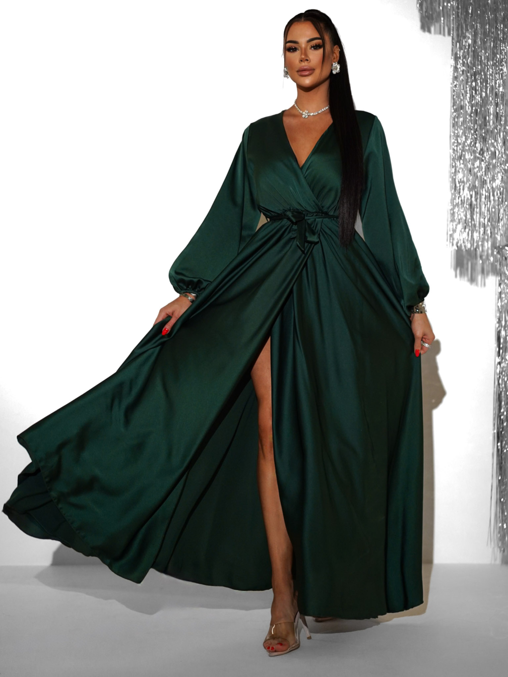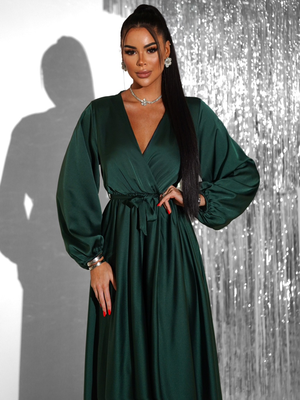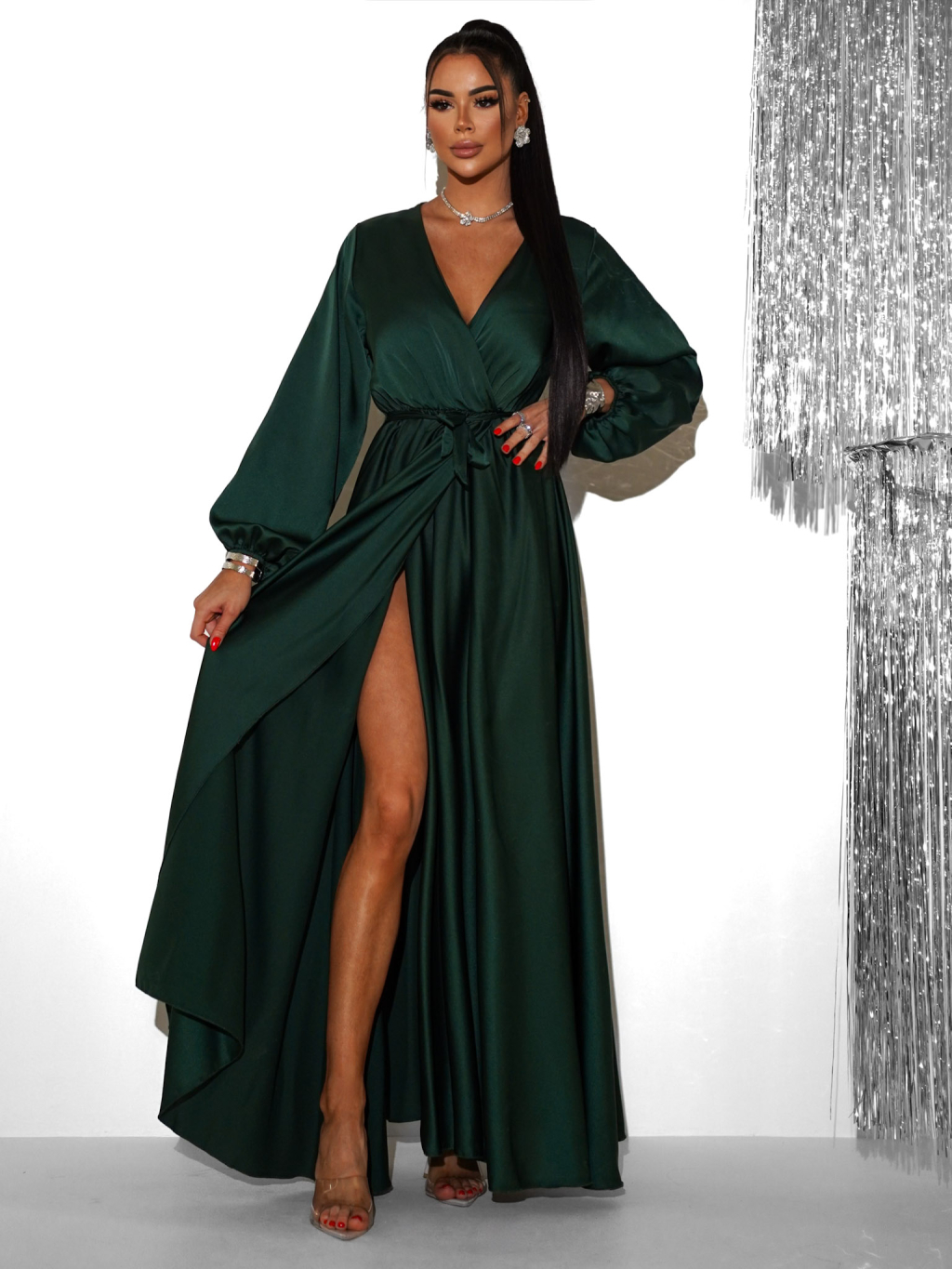 Smaragdové saténové maxi šaty WOMAN s dlhým rukávom