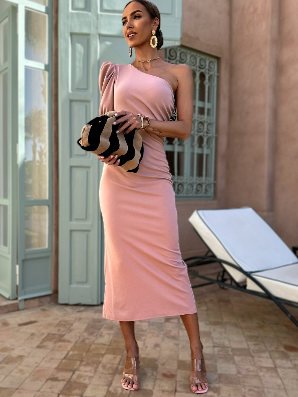 Staroružové dlhé šaty ROMANES na jedno rameno