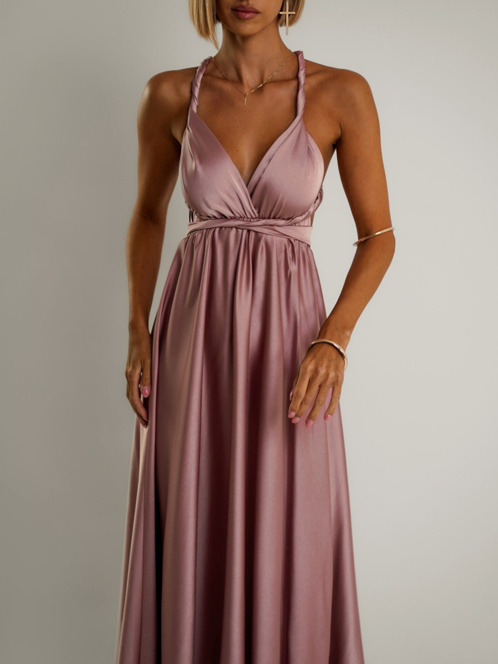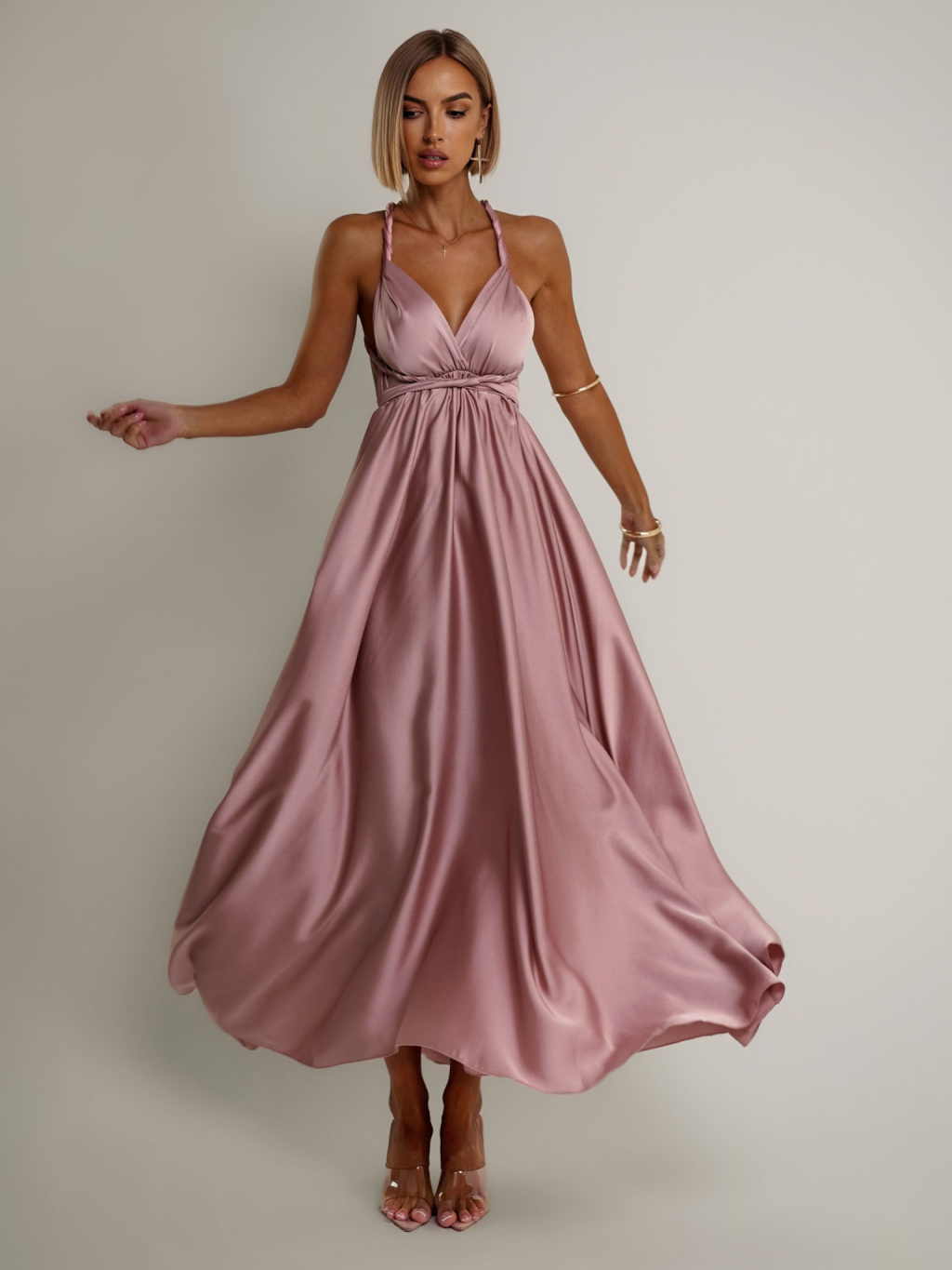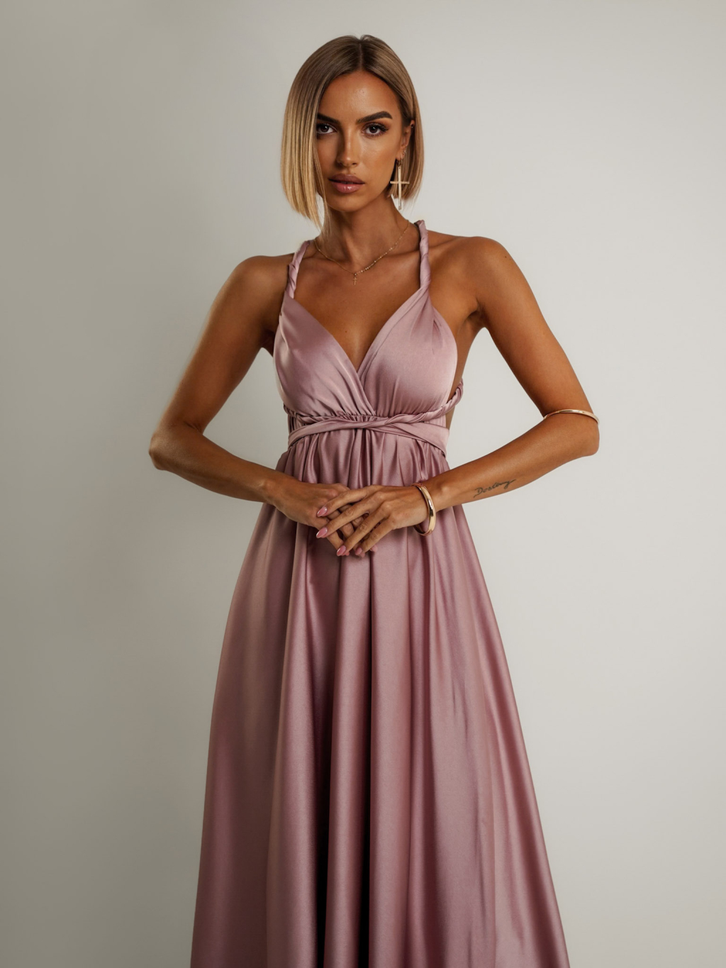 Staroružové lesklé šaty VALERDY s variabilným viazaním / bez rázporku