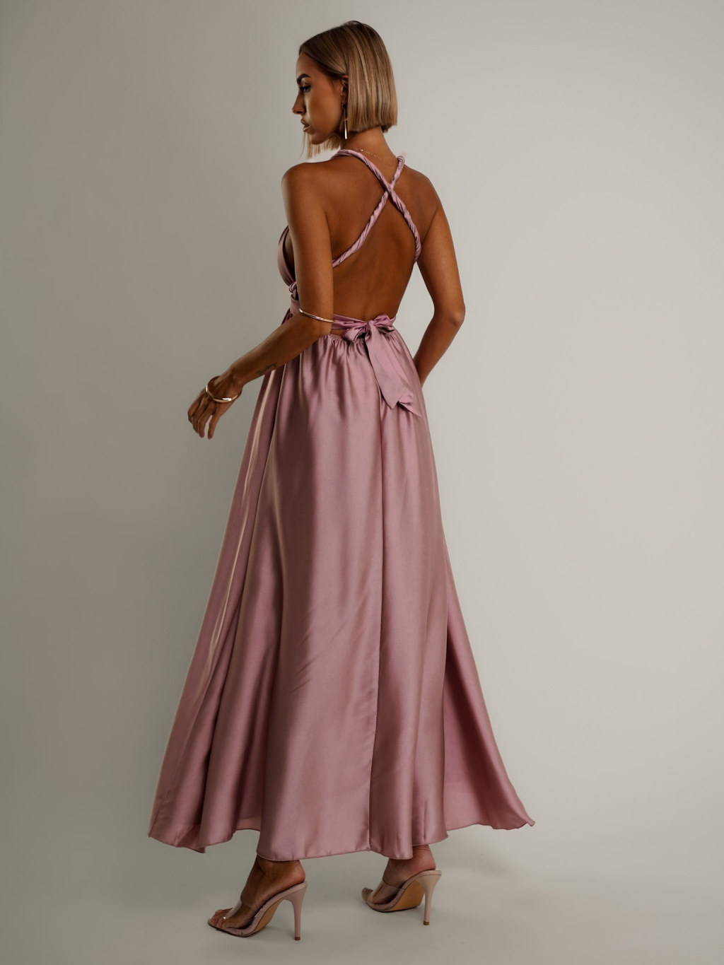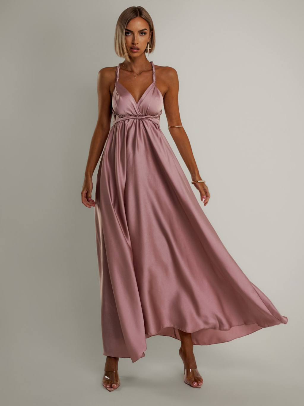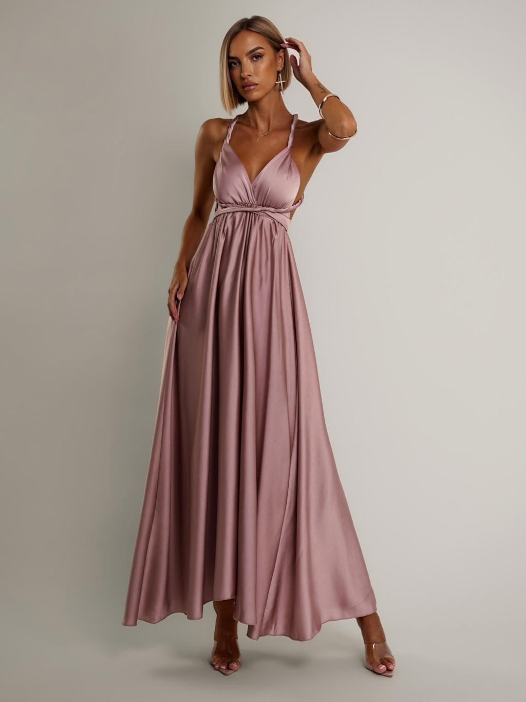 Staroružové lesklé šaty VALERDY s variabilným viazaním / bez rázporku