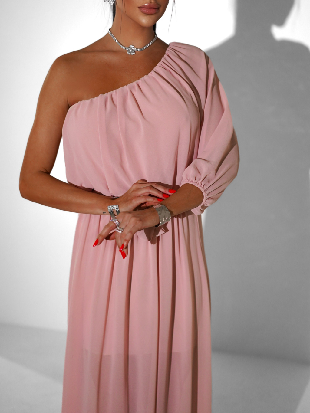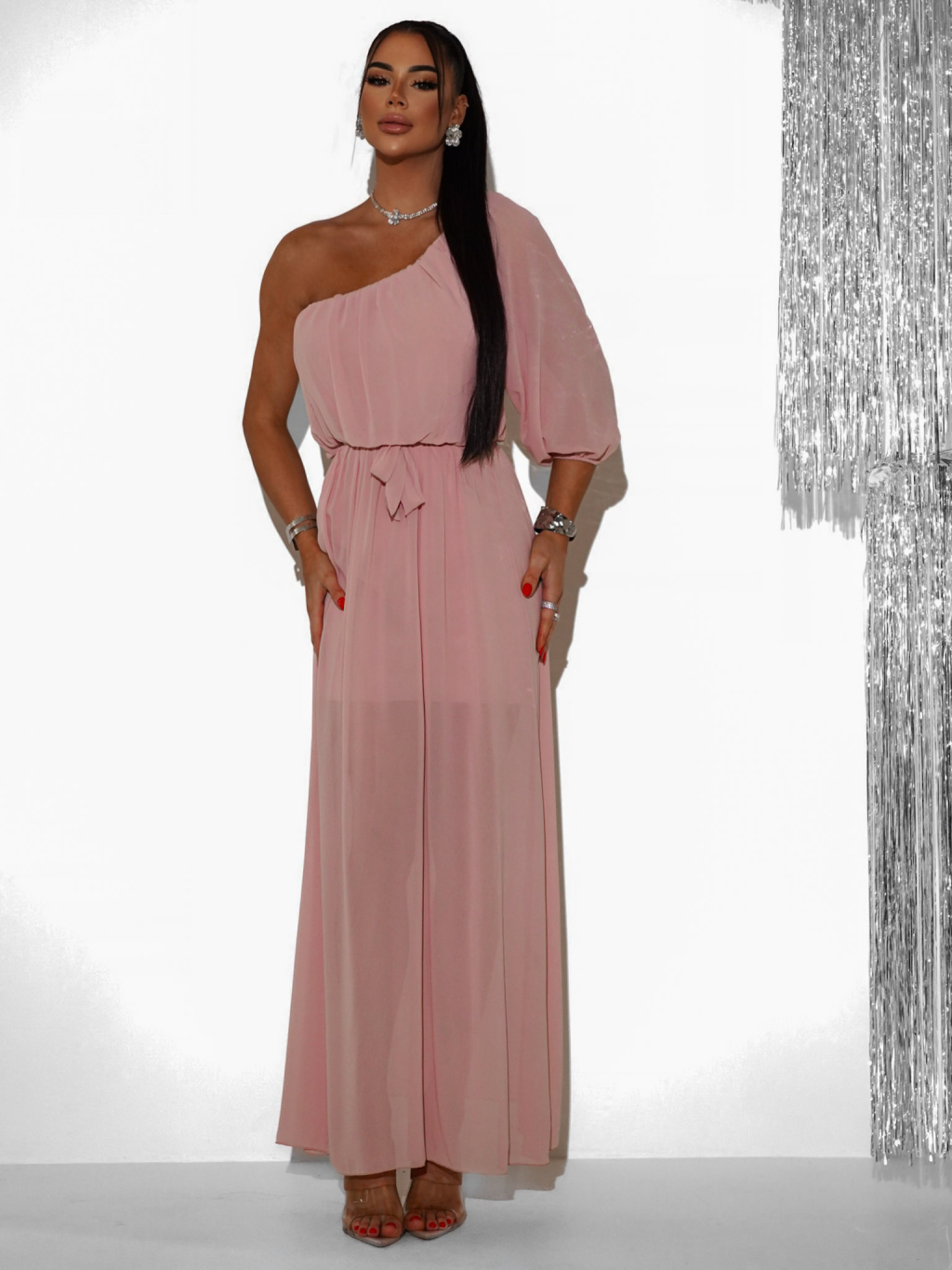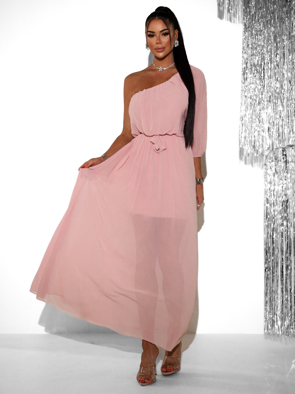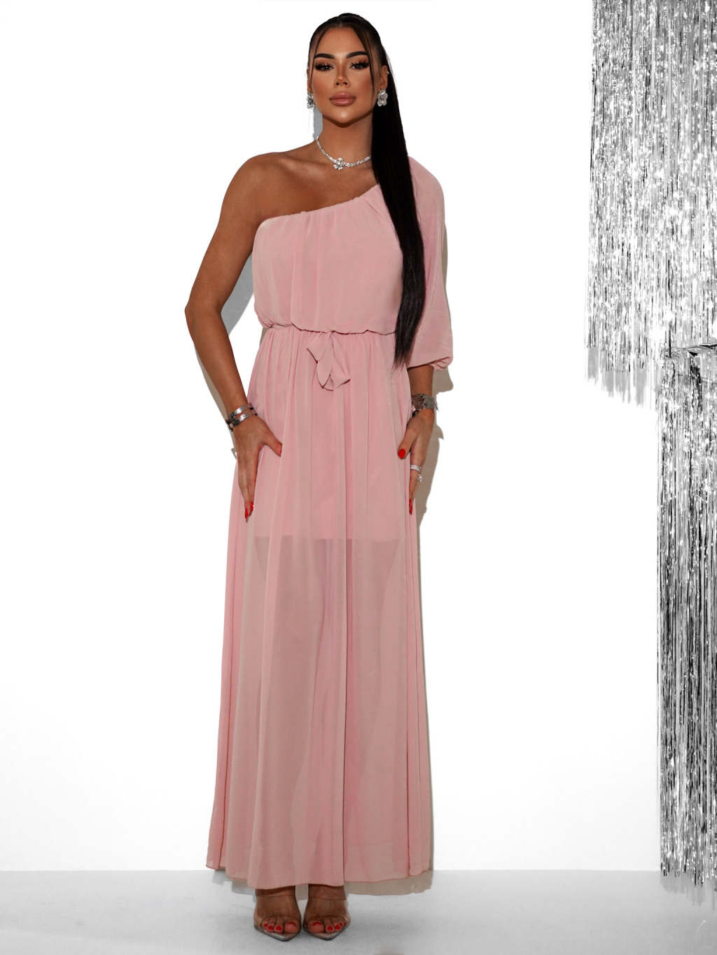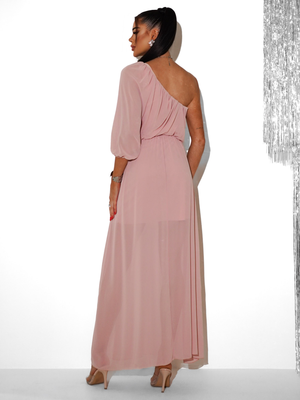 Svetloružové dlhé asymetrické šaty NAVEL