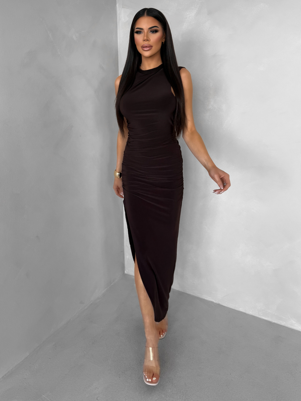 Tmavo hnedé priliehavé dlhé šaty DRAPIA